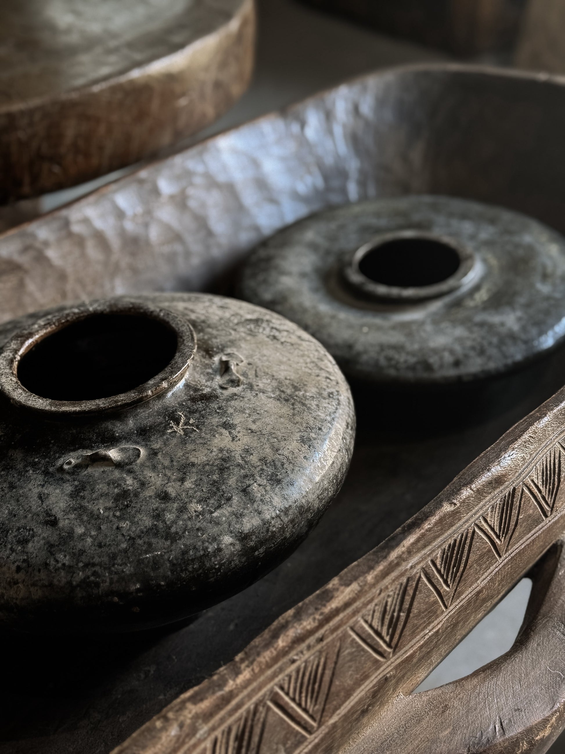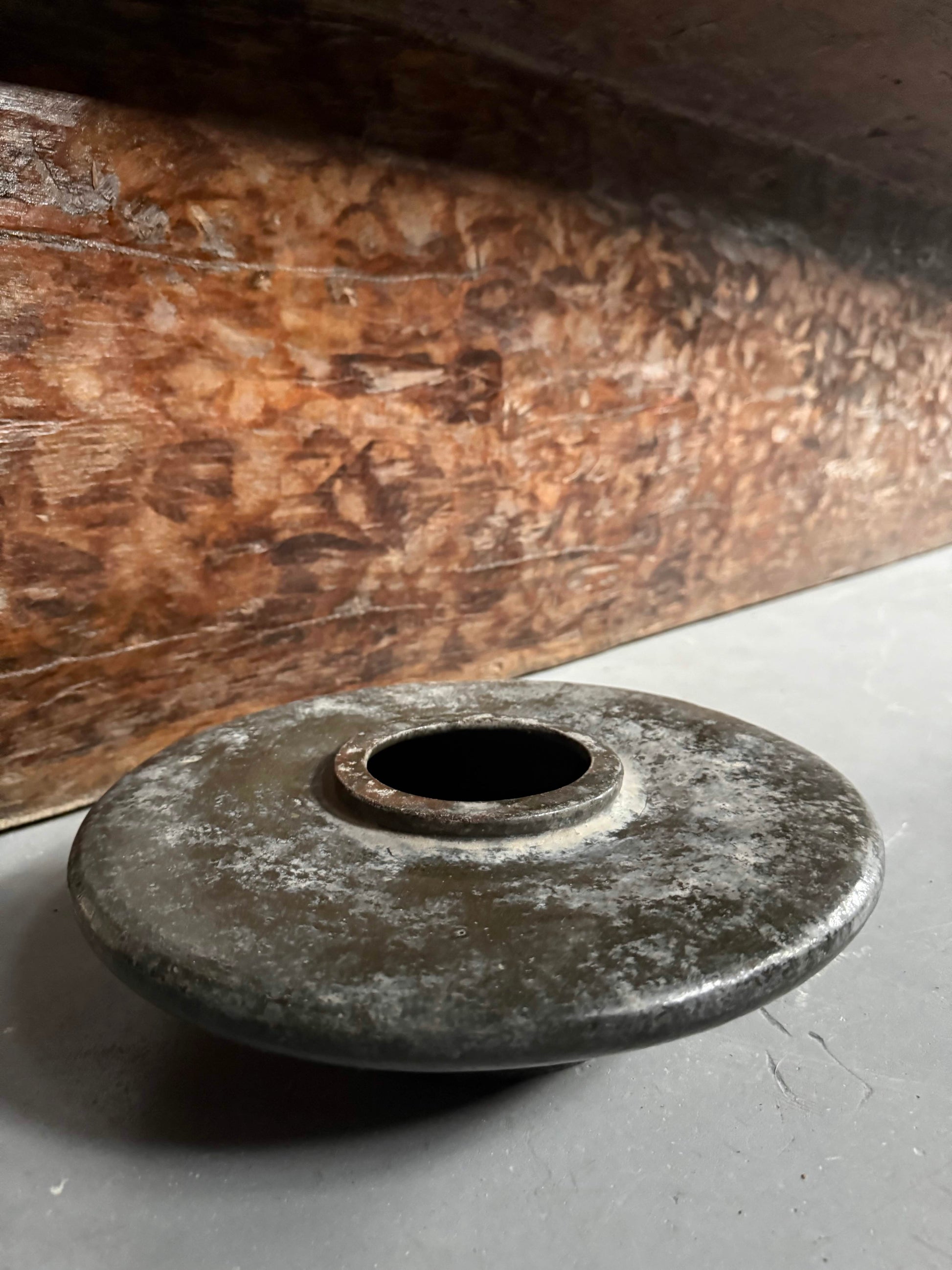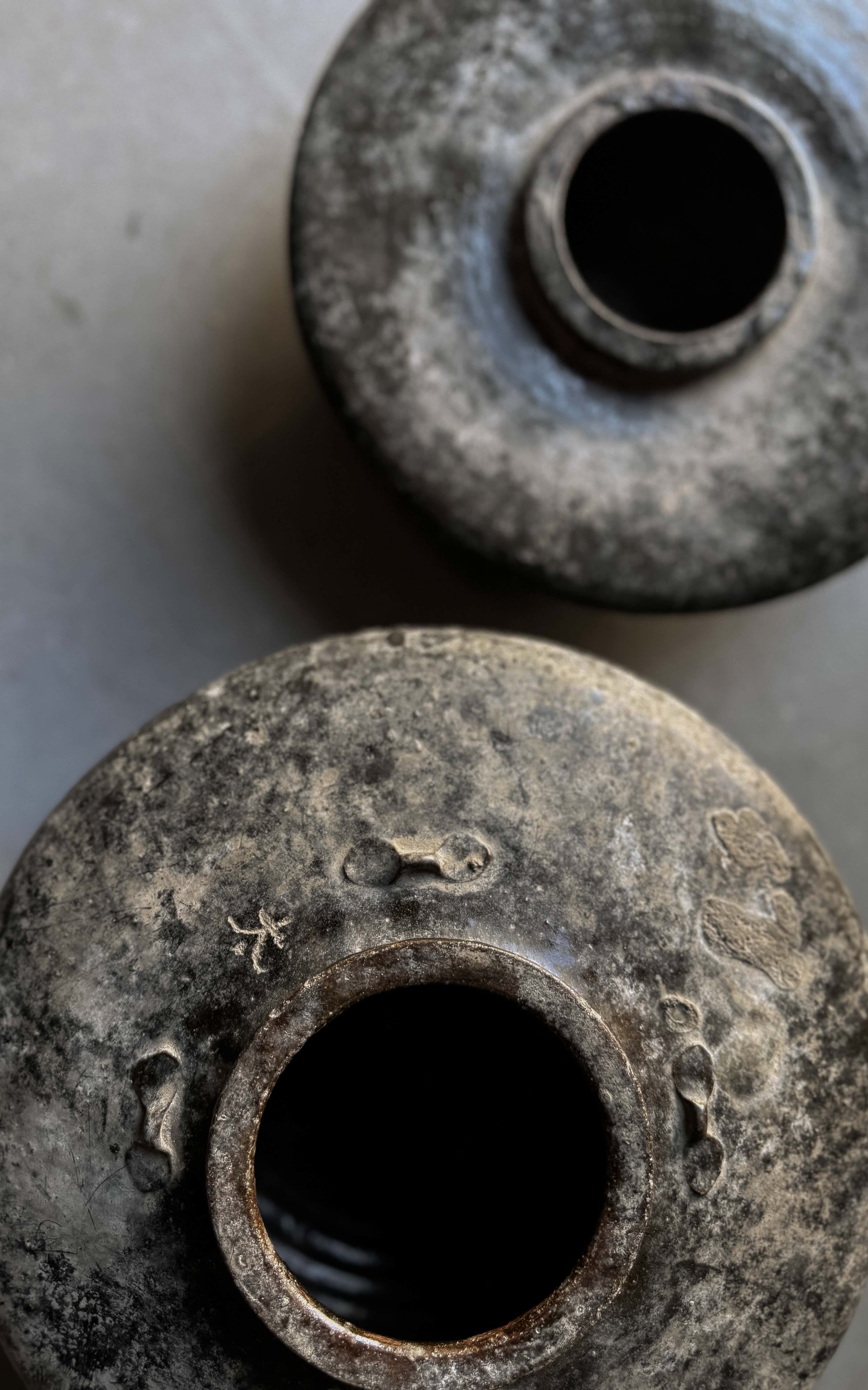 Sehr flacher Reisweintopf aus Südchina. Der Topf hat einen großen runden Körper, wirkt extrem flach. Diese Töpfe wurden so entworfen, dass sie übereinander gestapelt werden konnten. Wenn ein Kunde den Reiswein probieren wollte, löffelte der Ladenbesitzer ihm einfach etwas davon zum Probieren heraus.