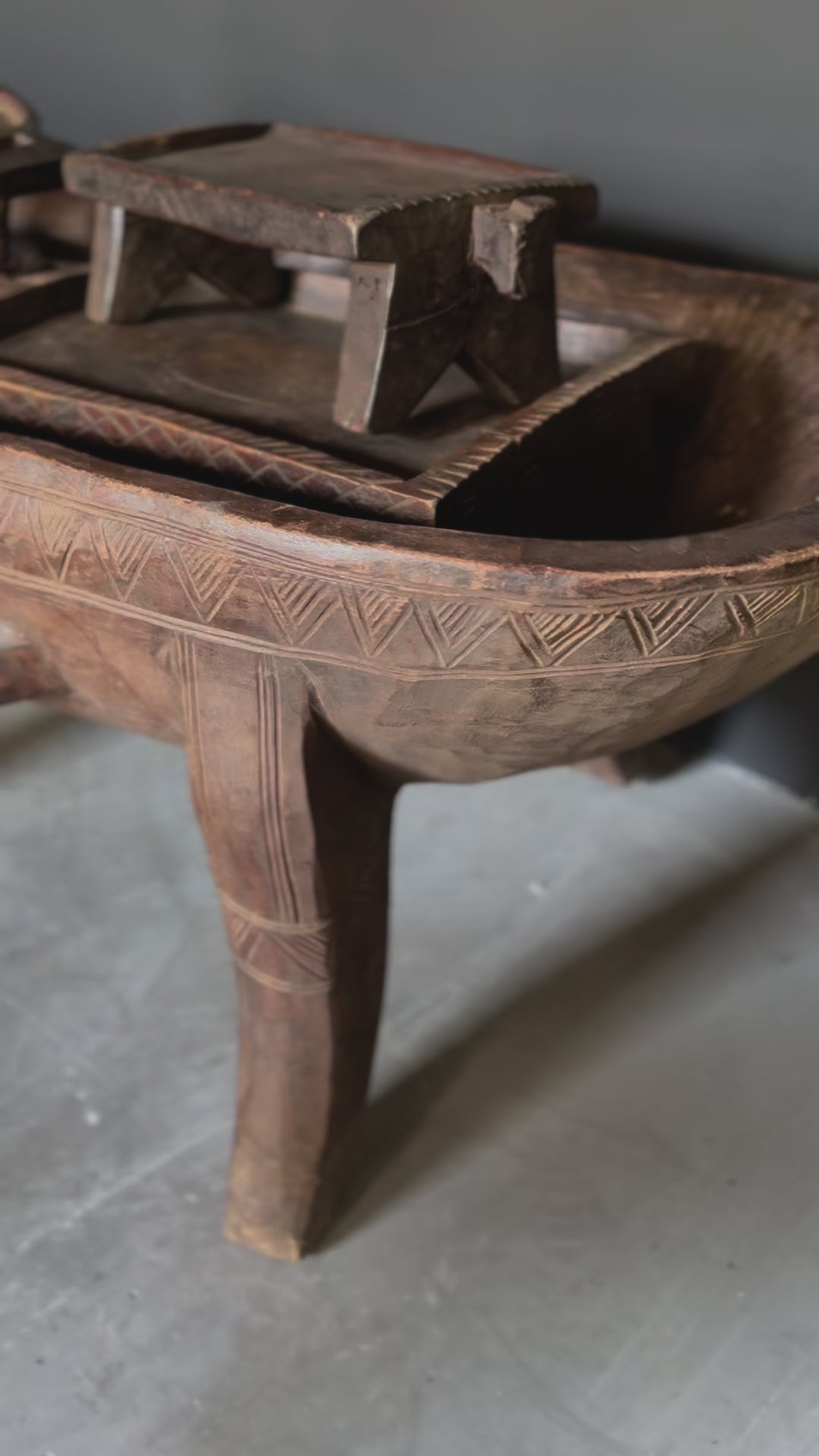 From carved African stools to Chinese doors repurposed into coffee tables, woven basket tables from South Africa, monumental wooden pieces from Nagaland in India, and contemporary pieces crafted in Indonesia — each object carries the trace of hand and time.