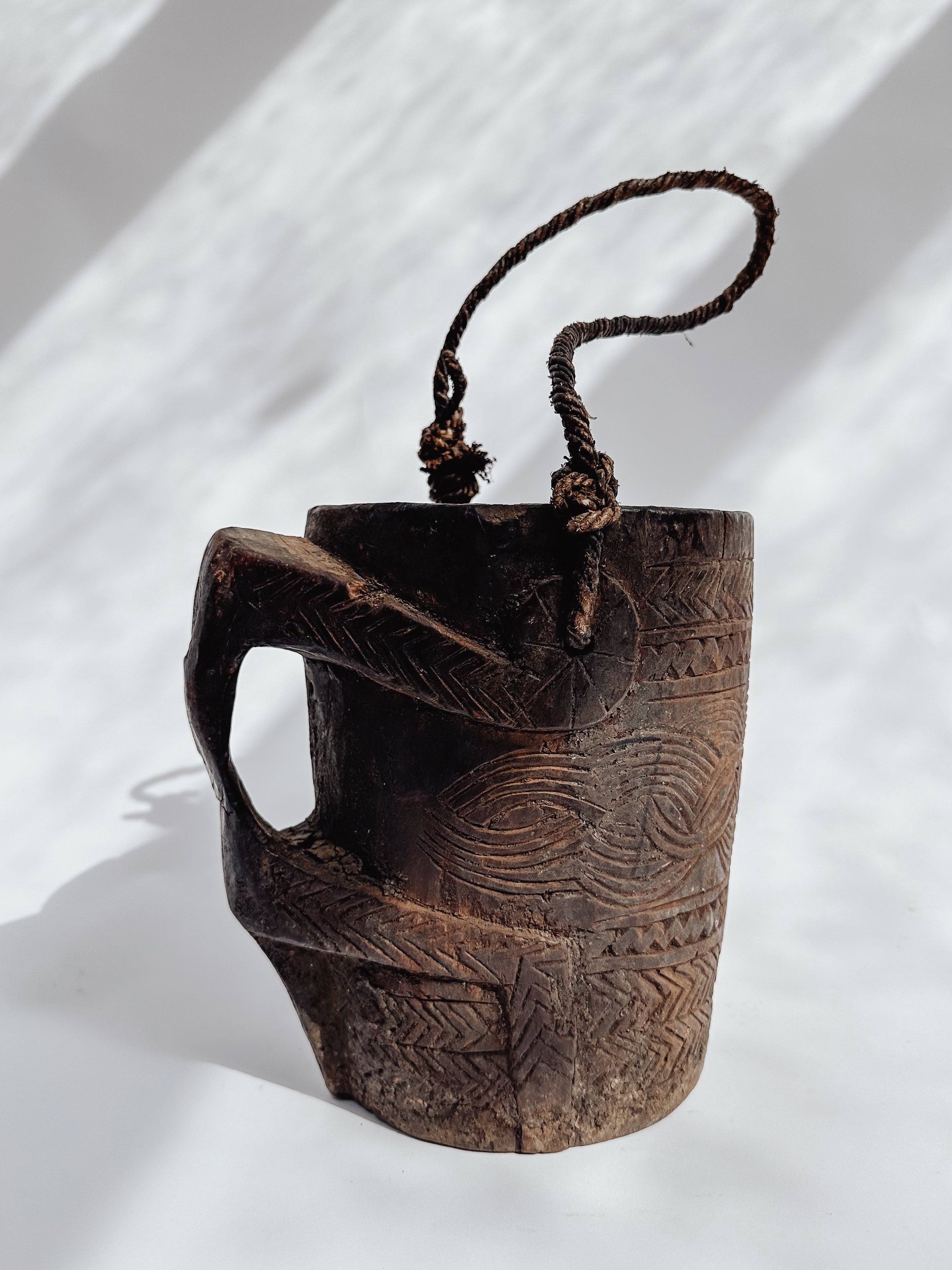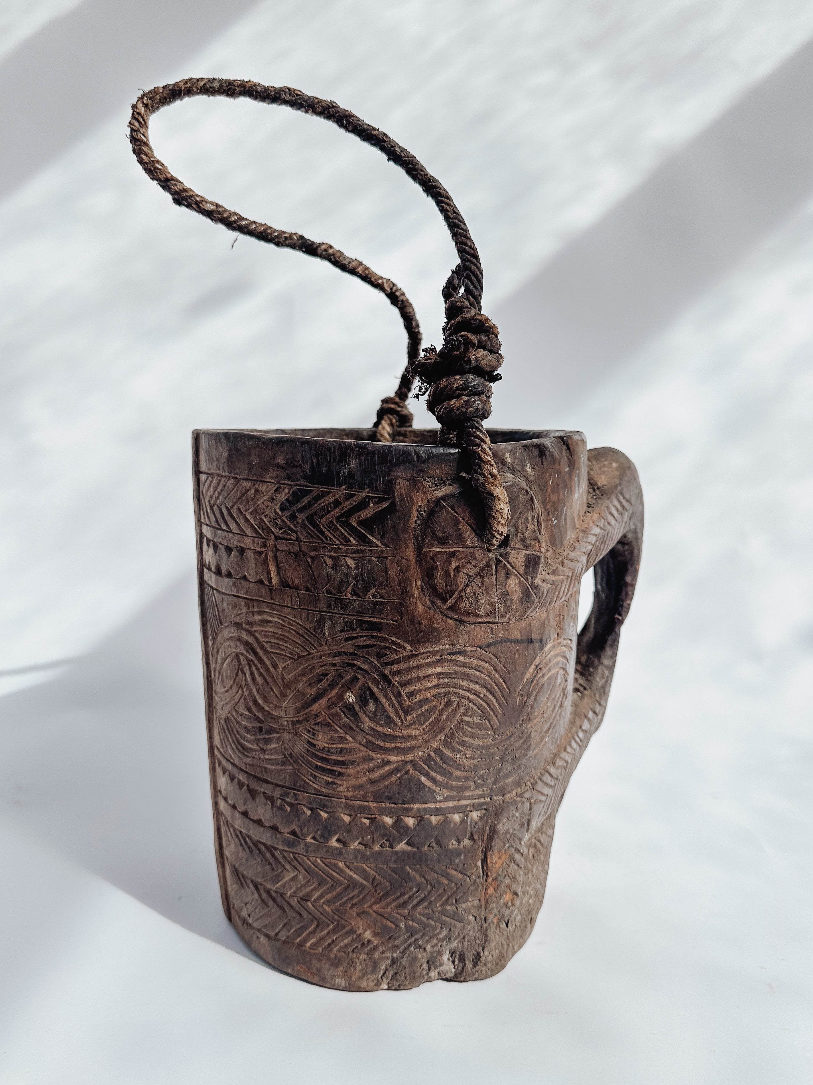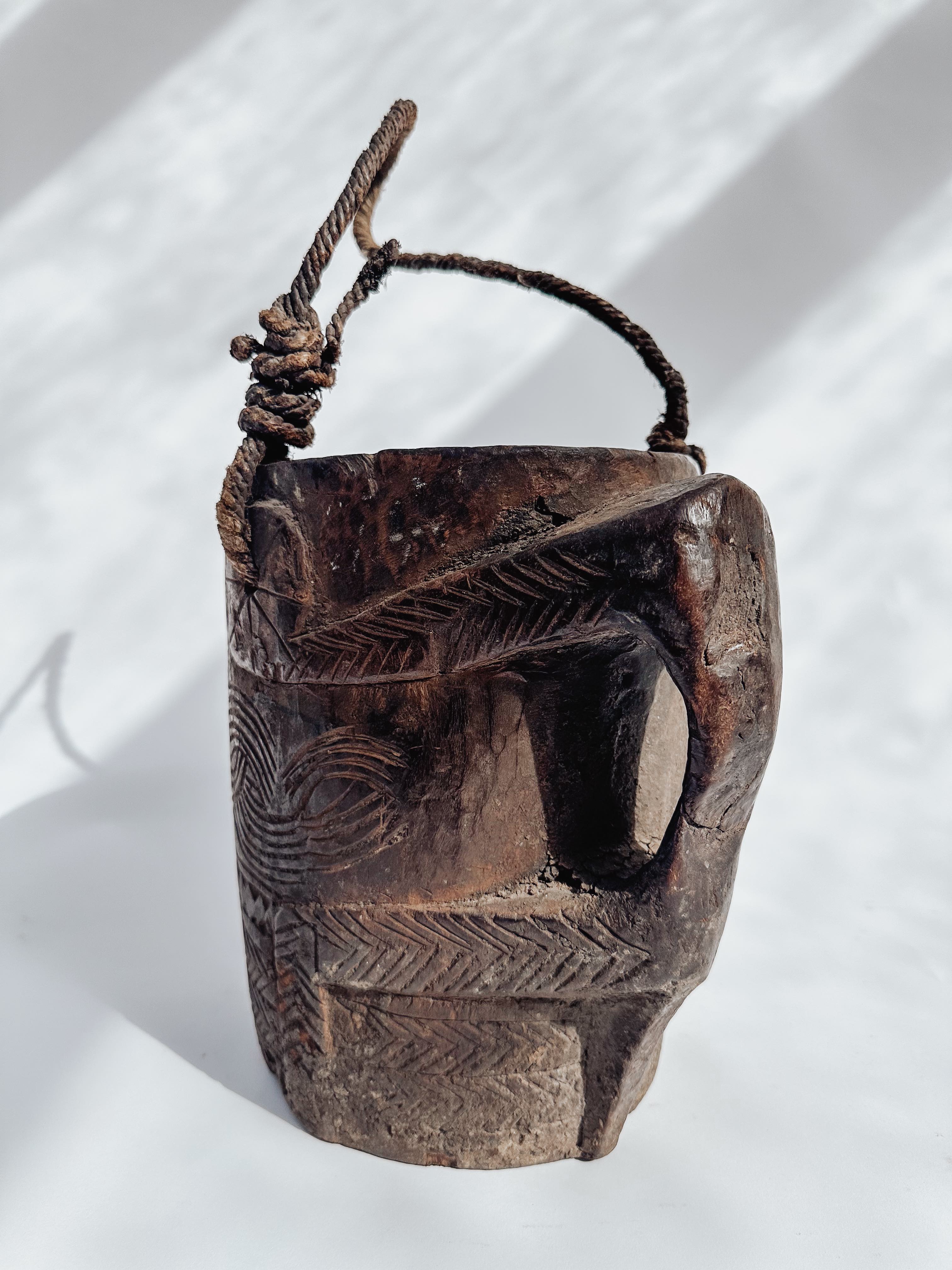 Old container used for storing milk in the Himachal region. With elaborate carvings. A wonderful patina has developed over time and makes each container unique.