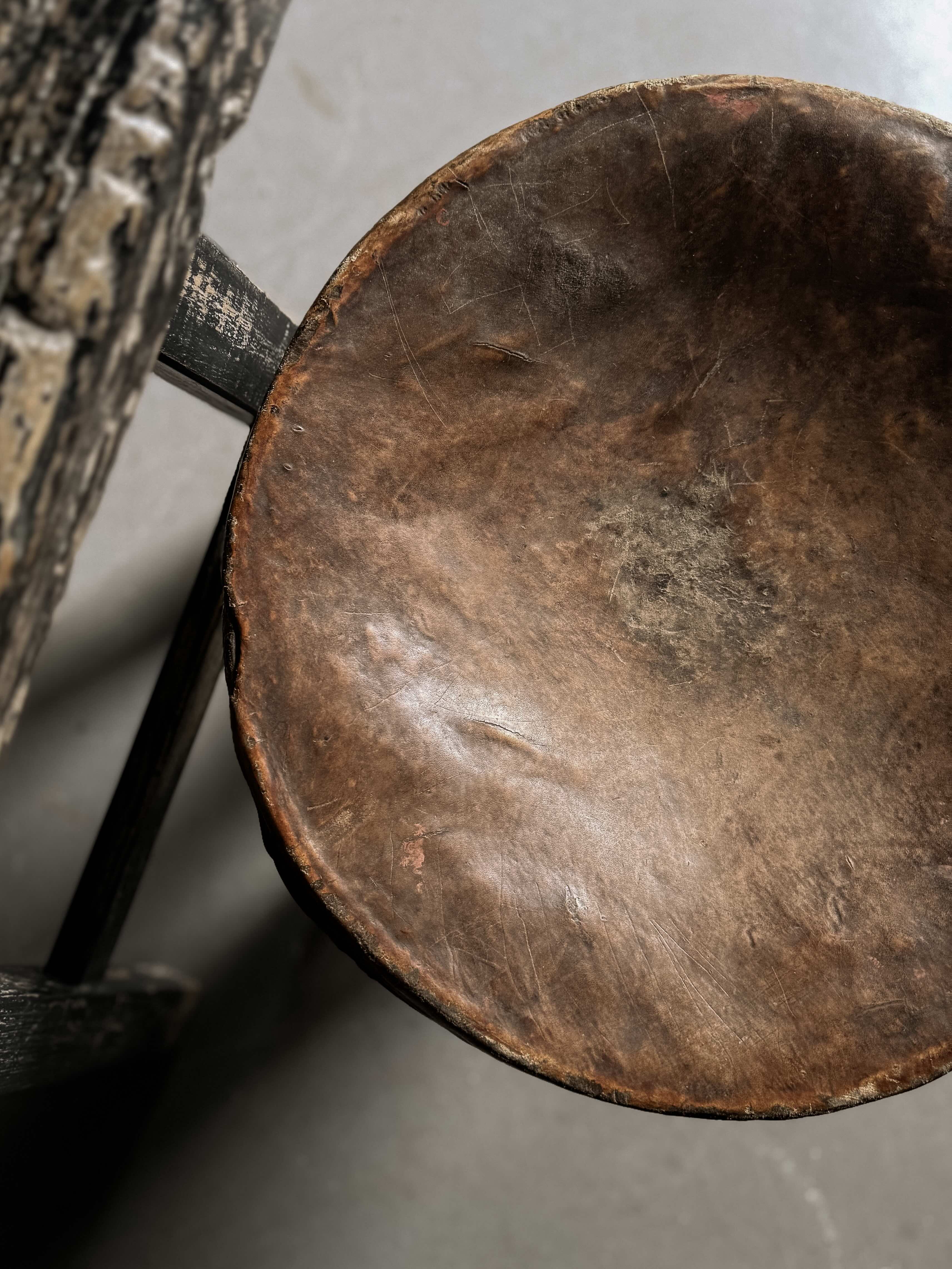 What makes this piece truly special is its rare leather-covered seat, an uncommon feature that elevates its tactile and visual appeal. The leather adds warmth and softness, transforming the simple stool into an object of quiet refinement.