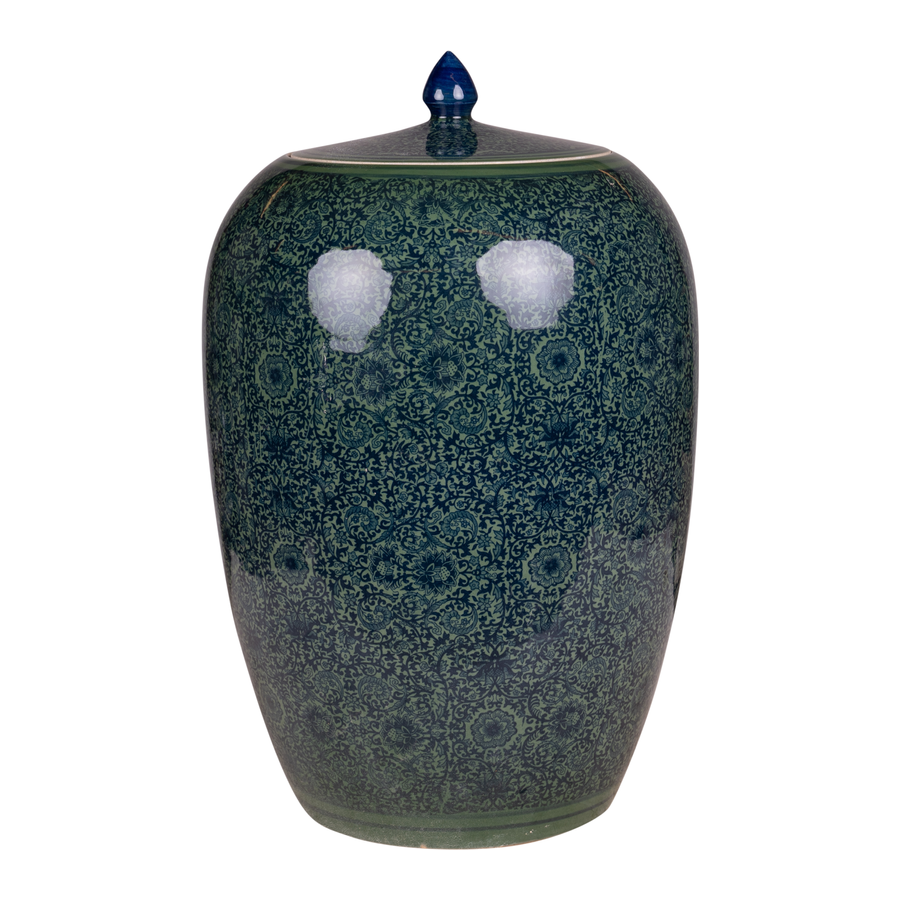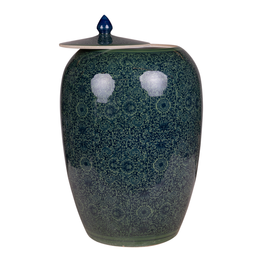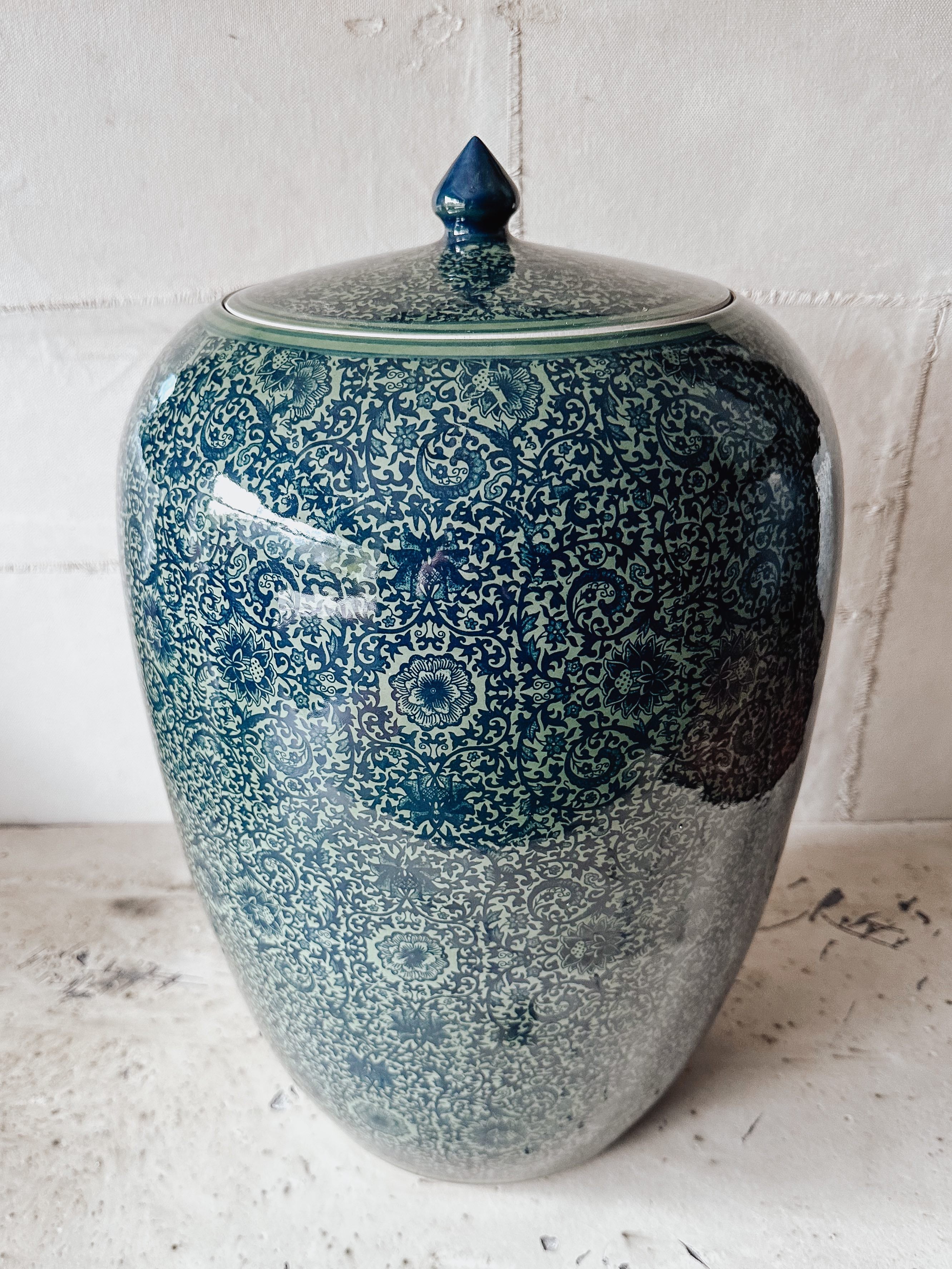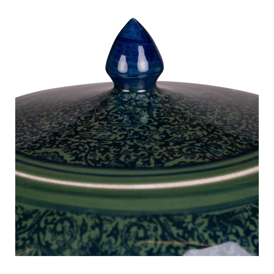 Beautiful, hand-painted porcelain vase in blue-green. With lid.