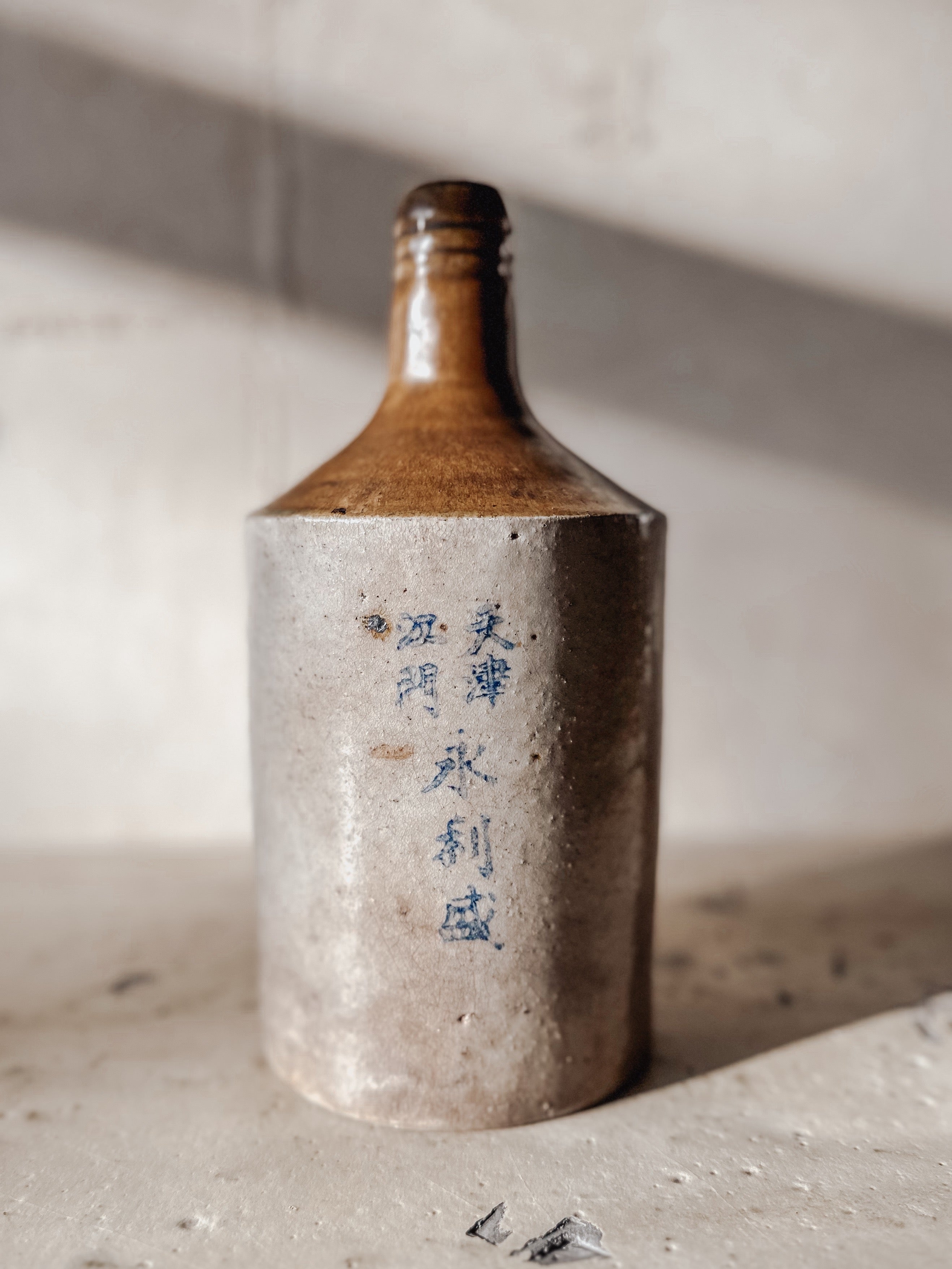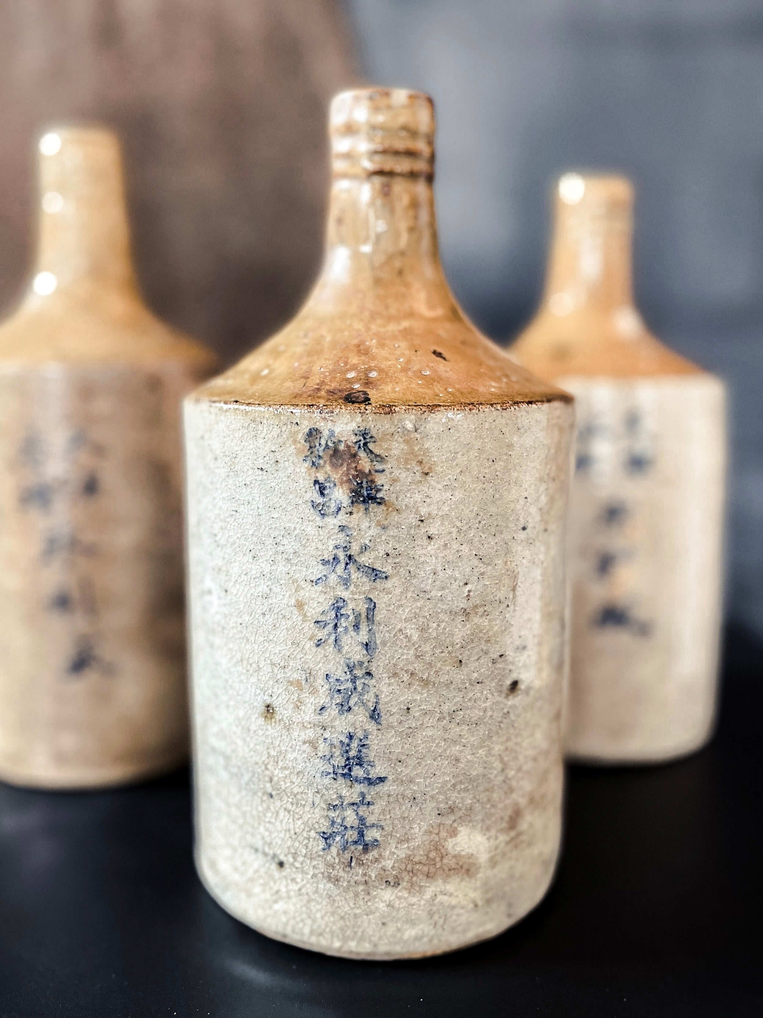 Alte Reisweinflaschen aus Steingut einer Hongkonger Brauerei, gerades Modell mit schmalem Hals und schmaler Mündung.