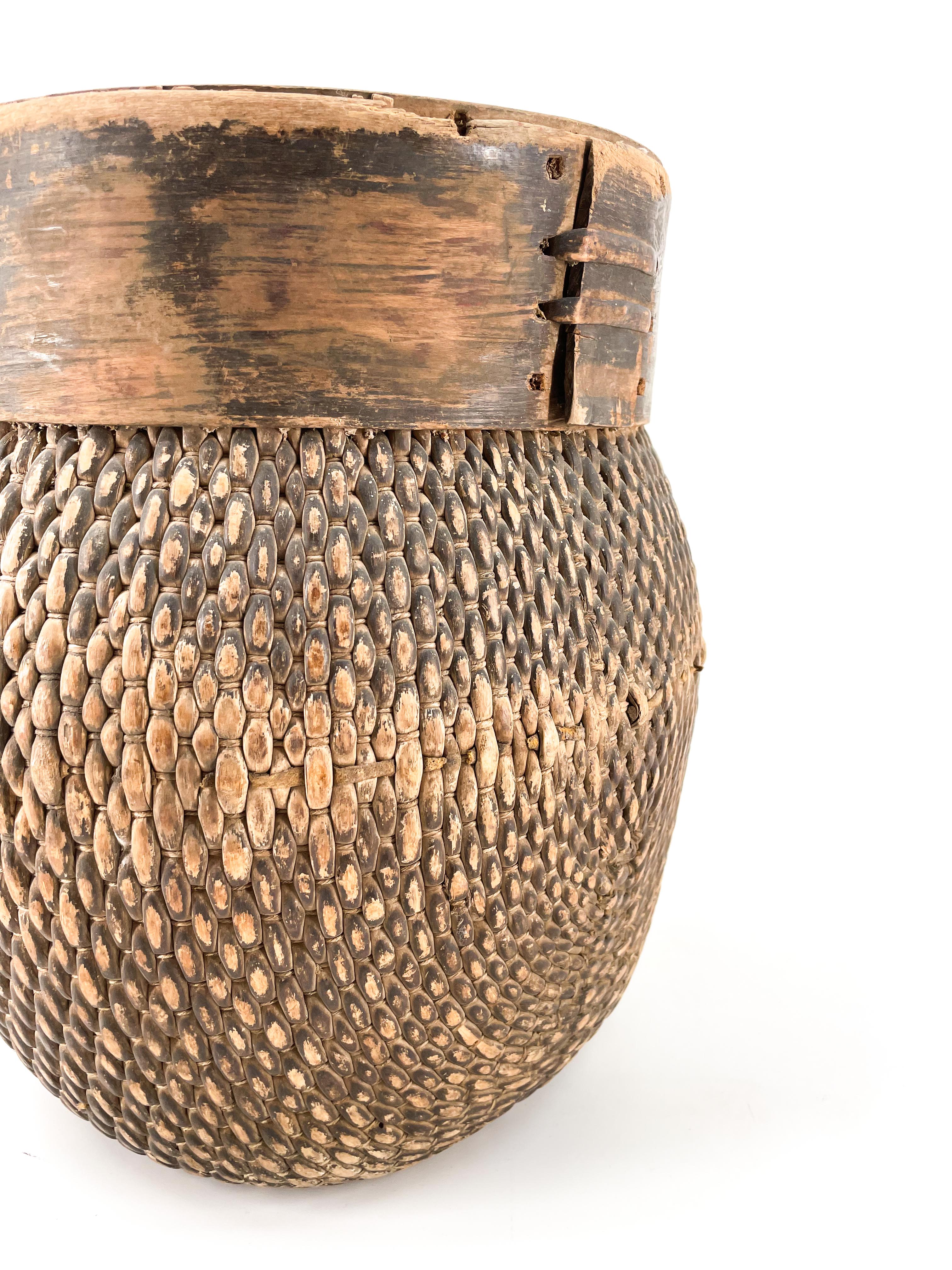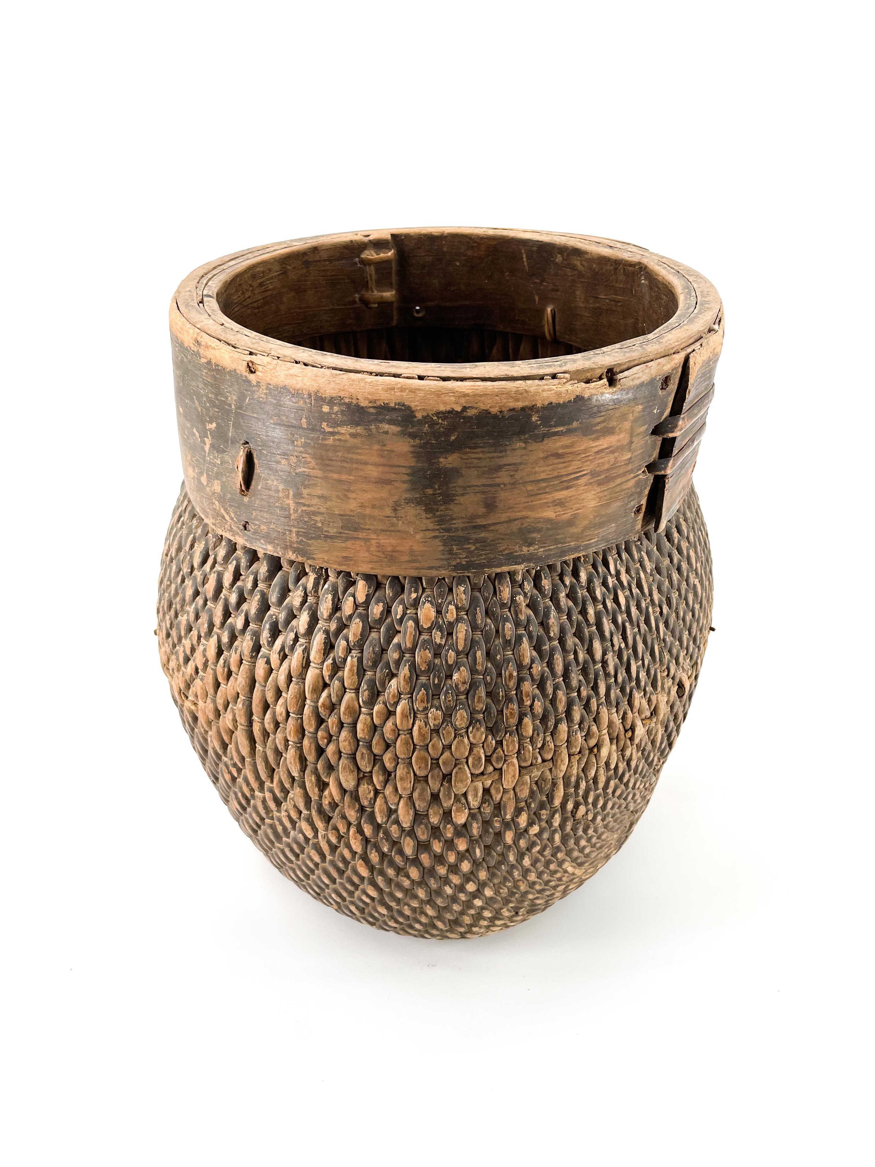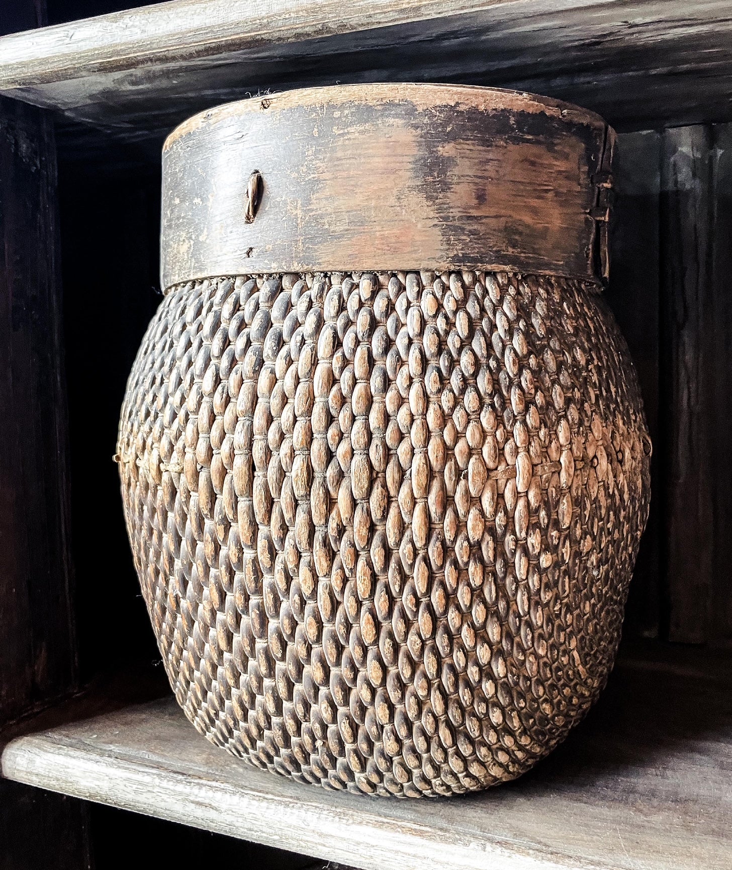 Dieser alte Rattan-Korb aus dem 19. Jahrhundert wurde ursprünglich unter Fischern verwendet. Er ist heute ein wunderschönes Accessoire, um Trockenblumen in Szene zu setzen. Der Korb ist aber auch allein ein einzigartiger Blickfang.