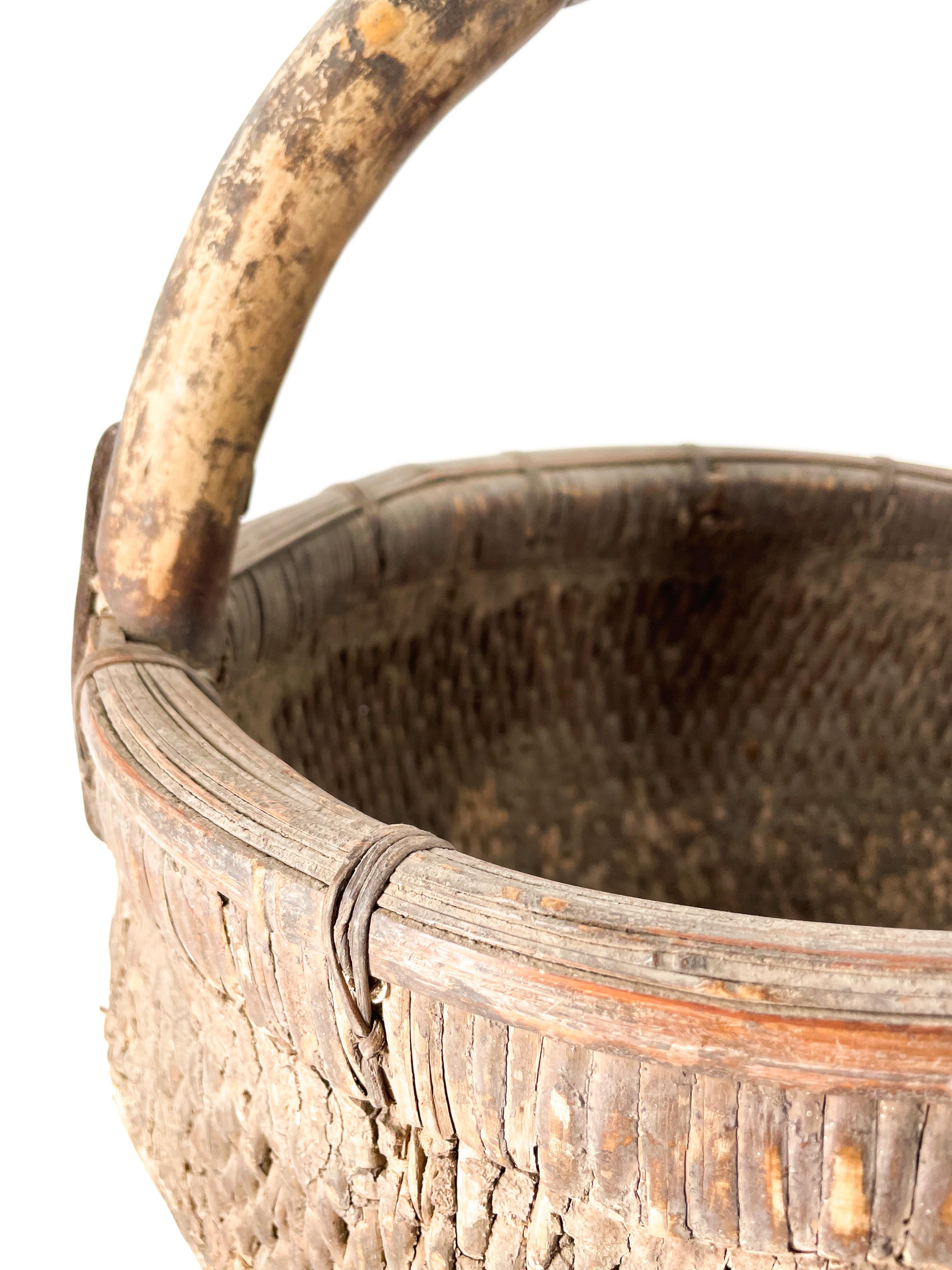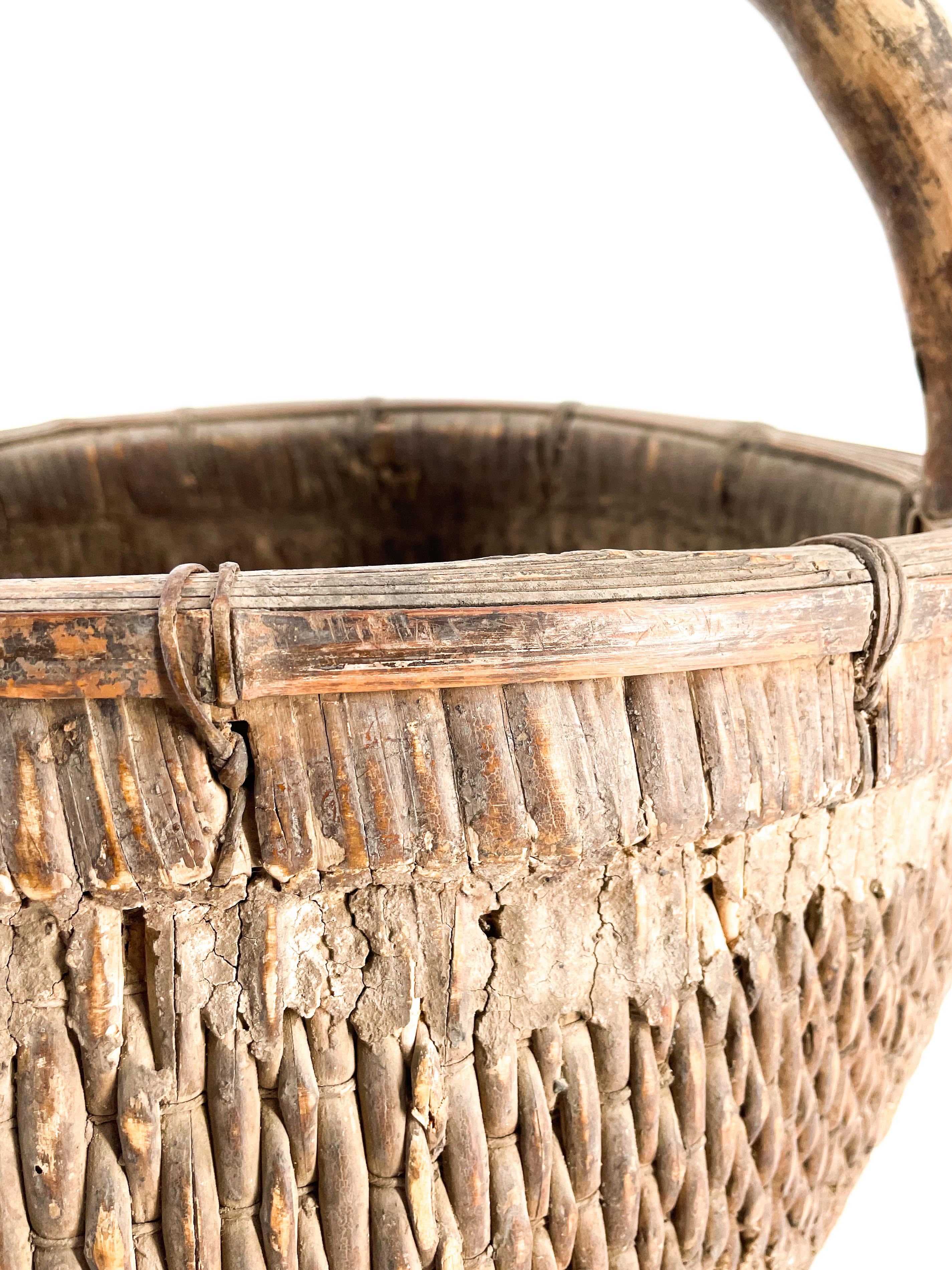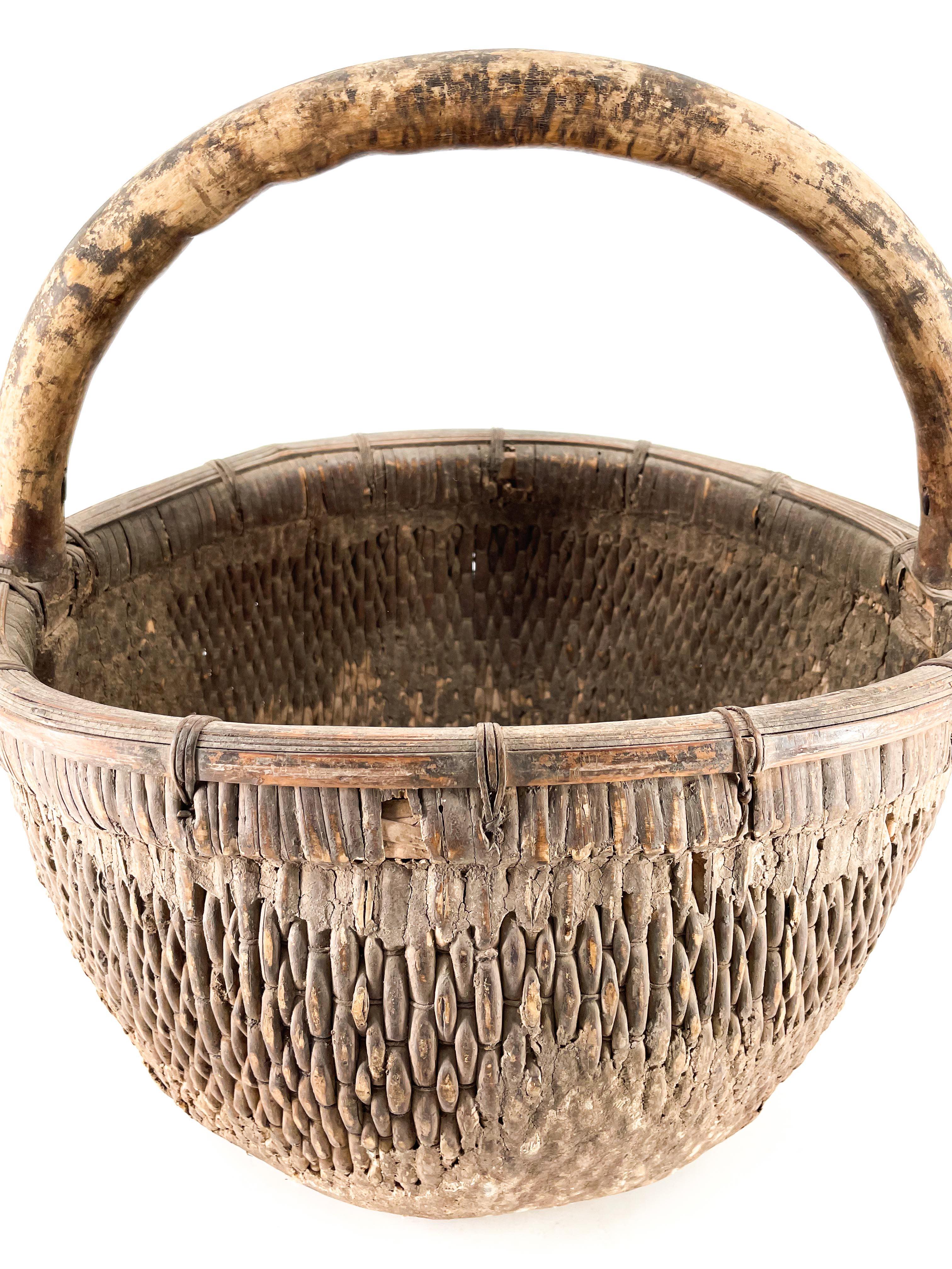 Alter chinesischer geflochtener Weidenkorb mit Ton. Wunderschön abgenutzt und mit über 100 Jahren Gebrauchsspuren.
