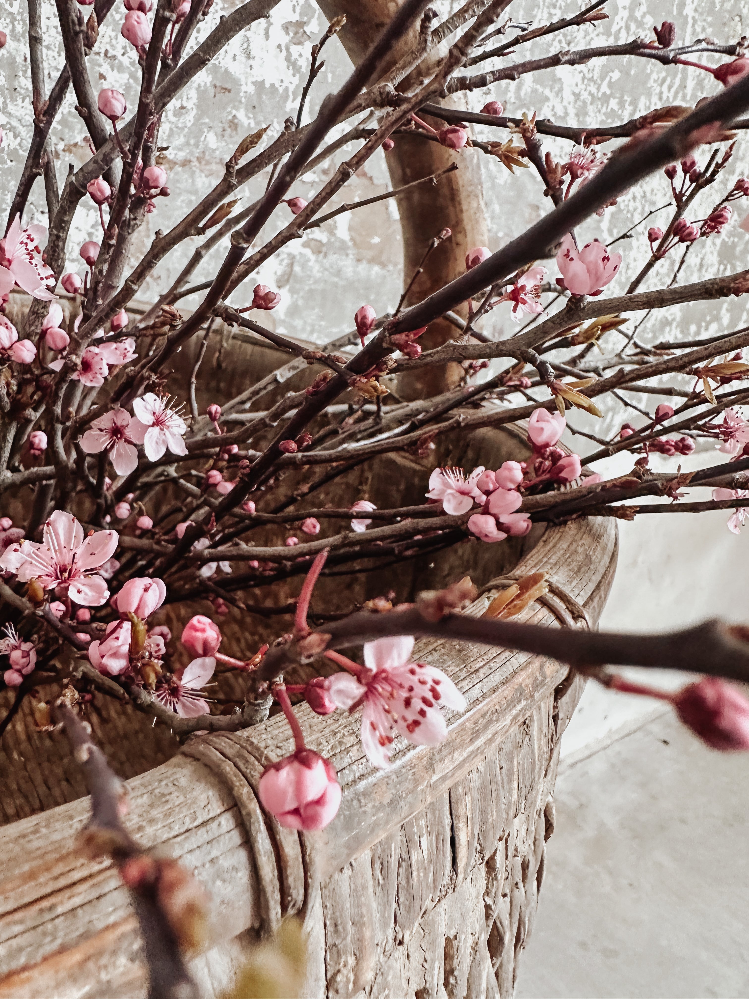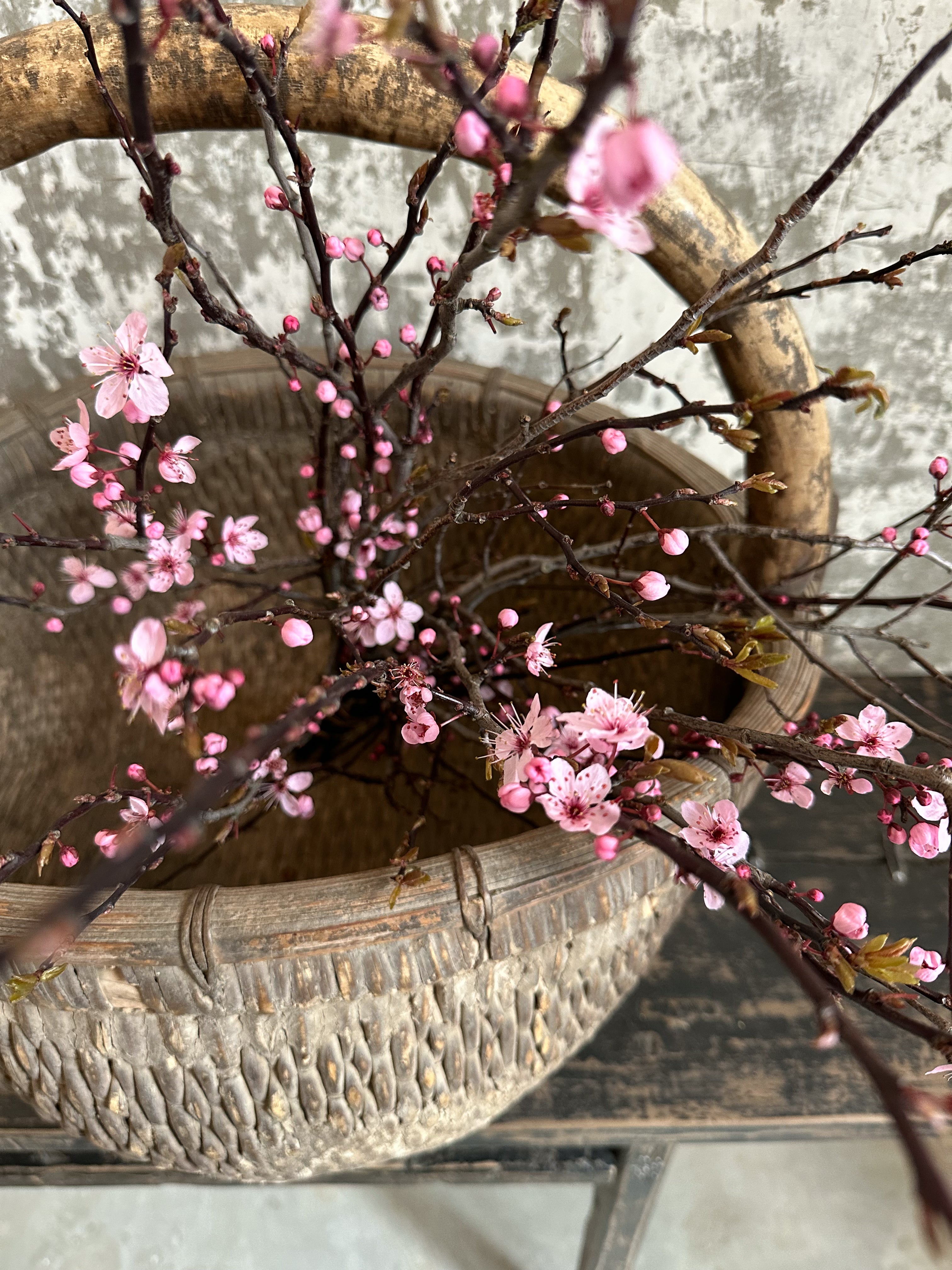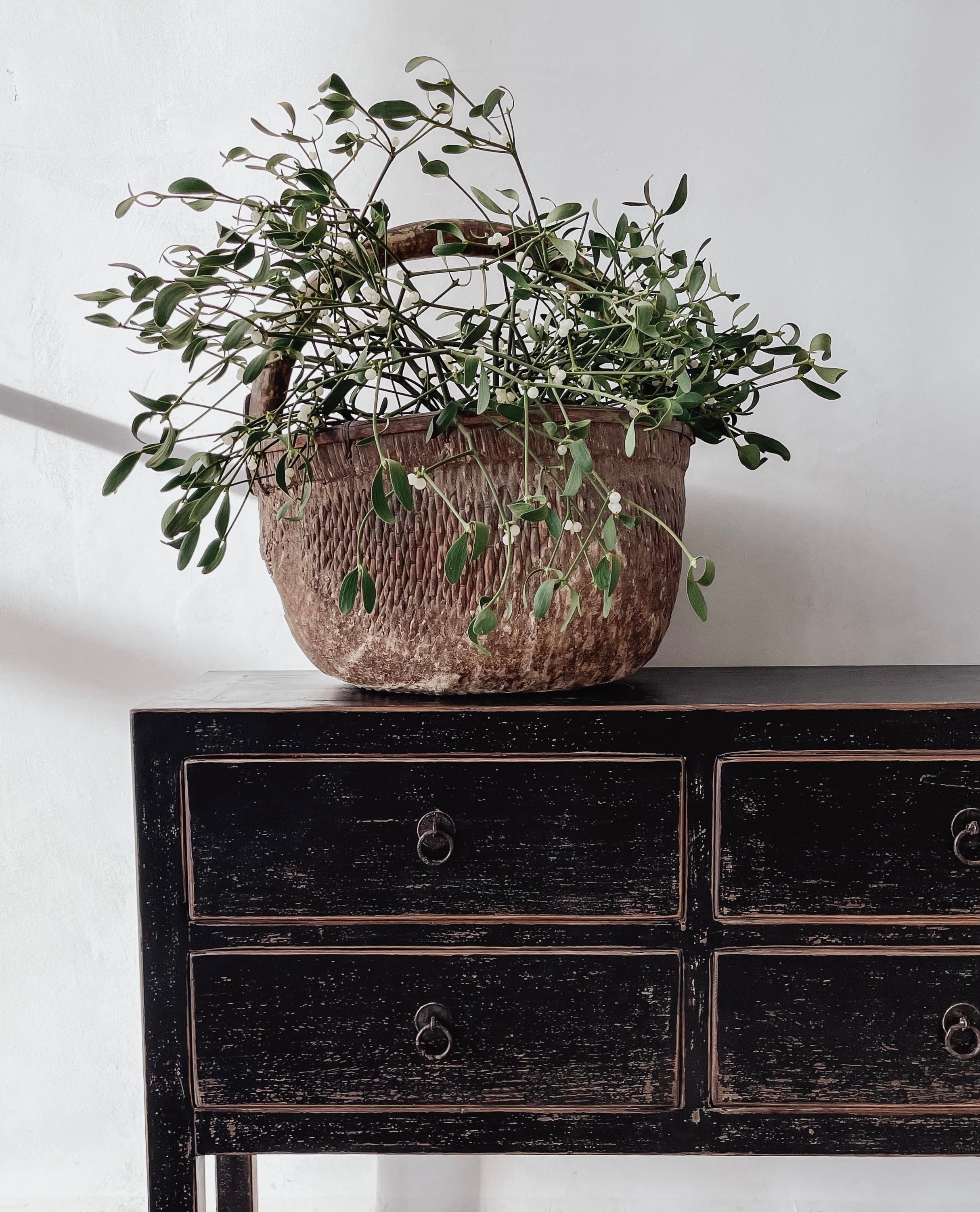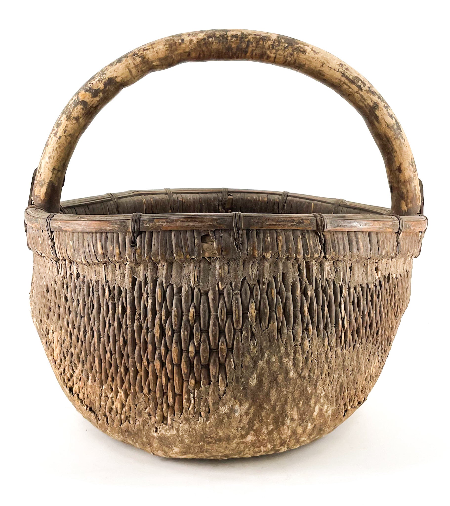 Alter chinesischer geflochtener Weidenkorb mit Ton. Wunderschön abgenutzt und mit über 100 Jahren Gebrauchsspuren.