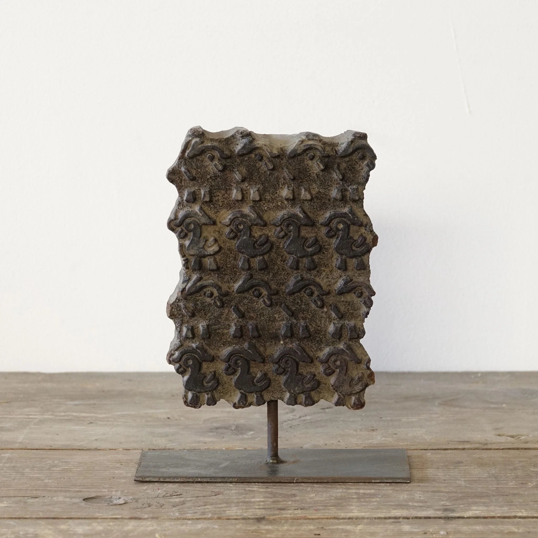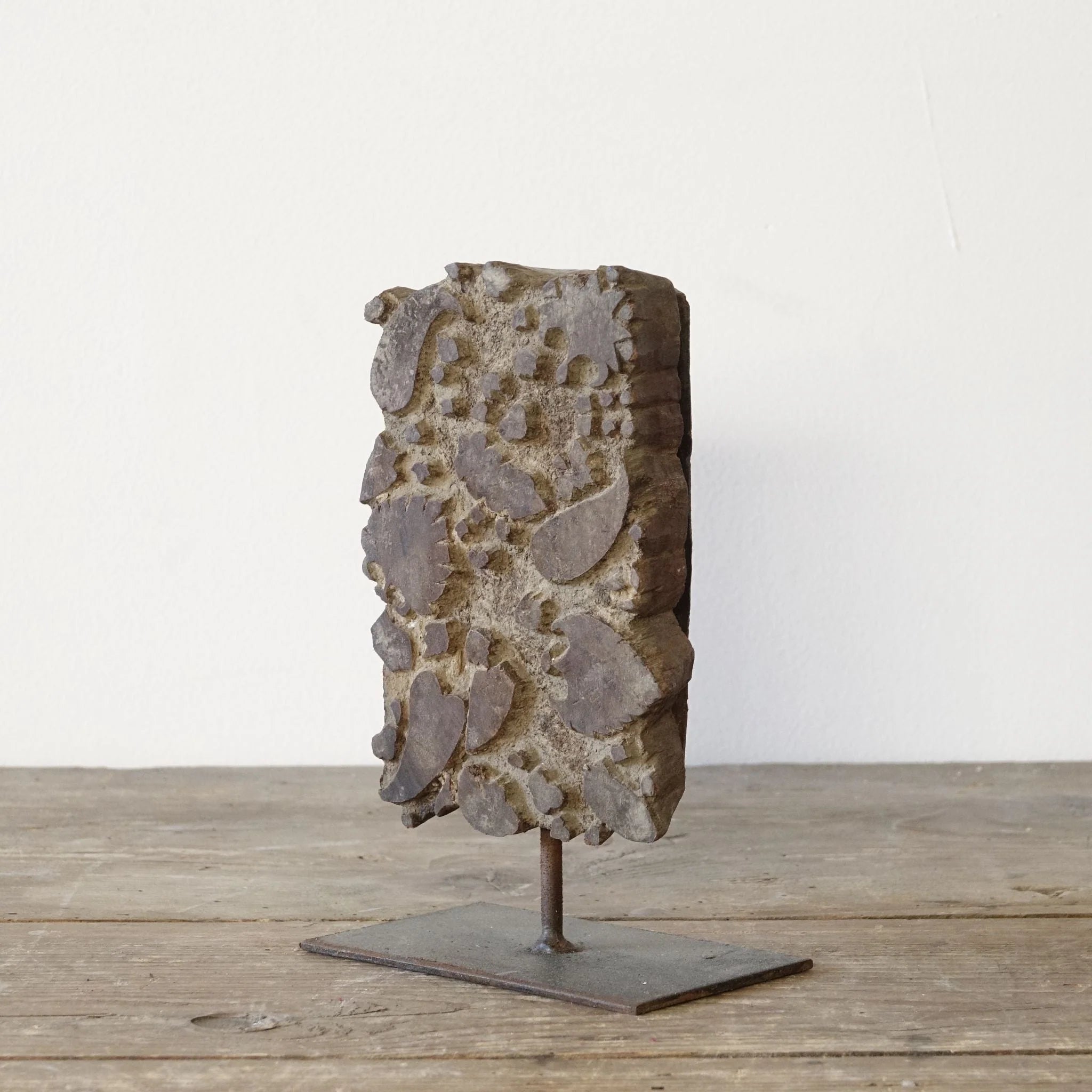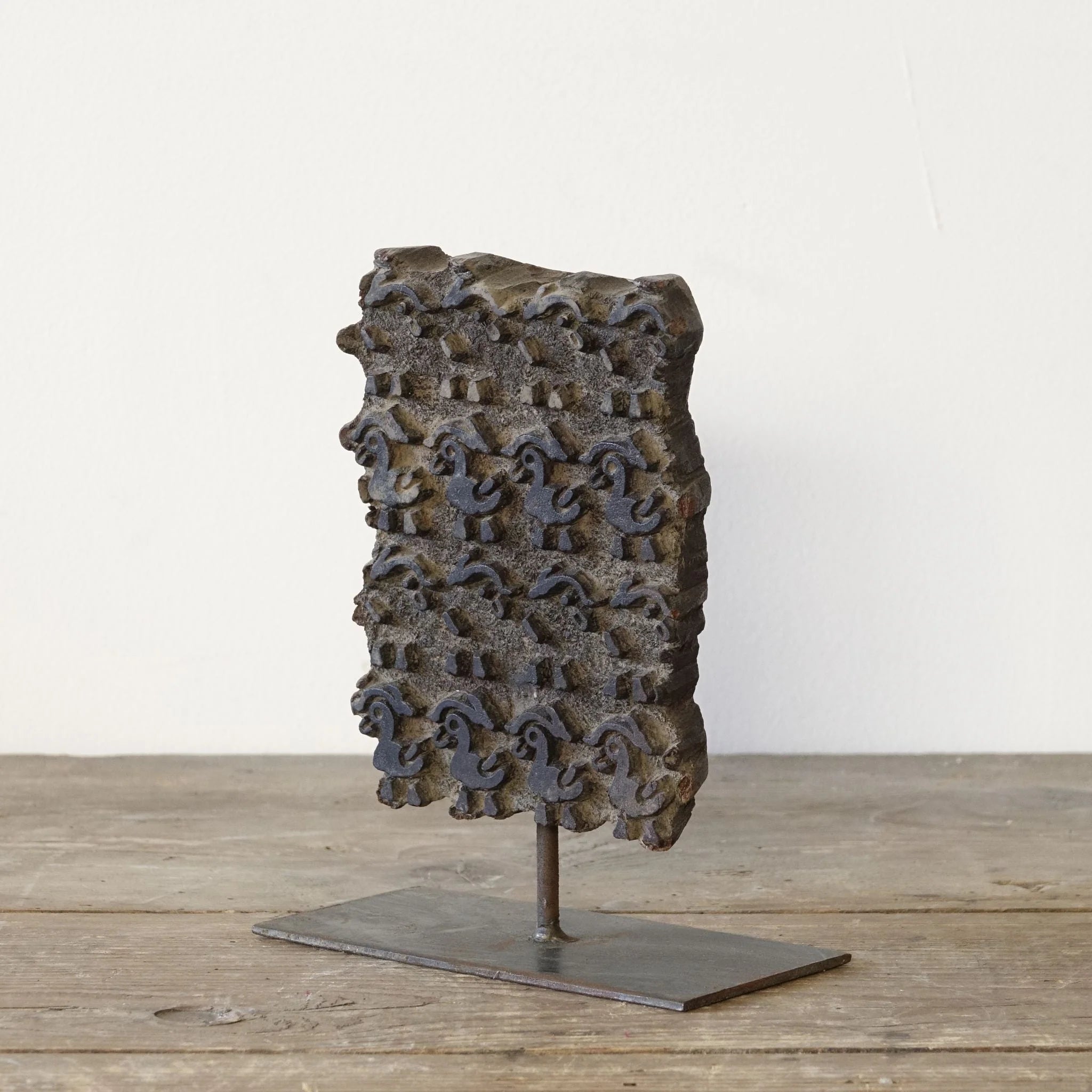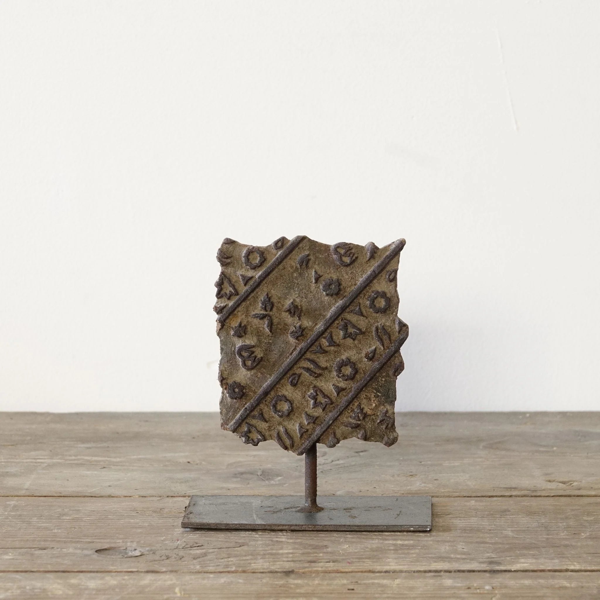 Dieser Blockstempel ist ein altes Original und ein Zeuge der Zeit. Jedes Stück ist ein Unikat. Auf einem Sockel aus Eisen montiert.
