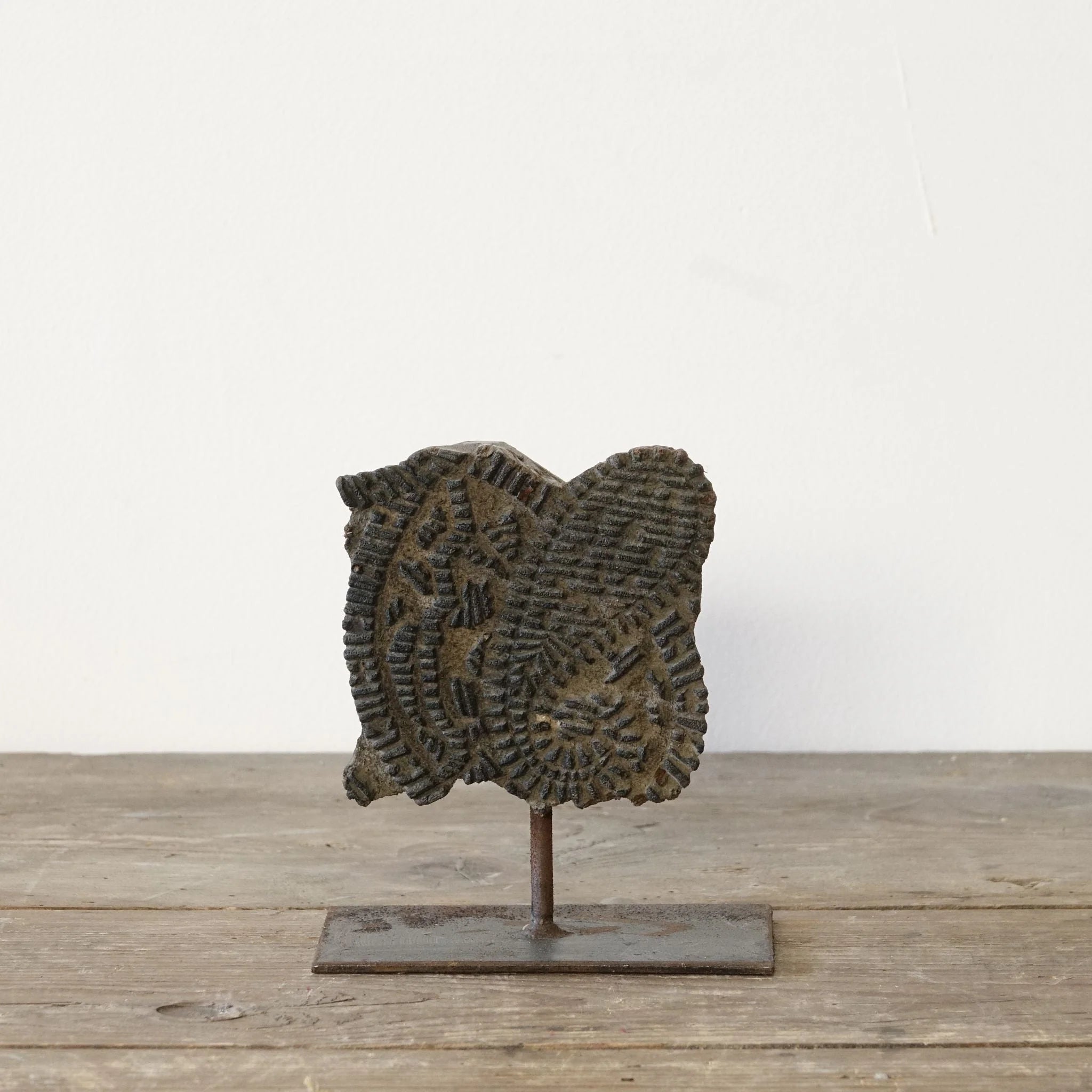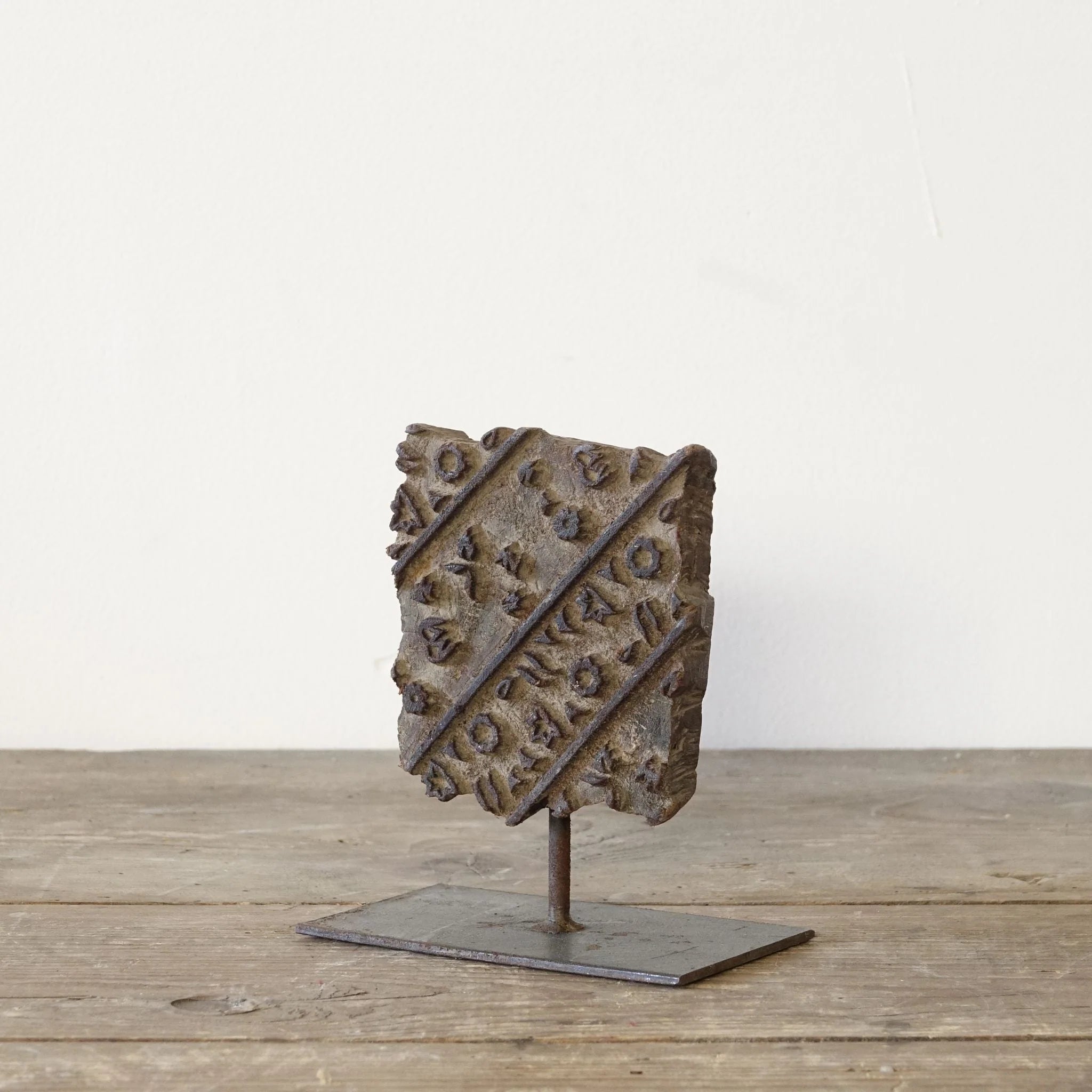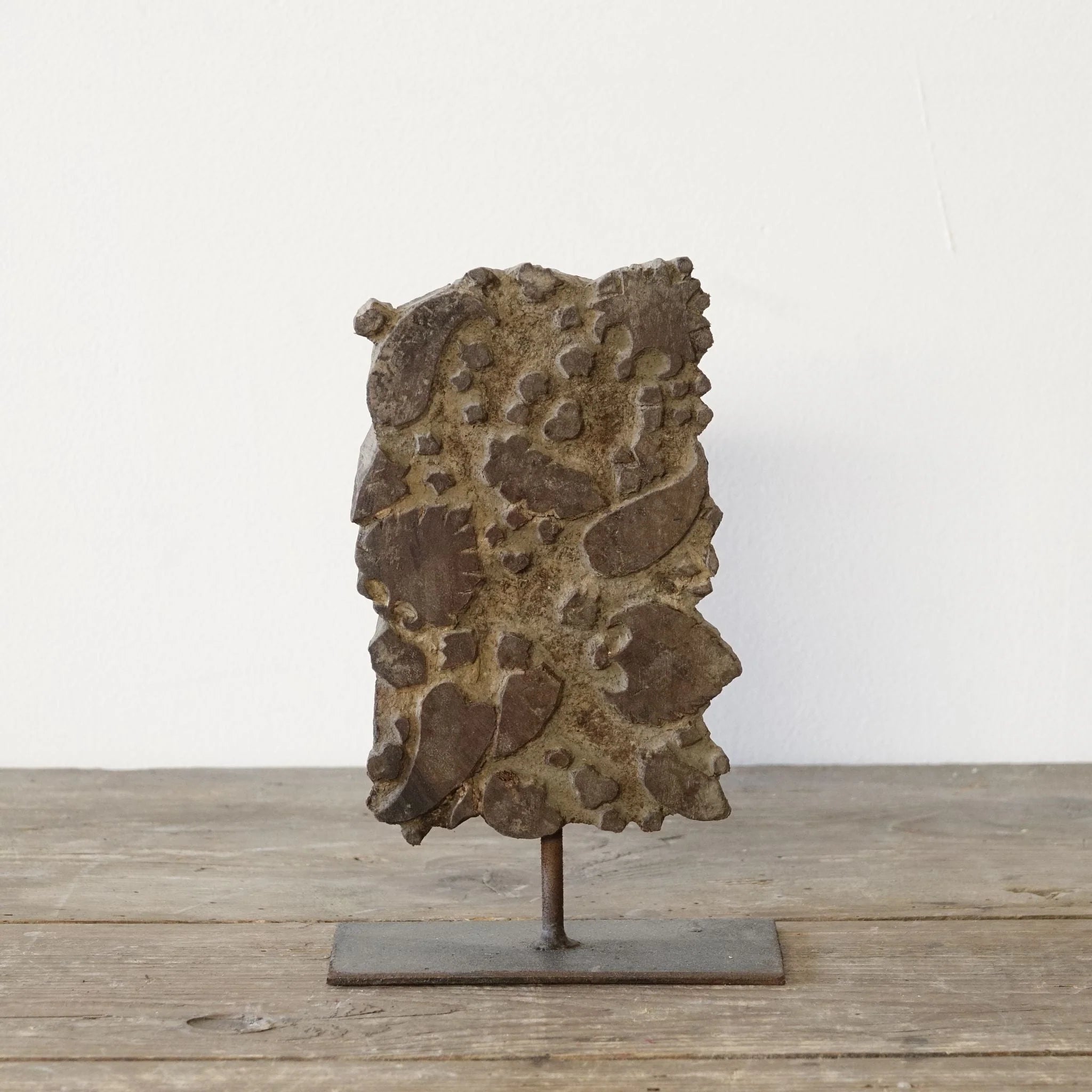 Dieser Blockstempel ist ein altes Original und ein Zeuge der Zeit. Jedes Stück ist ein Unikat. Auf einem Sockel aus Eisen montiert.