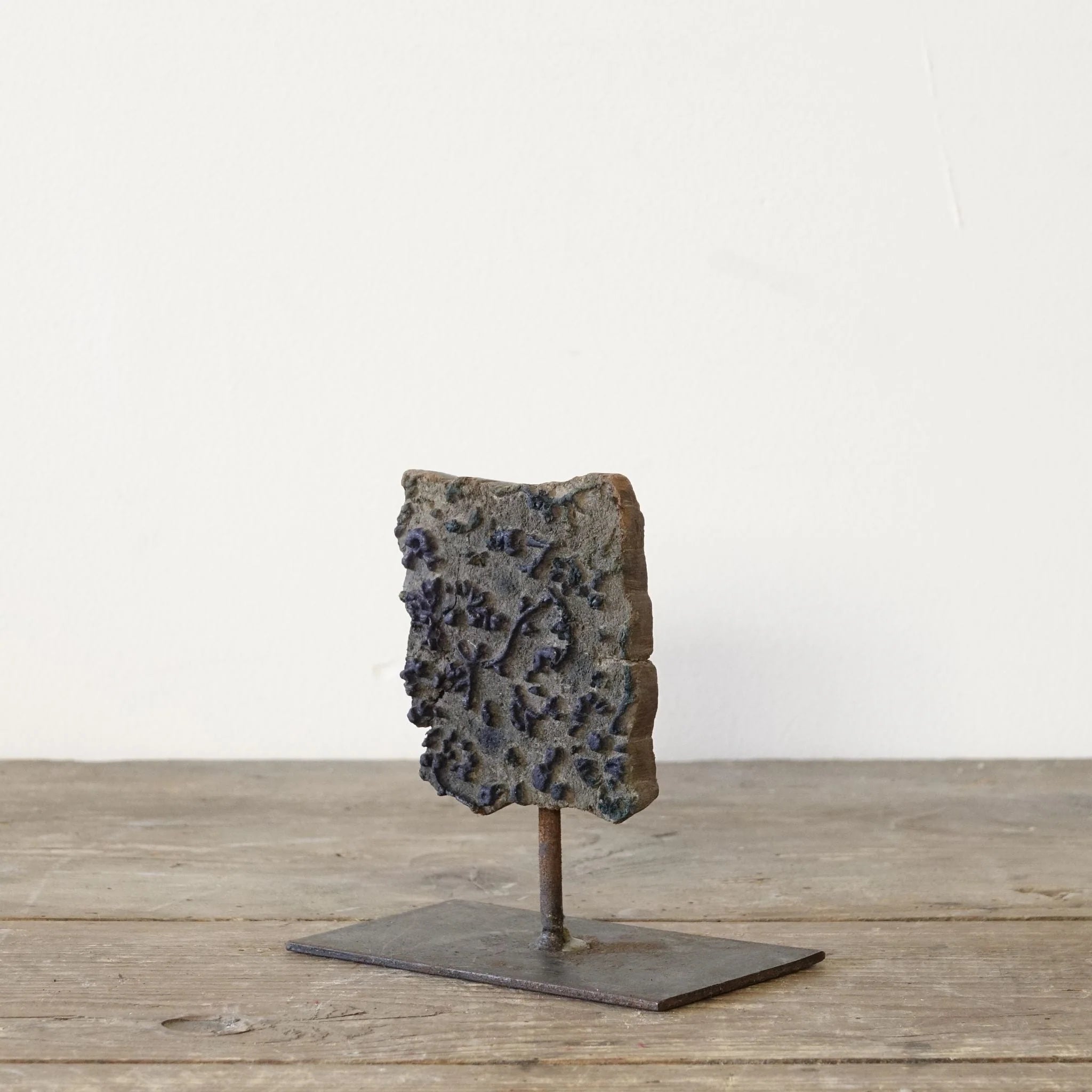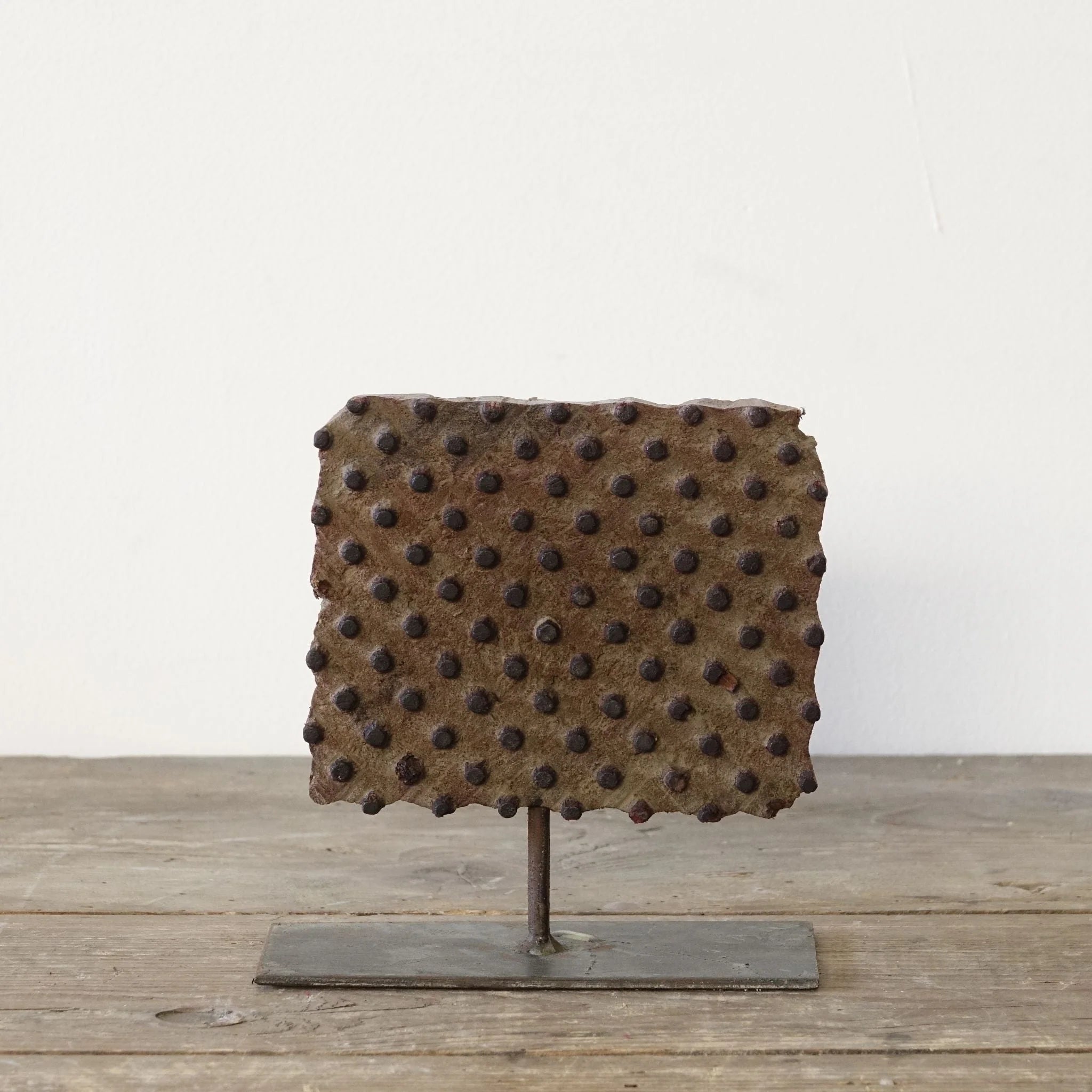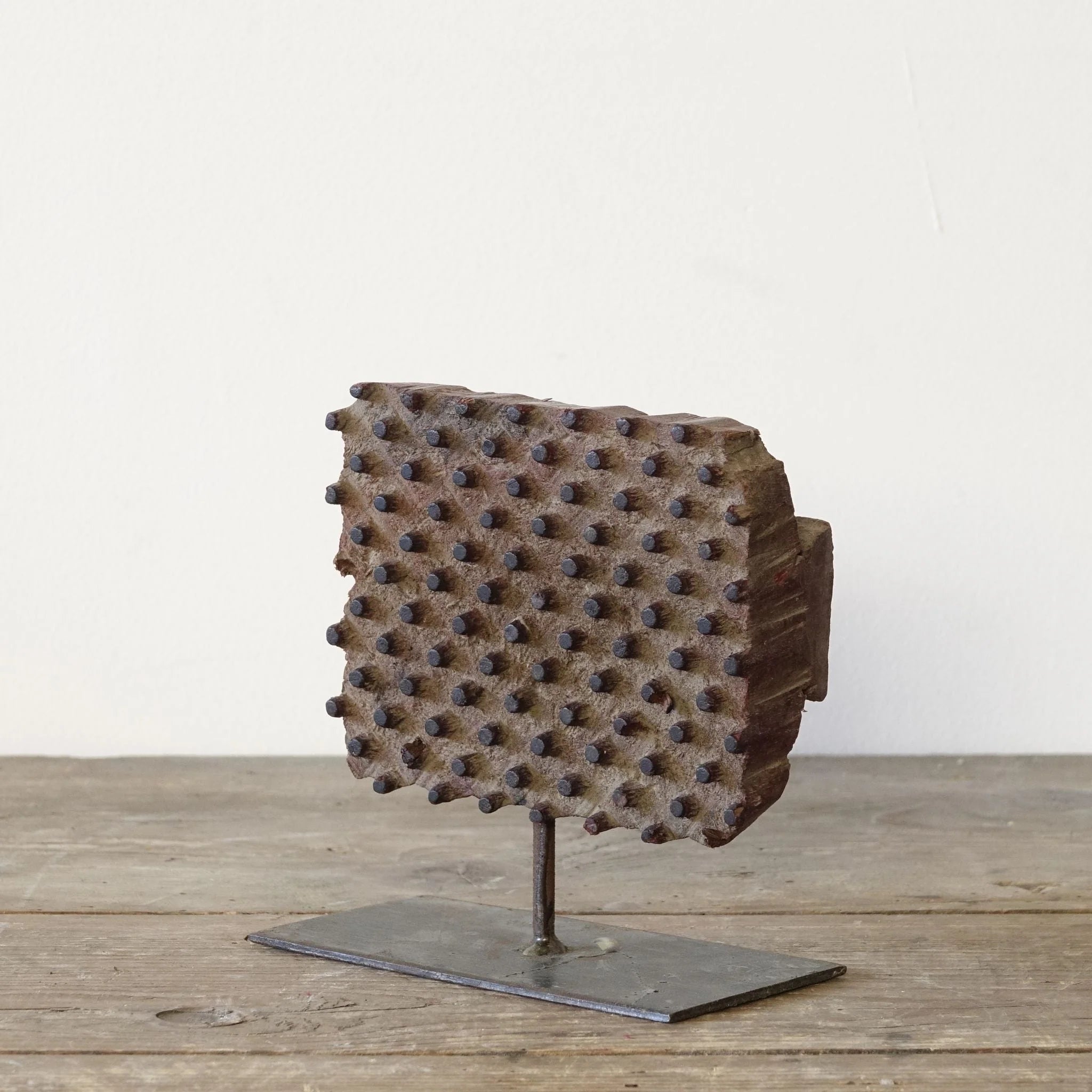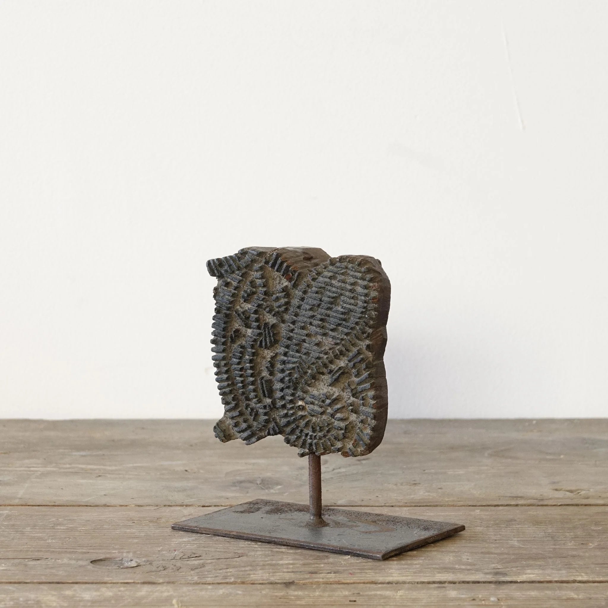 Dieser Blockstempel ist ein altes Original und ein Zeuge der Zeit. Jedes Stück ist ein Unikat. Auf einem Sockel aus Eisen montiert.