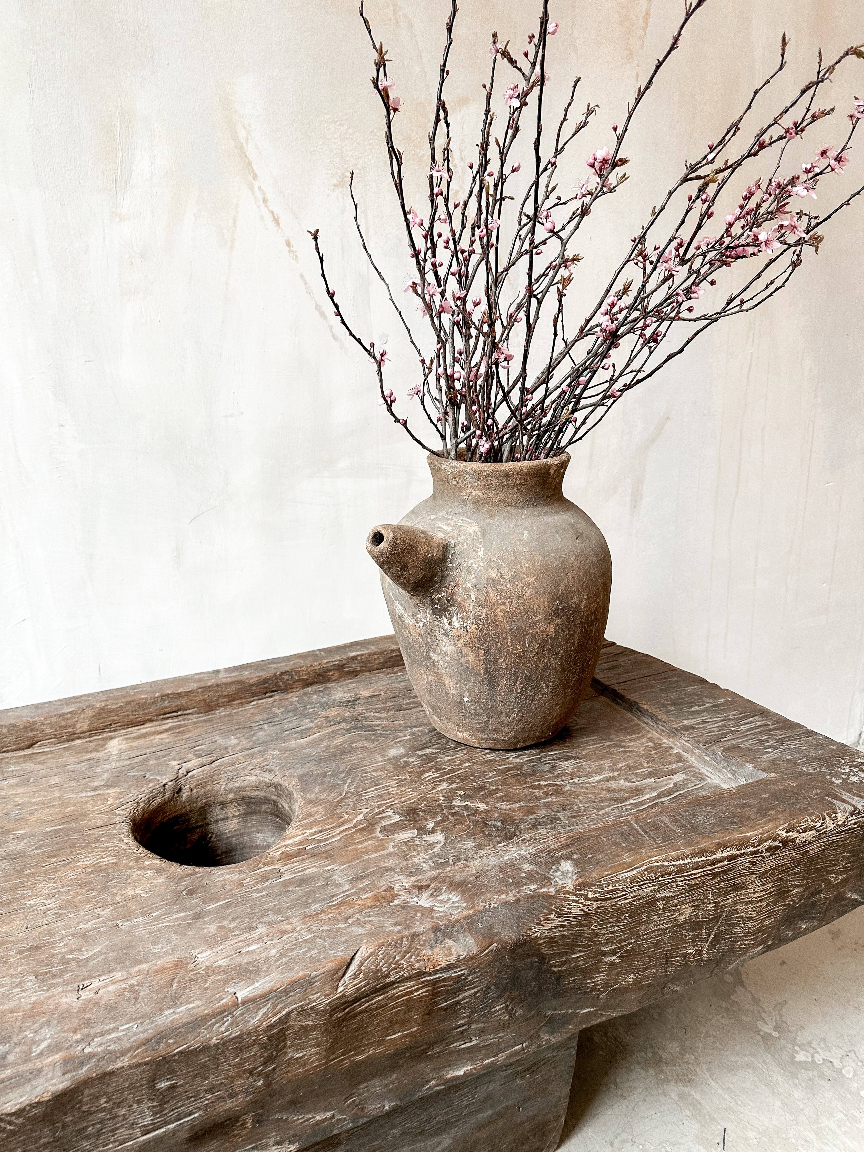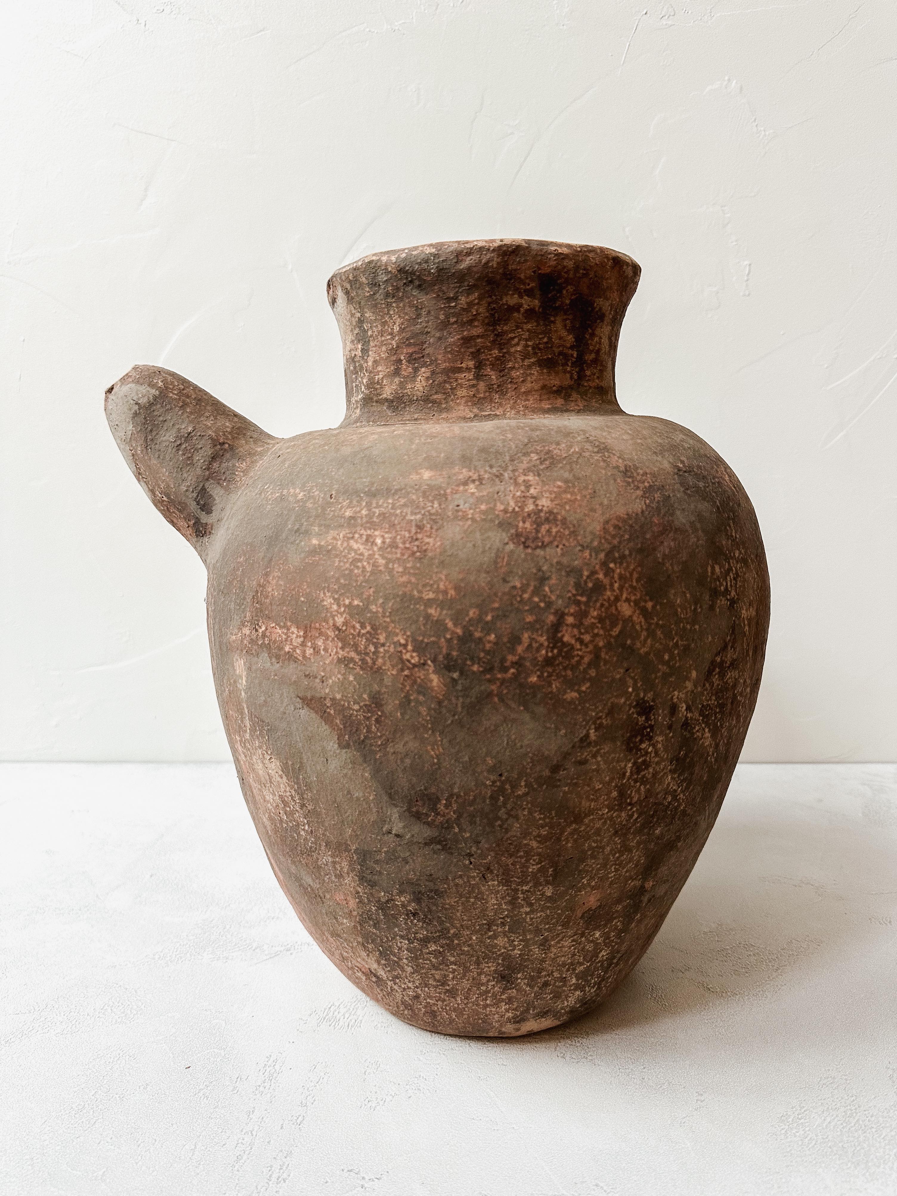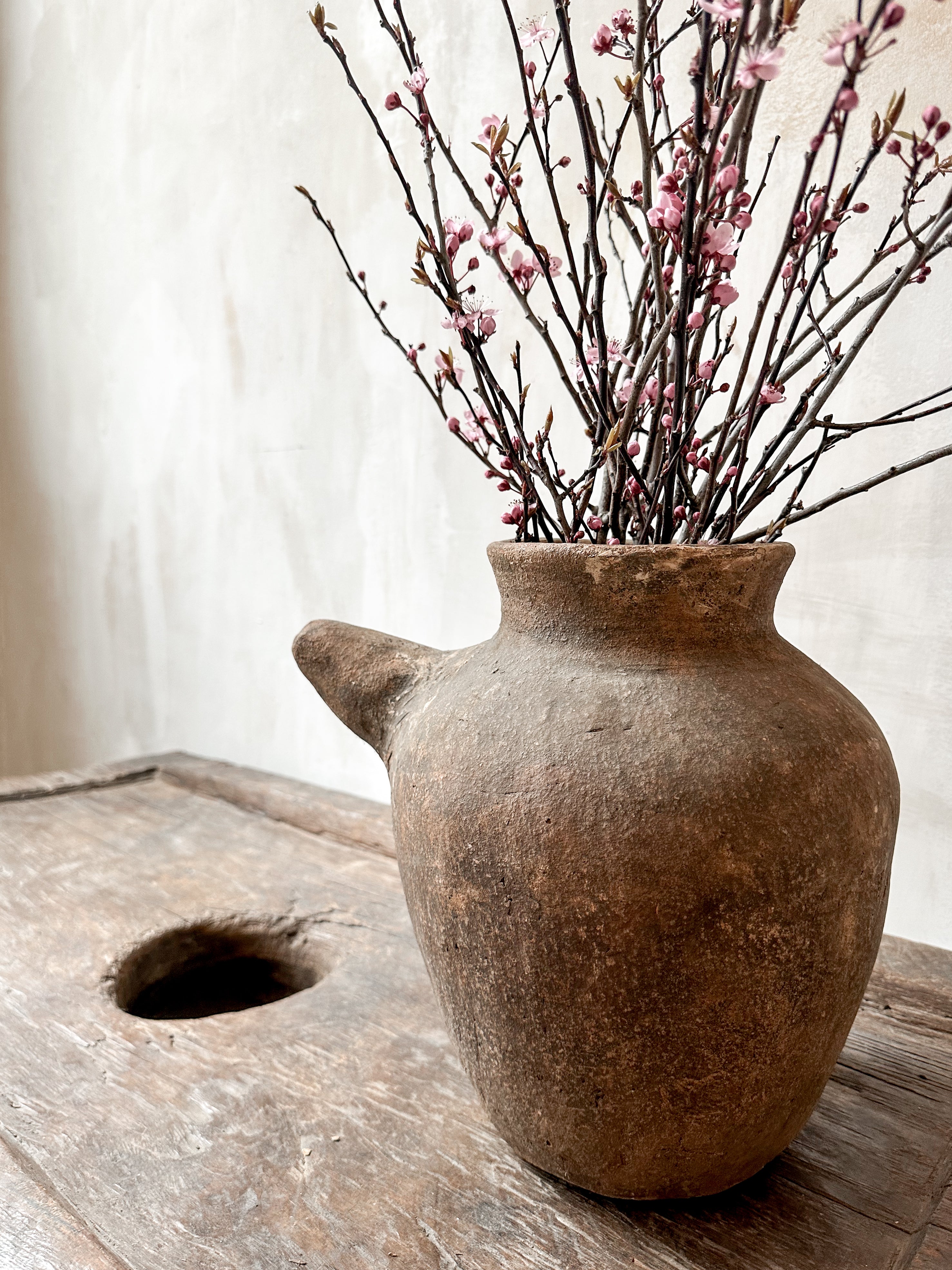 Wundervoller alter Wasserkrug aus Terrakotta mit seitlichem Ausguss. Dieses Gefäß ist für sich selbst ein schönes Dekorationsobjekt, aber auch einzigartig als Vase.
