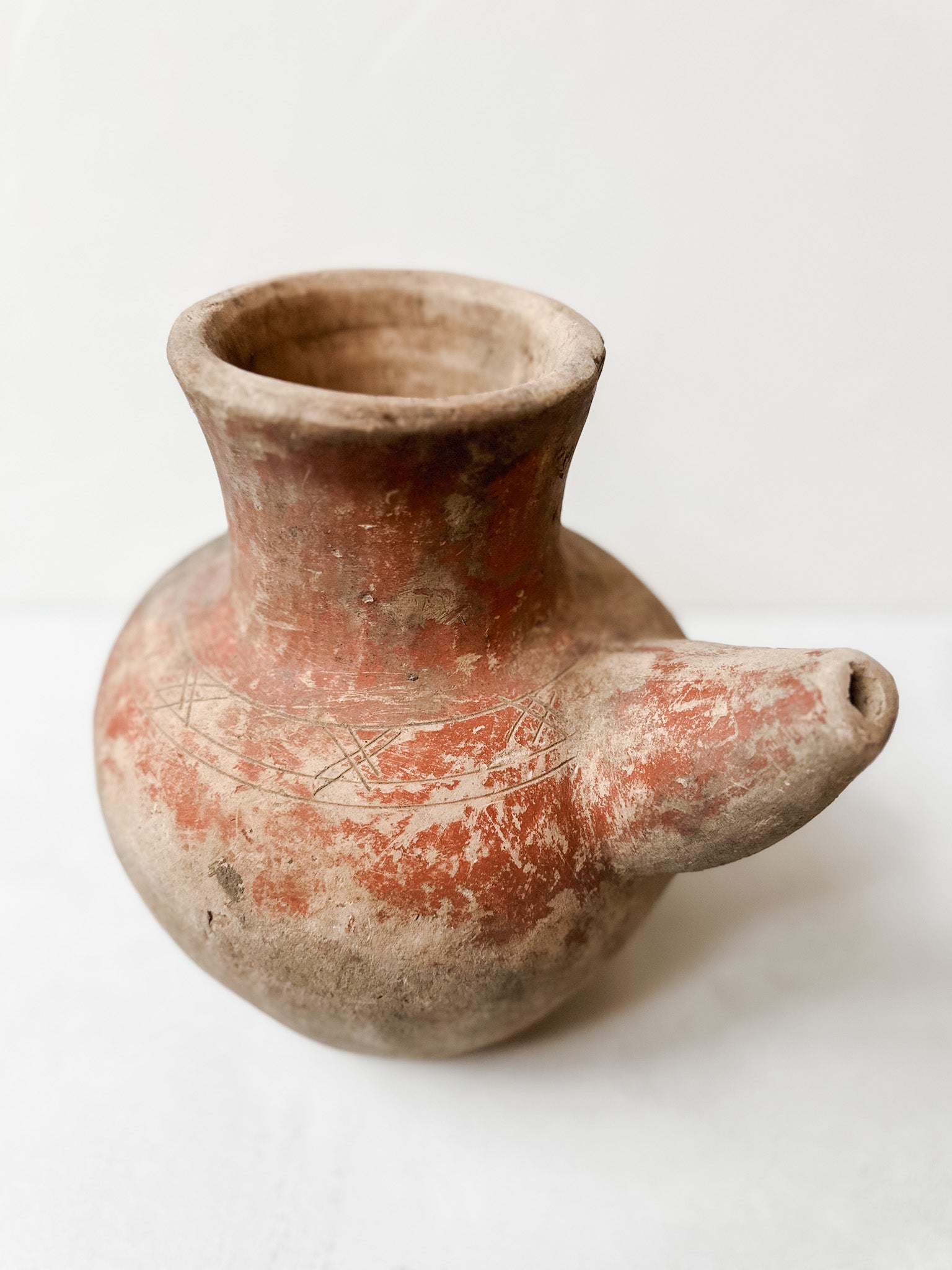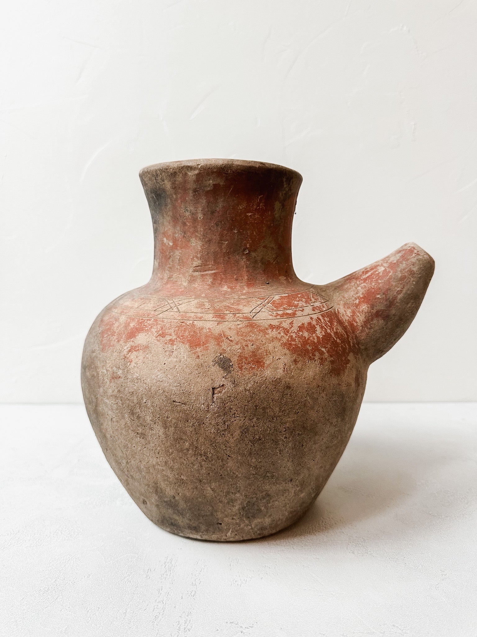 Wundervoller alter Wasserkrug aus Terrakotta mit seitlichem Ausguss. Dieses Gefäß ist für sich selbst ein schönes Dekorationsobjekt, aber auch einzigartig als Vase.