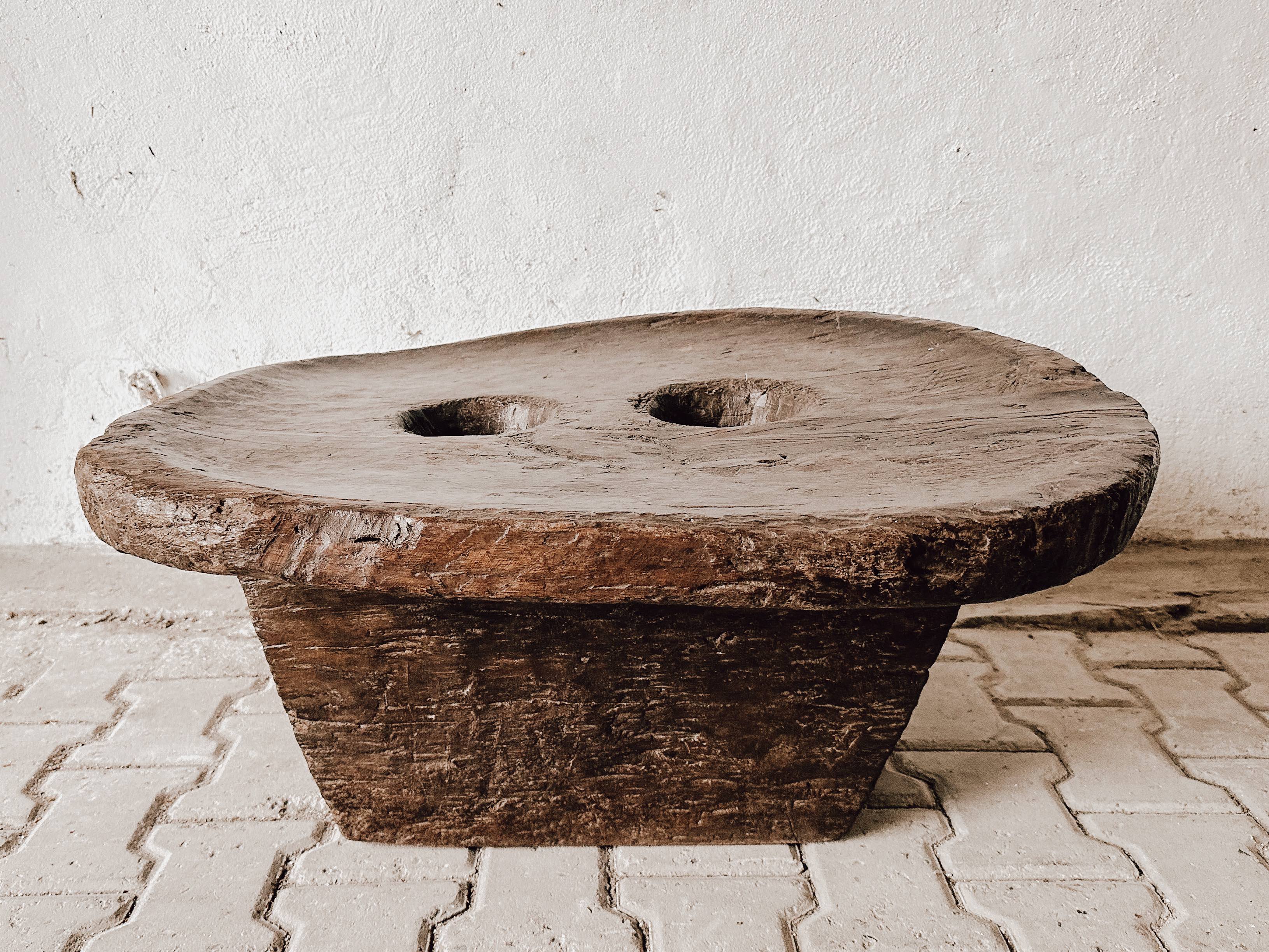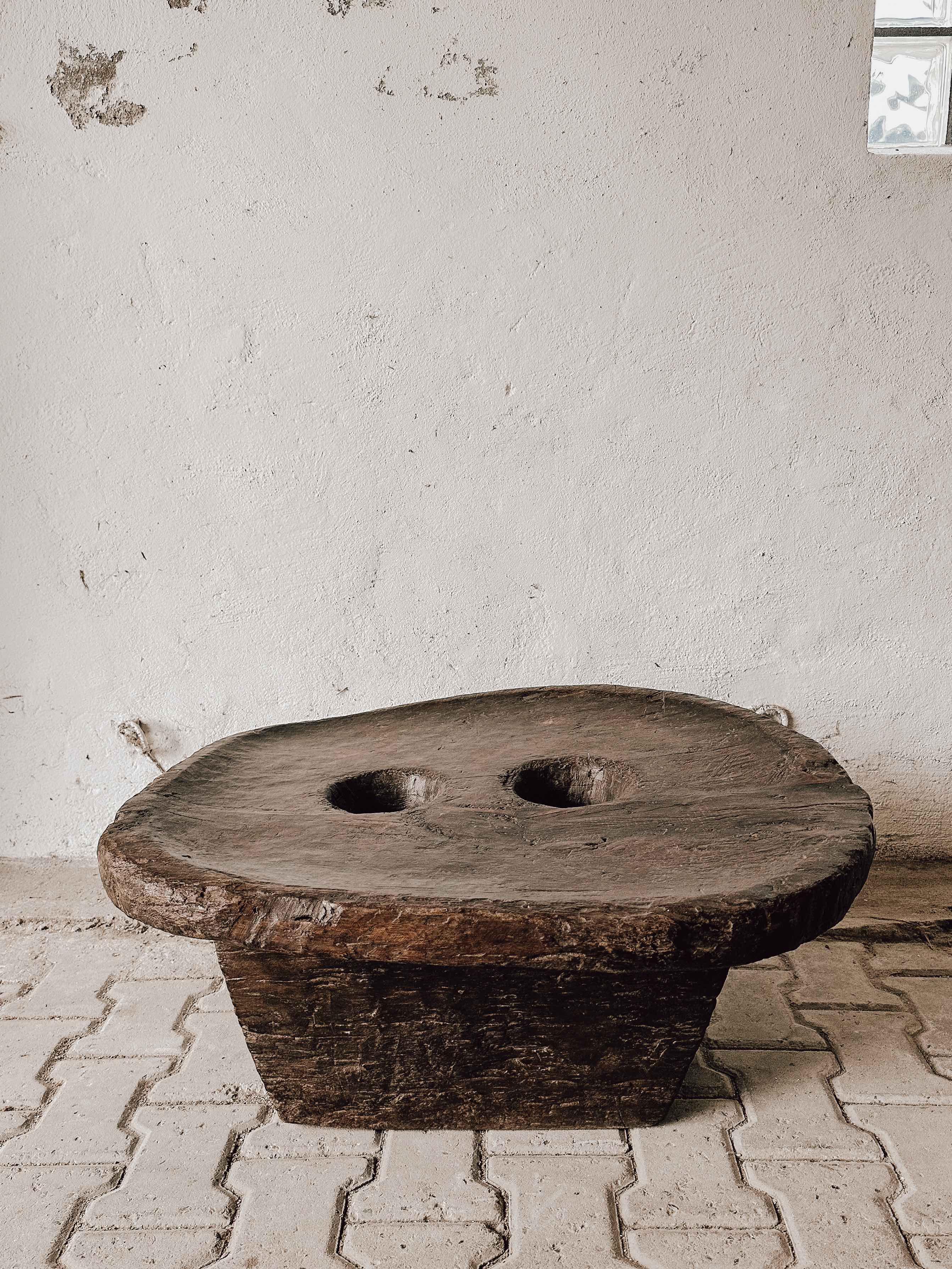 Dieser außergewöhnliche Tisch aus Nagaland wurde ursprünglich von den Naga-Stämmen im Nordosten Indiens als Mahltisch für Hirse oder Kaffee verwendet. Im Loch in der Mitte wurden die Körner gehalten und mit langen Stangen gemahlen.