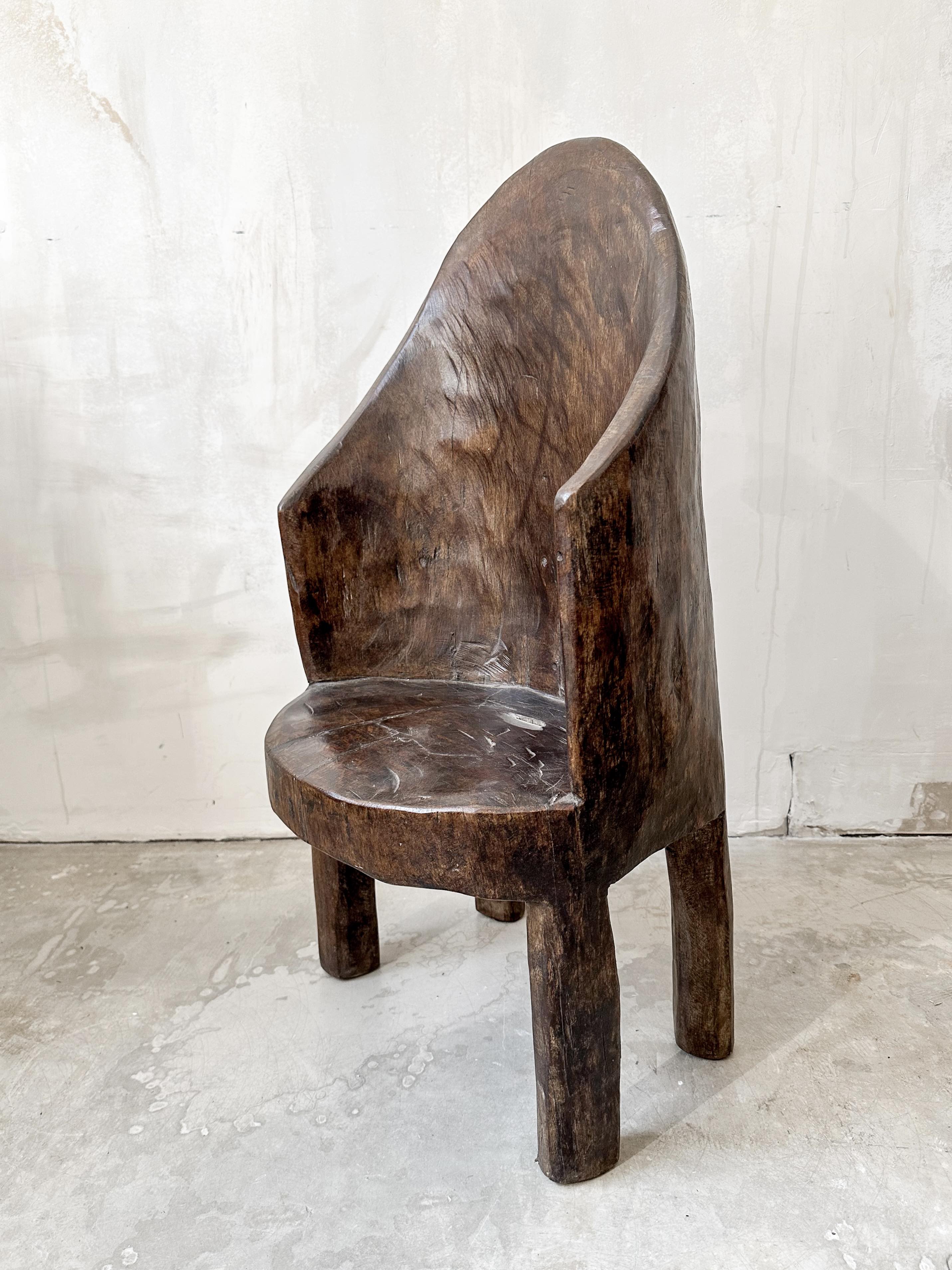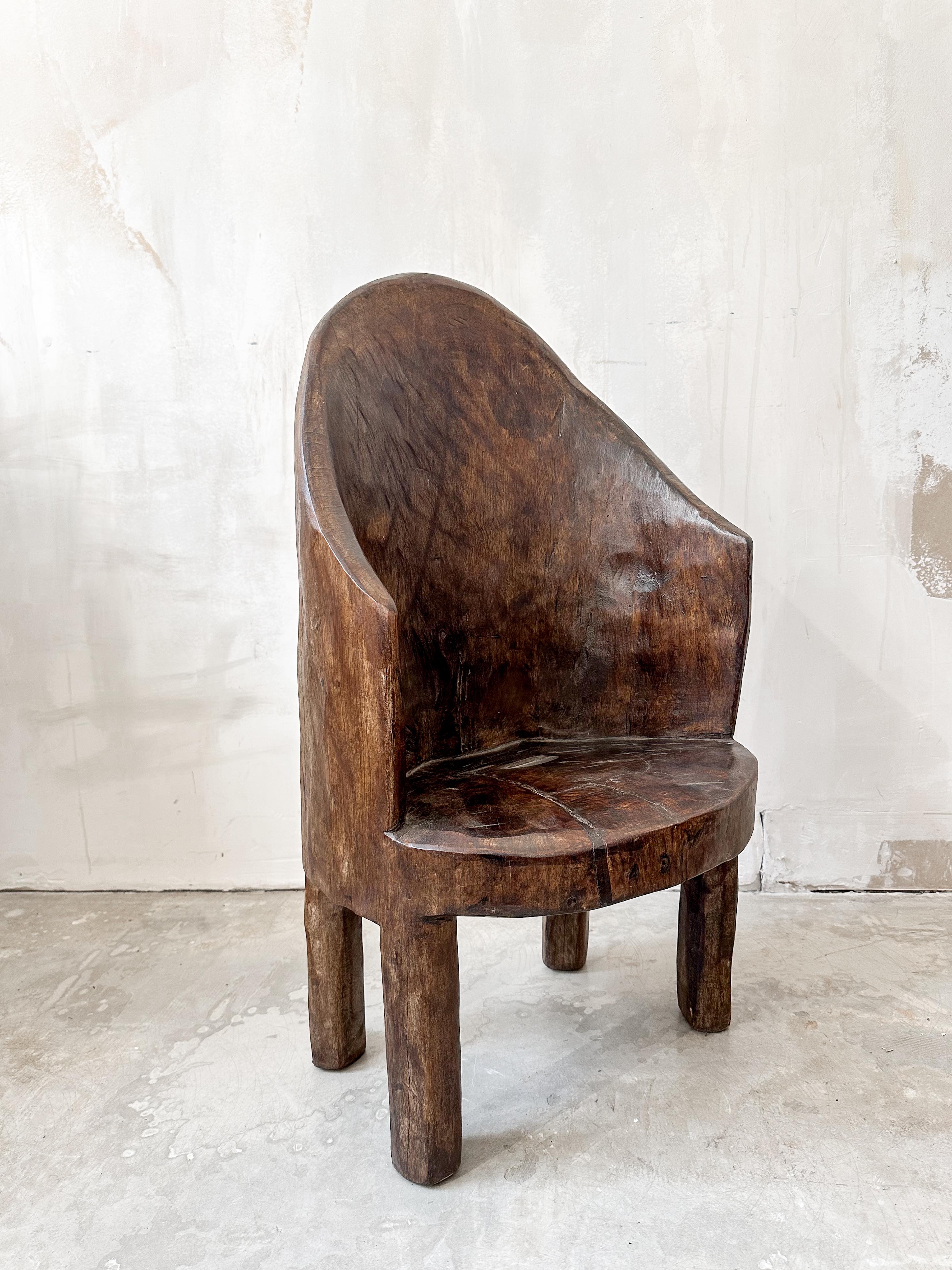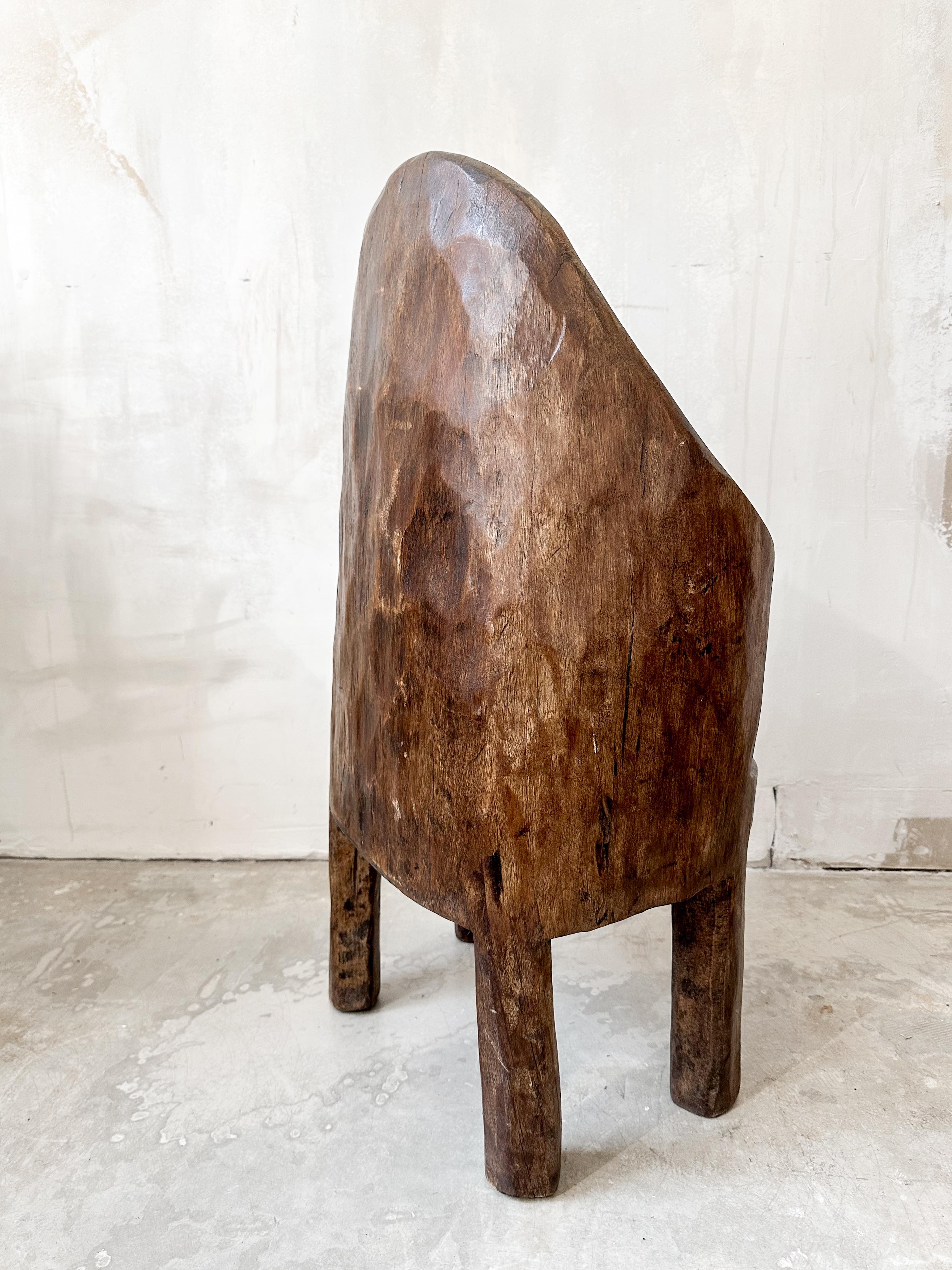 Wir lieben zeitlose Einzelstücke: Dieser Stuhl ist ein echtes Kunstwerk. Aus einem massiven Holzblock von Hand geschnitzt, stammt er aus Nagaland, einer der letzten verbliebenen Stammeskulturen in Nordindien. Das Holz hat über die lange Zeit eine schöne, dunkle Patina bekommen.