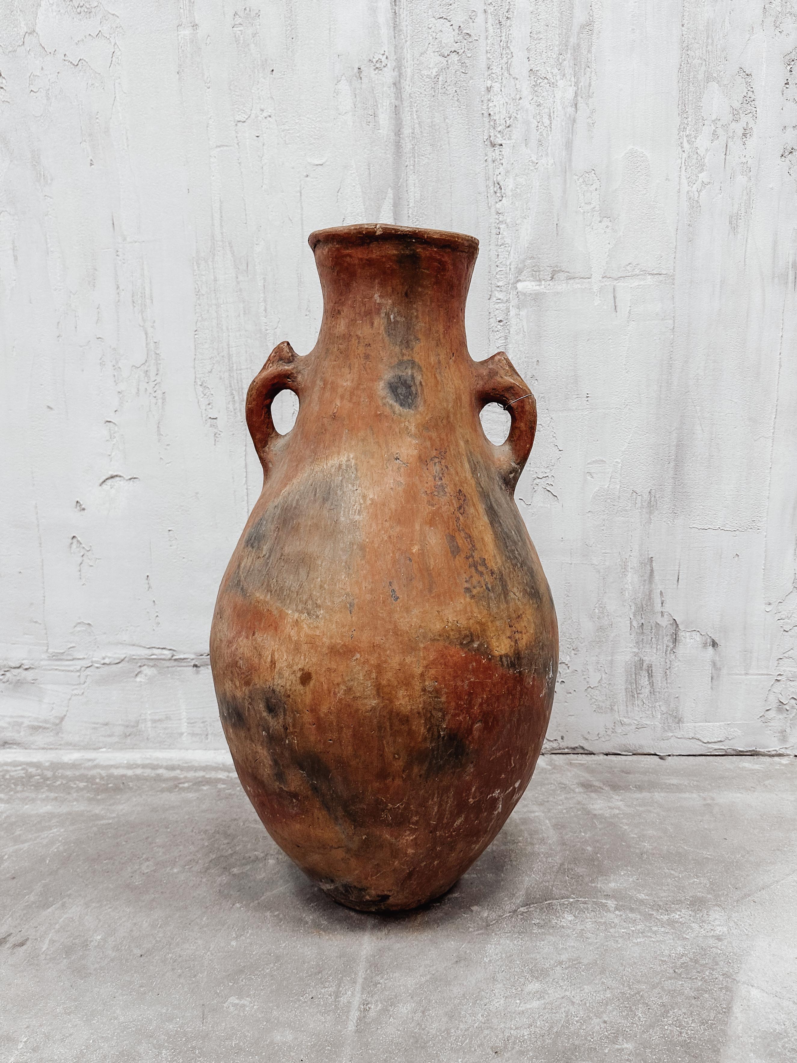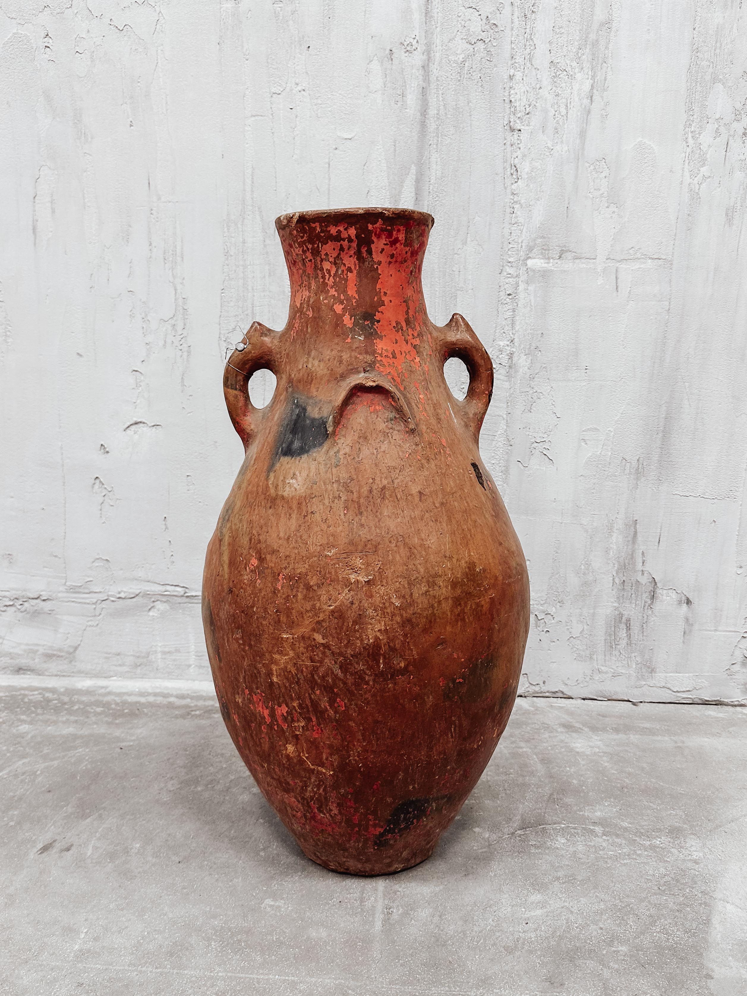 Sehr (!) schwere und dunkelrote türkische Tontöpfe, die einst zum Aufbewahren von Melasse, Käse und Butter dienten. Diese Töpfe wurden einst von Nomadenvölkern handgefertigt und zurückgelassen, wenn sie an andere Orte weiterzogen. Die Töpfe sind verwittert und asymmetrisch, was ihnen einen einzigartigen Charme verleiht. Einige sind teilweise noch mit einer zusätzlichen roten Glasur überzogen.