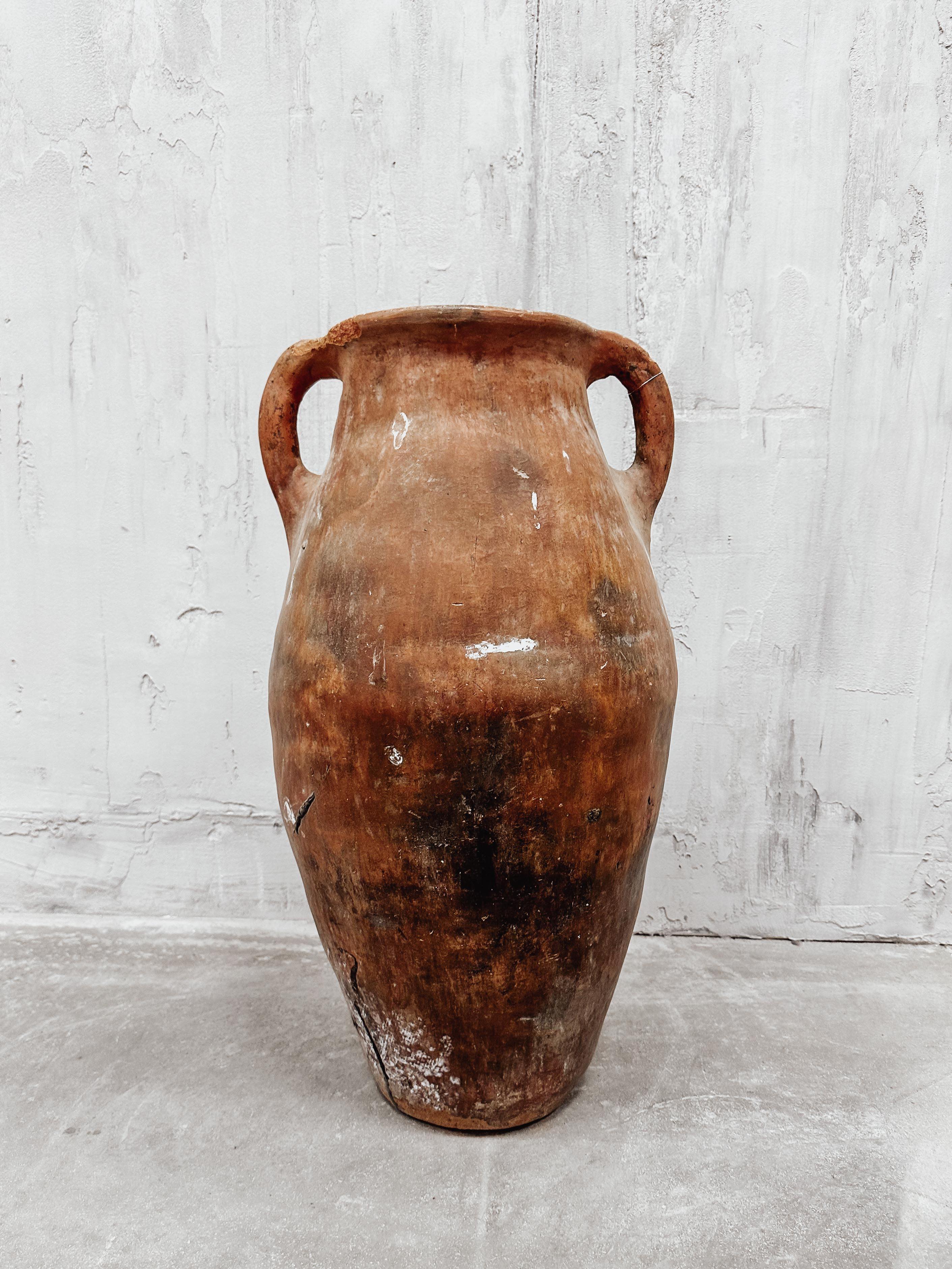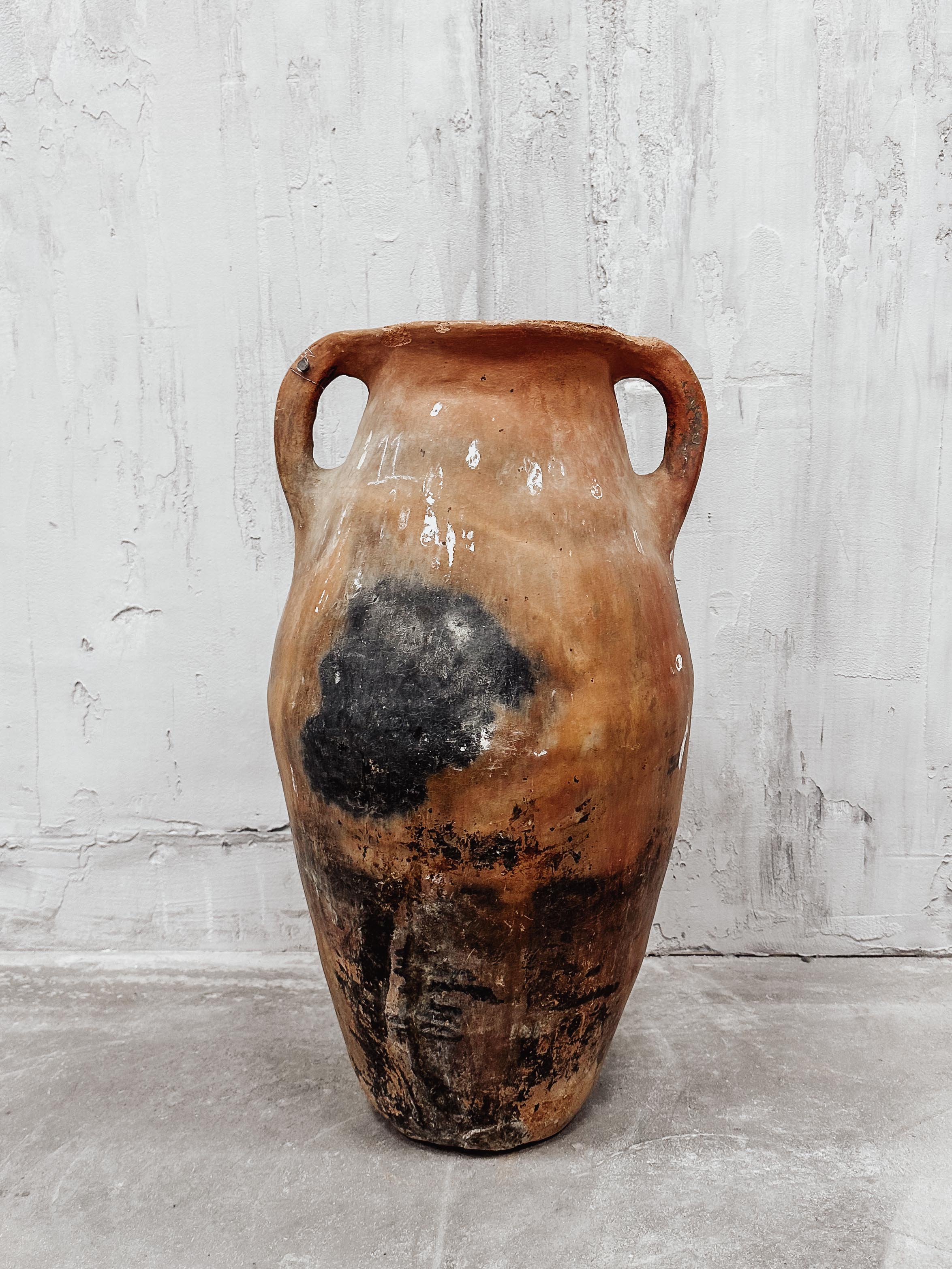 Sehr (!) schwerer und dunkler türkischer Tontopf, der einst zum Aufbewahren von Melasse, Käse und Butter diente. Diese Töpfe wurden einst von Nomadenvölkern handgefertigt und zurückgelassen, wenn sie an andere Orte weiterzogen. Die Töpfe sind verwittert und asymmetrisch, was ihnen einen einzigartigen Charme verleiht.