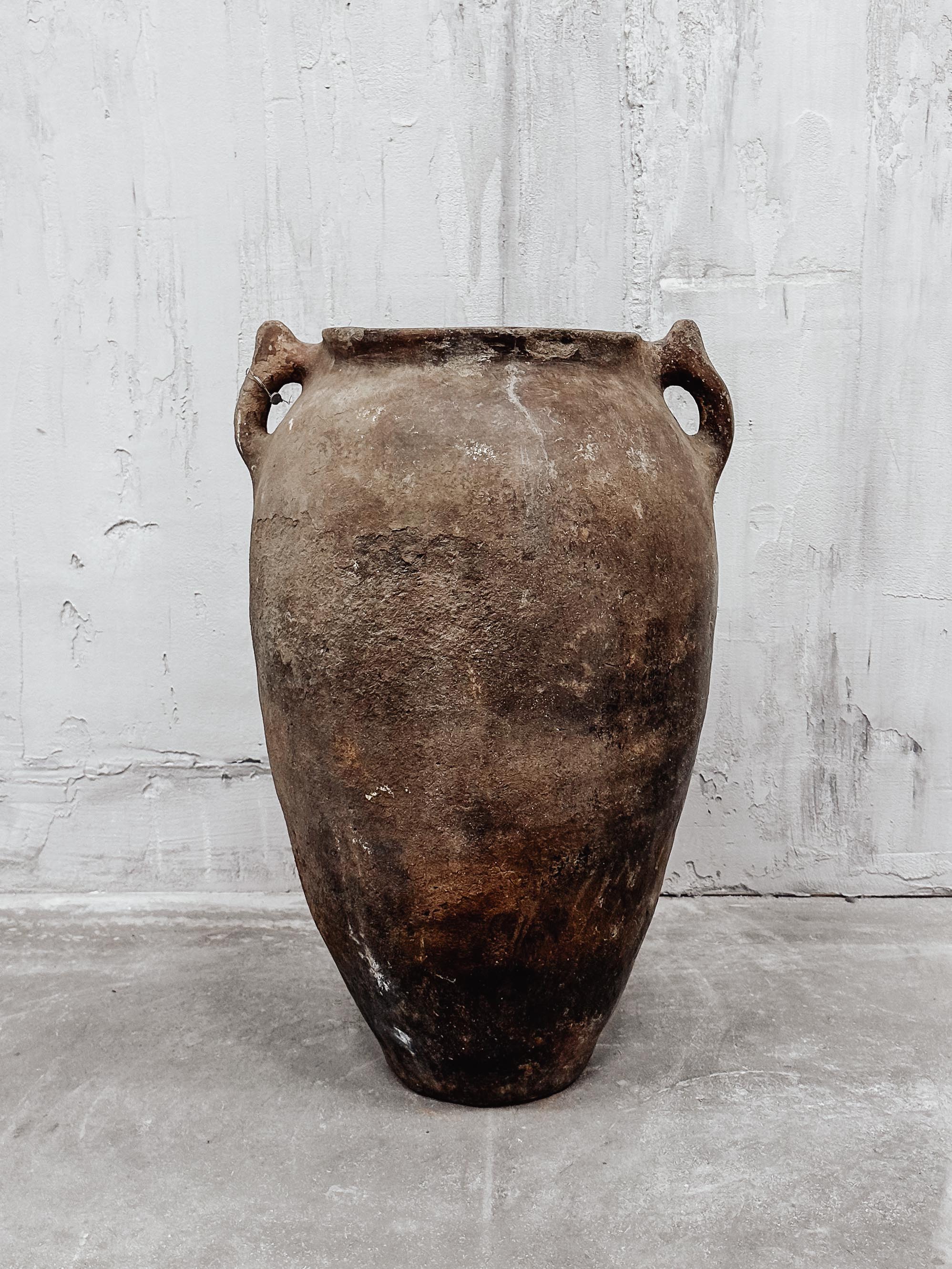 Sehr (!) schwerer und dunkler türkischer Tontopf, der einst zum Aufbewahren von Melasse, Käse und Butter diente. Diese Töpfe wurden einst von Nomadenvölkern handgefertigt und zurückgelassen, wenn sie an andere Orte weiterzogen. Die Töpfe sind verwittert und asymmetrisch, was ihnen einen einzigartigen Charme verleiht.