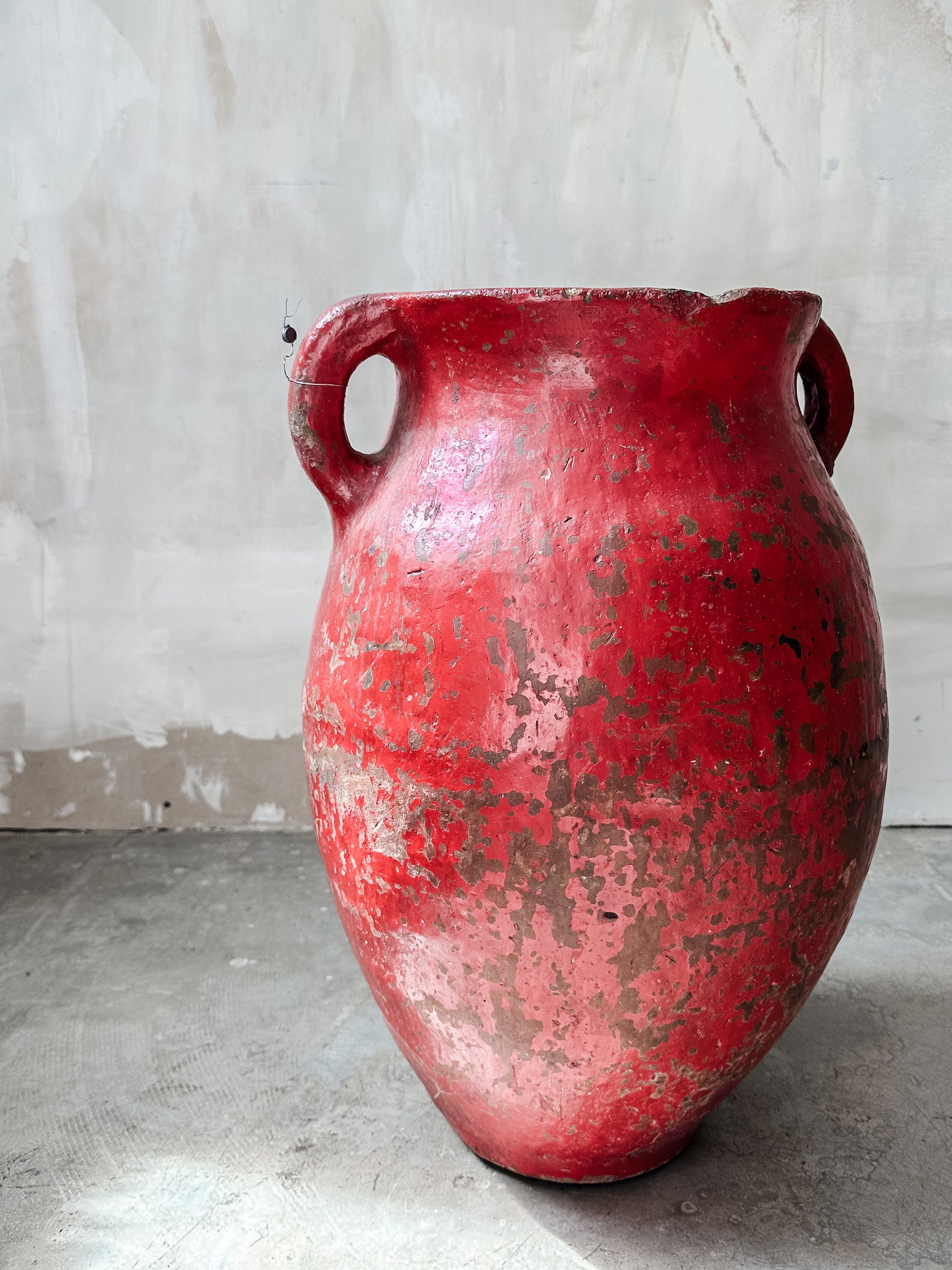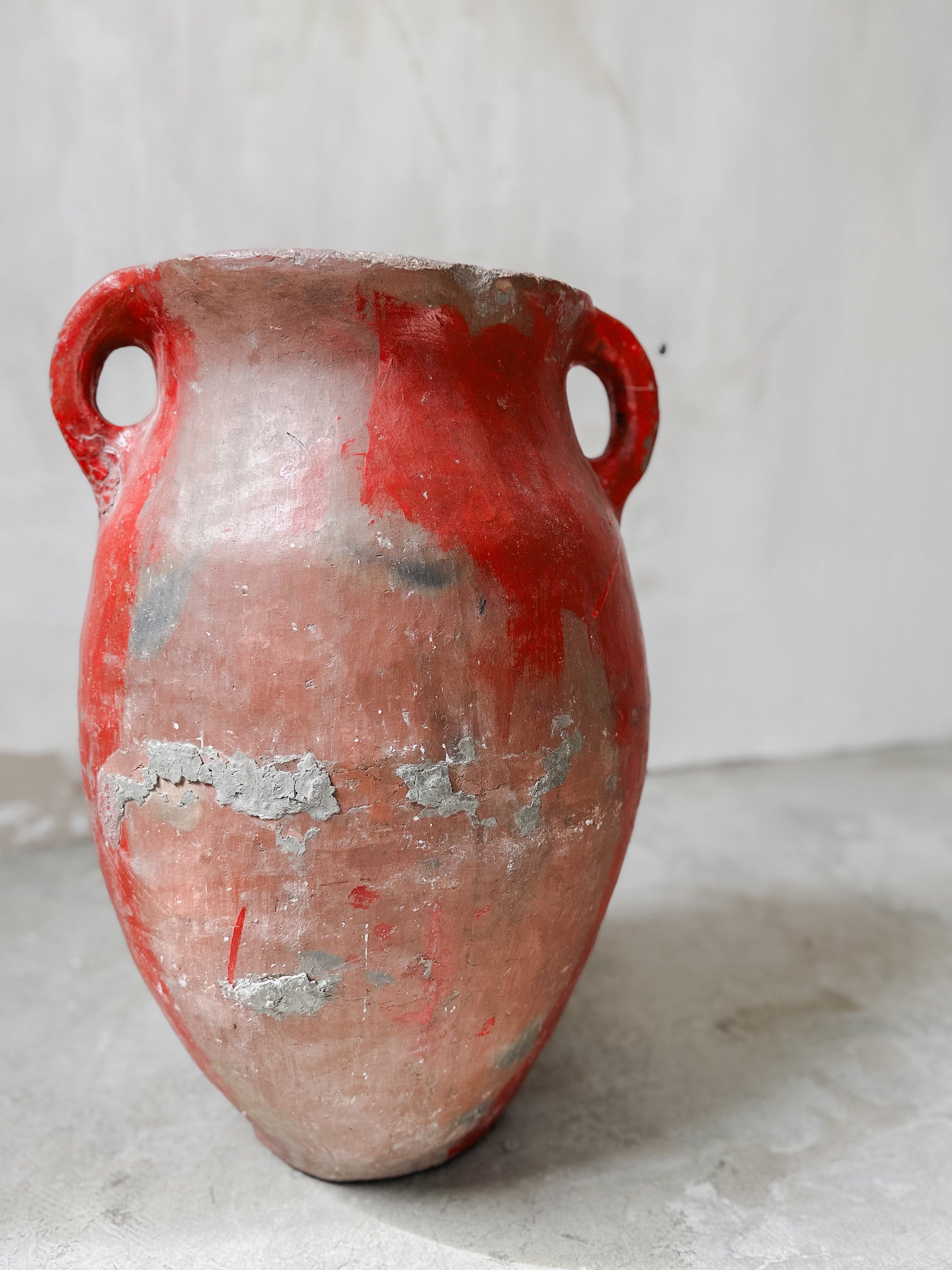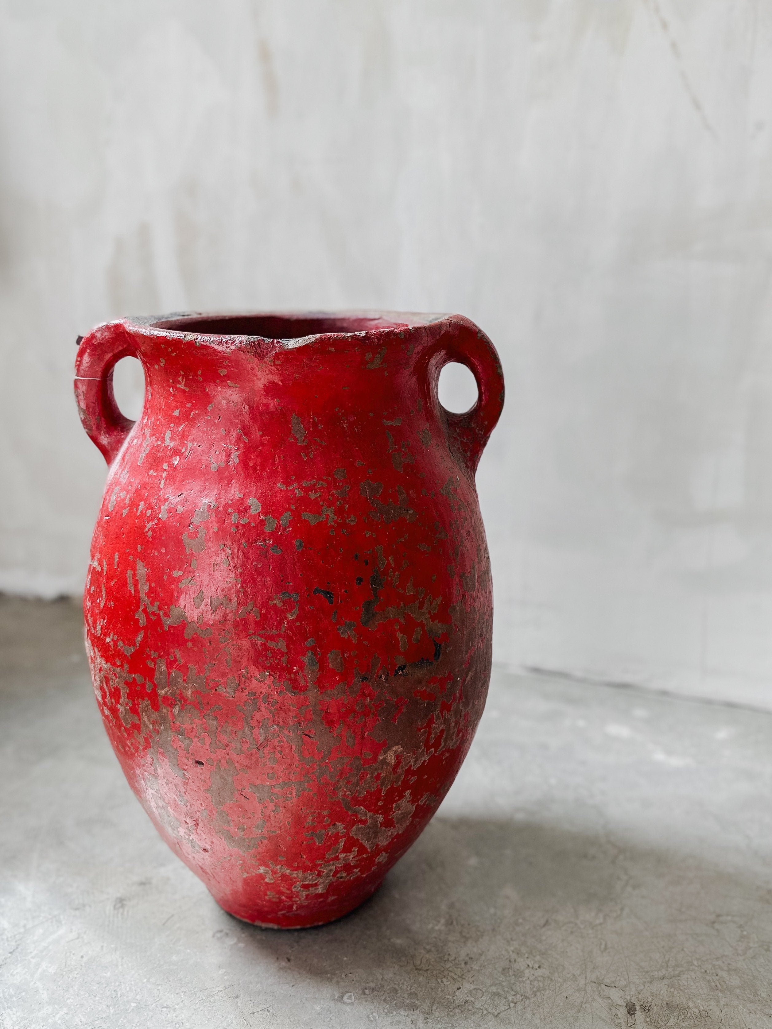 Sehr (!) schwerer und dunkler türkischer Tontopf, der einst zum Aufbewahren von Melasse, Käse und Butter diente. Diese Töpfe wurden einst von Nomadenvölkern handgefertigt und zurückgelassen, wenn sie an andere Orte weiterzogen. Die Töpfe sind verwittert und asymmetrisch, was ihnen einen einzigartigen Charme verleiht. Einige sind teilweise noch mit einer zusätzlichen roten Glasur überzogen.