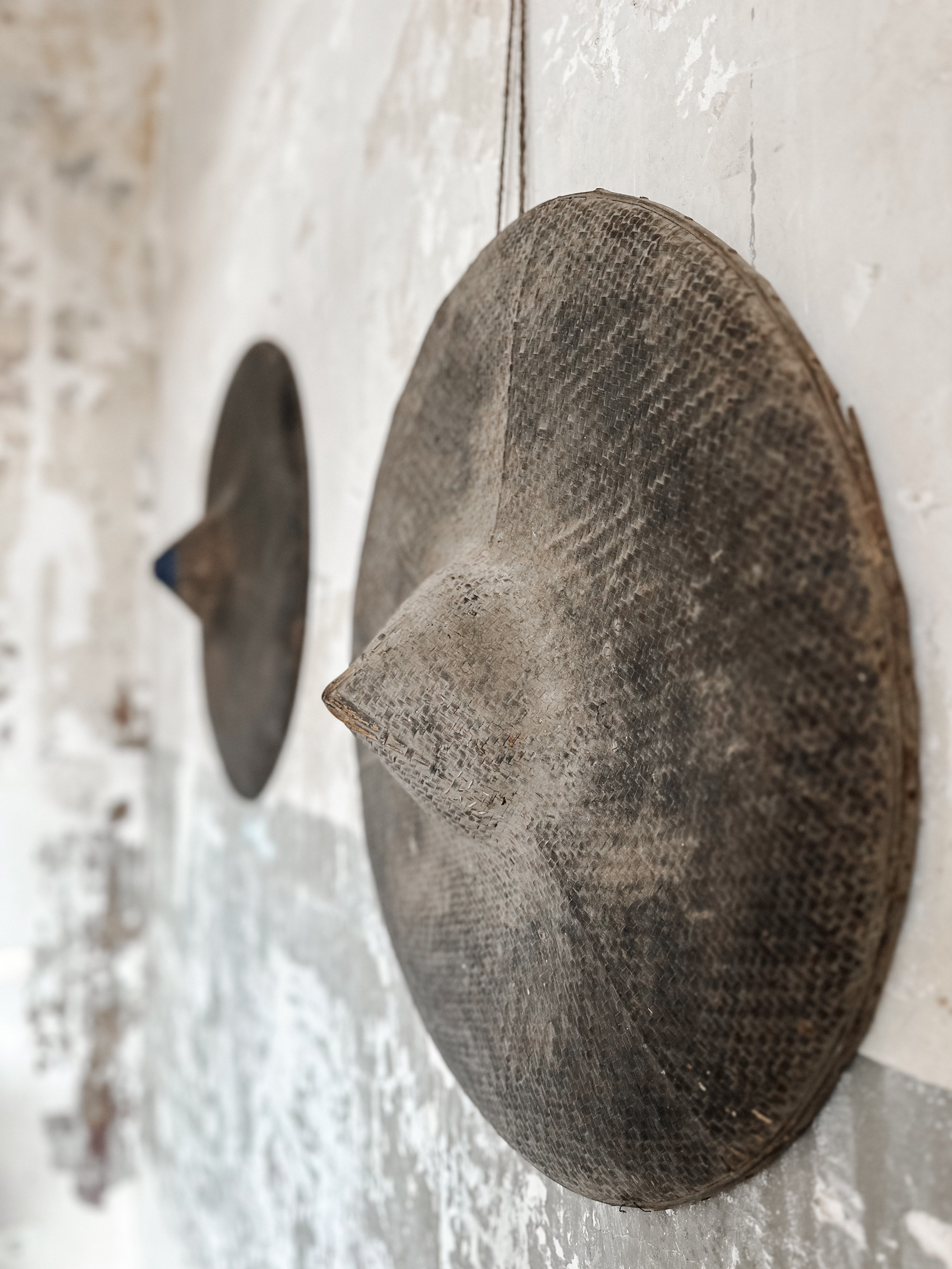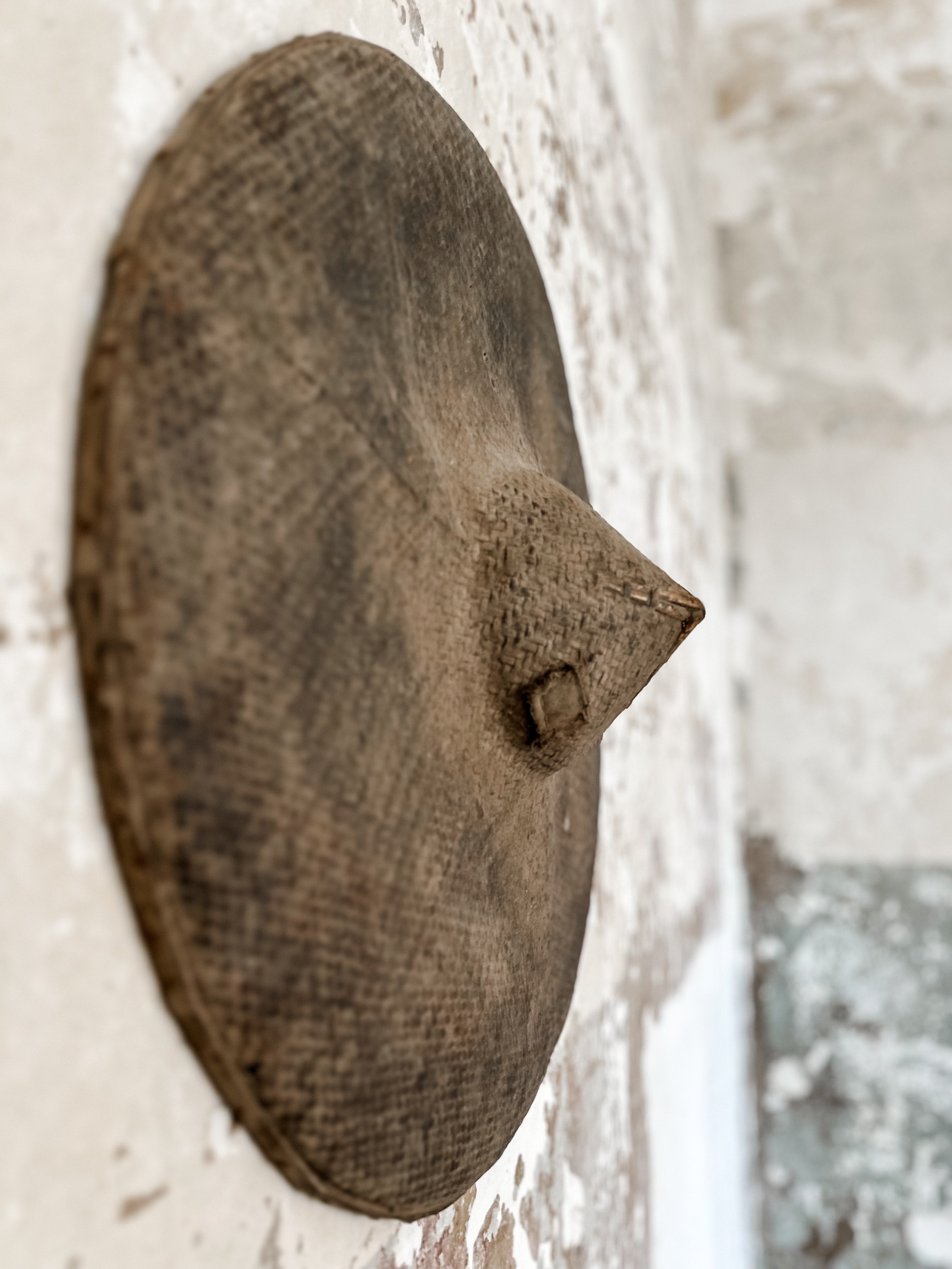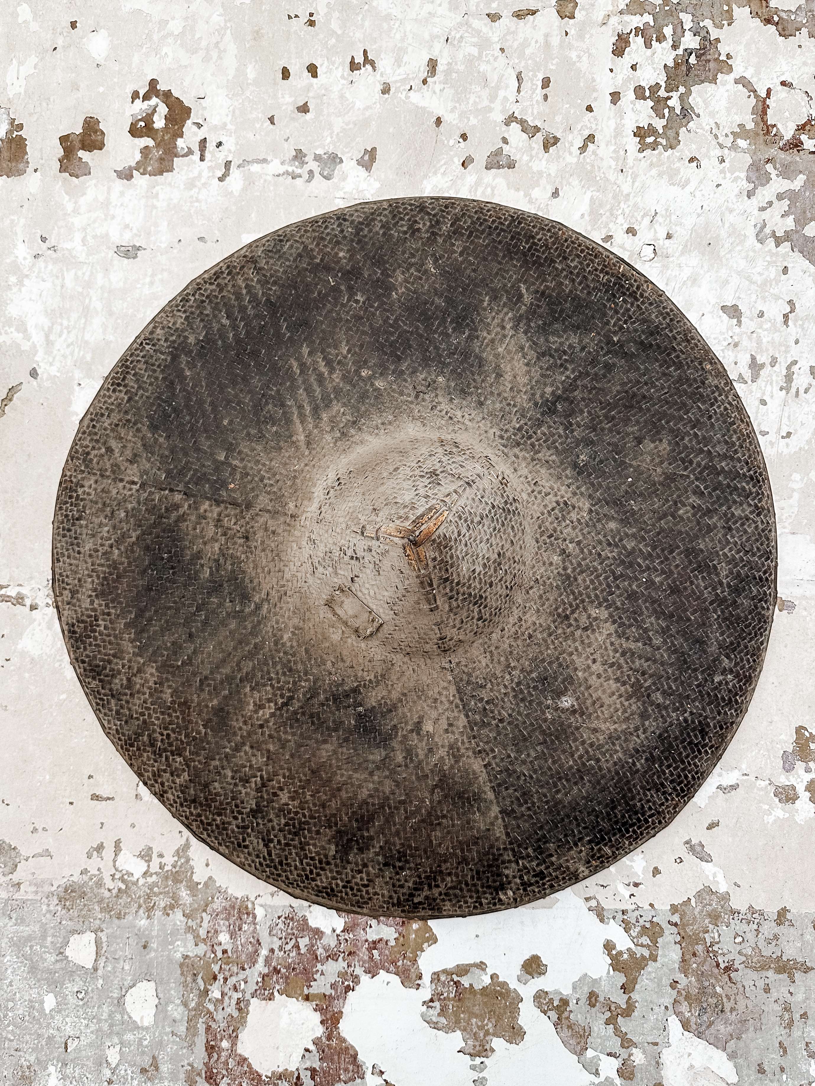 Einzigartiger, großer Bambus-Bauernhut aus Südchina. Es handelt sich um antike Stücke von ca. 1900 aus der Fujian Provinz, die Zeit hat ihre wundervollen Spuren hinterlassen.