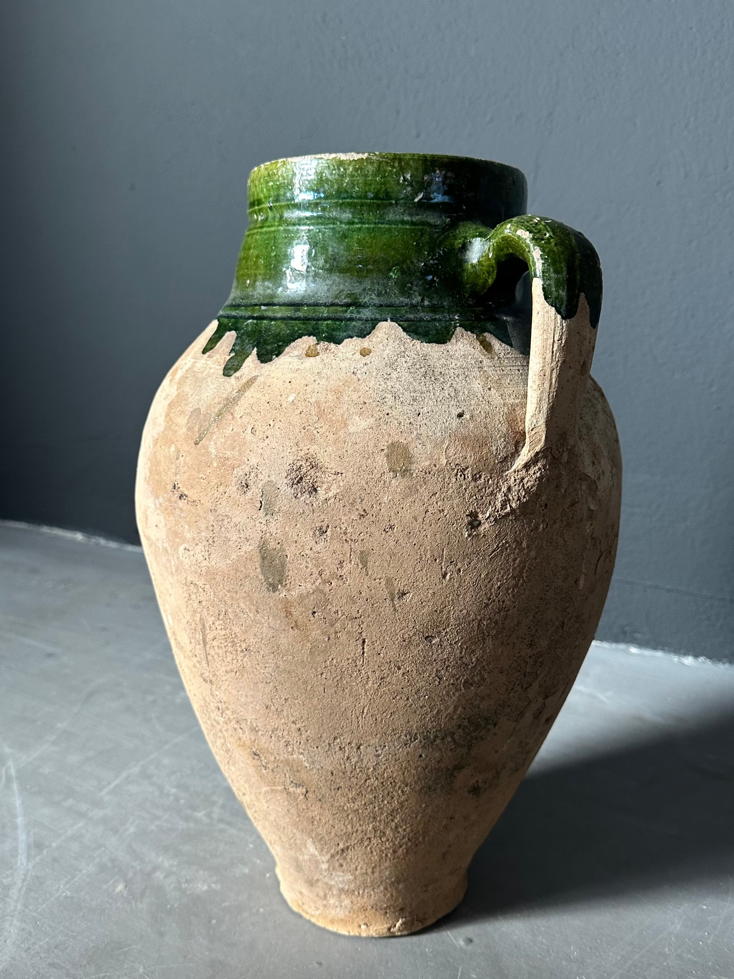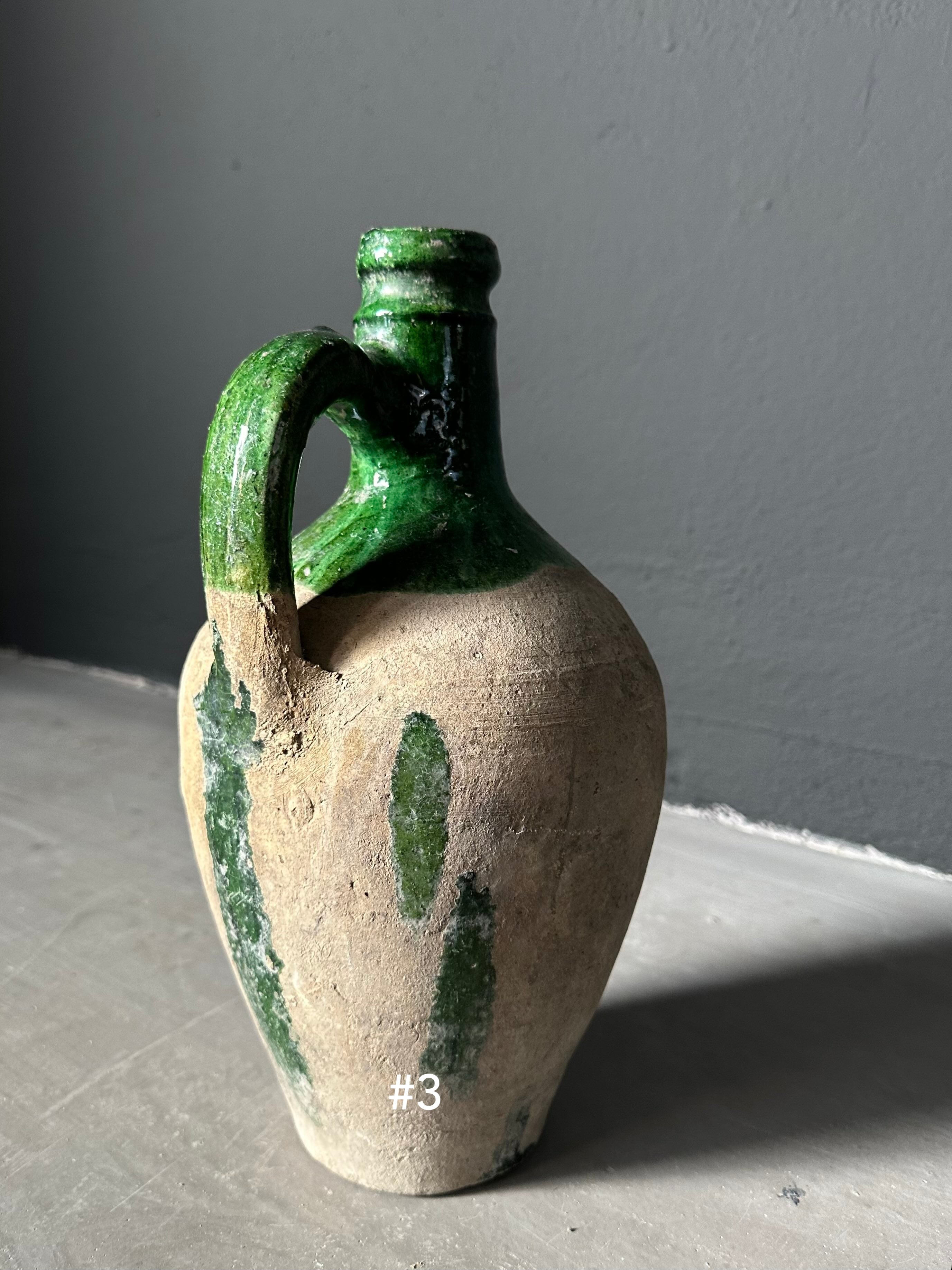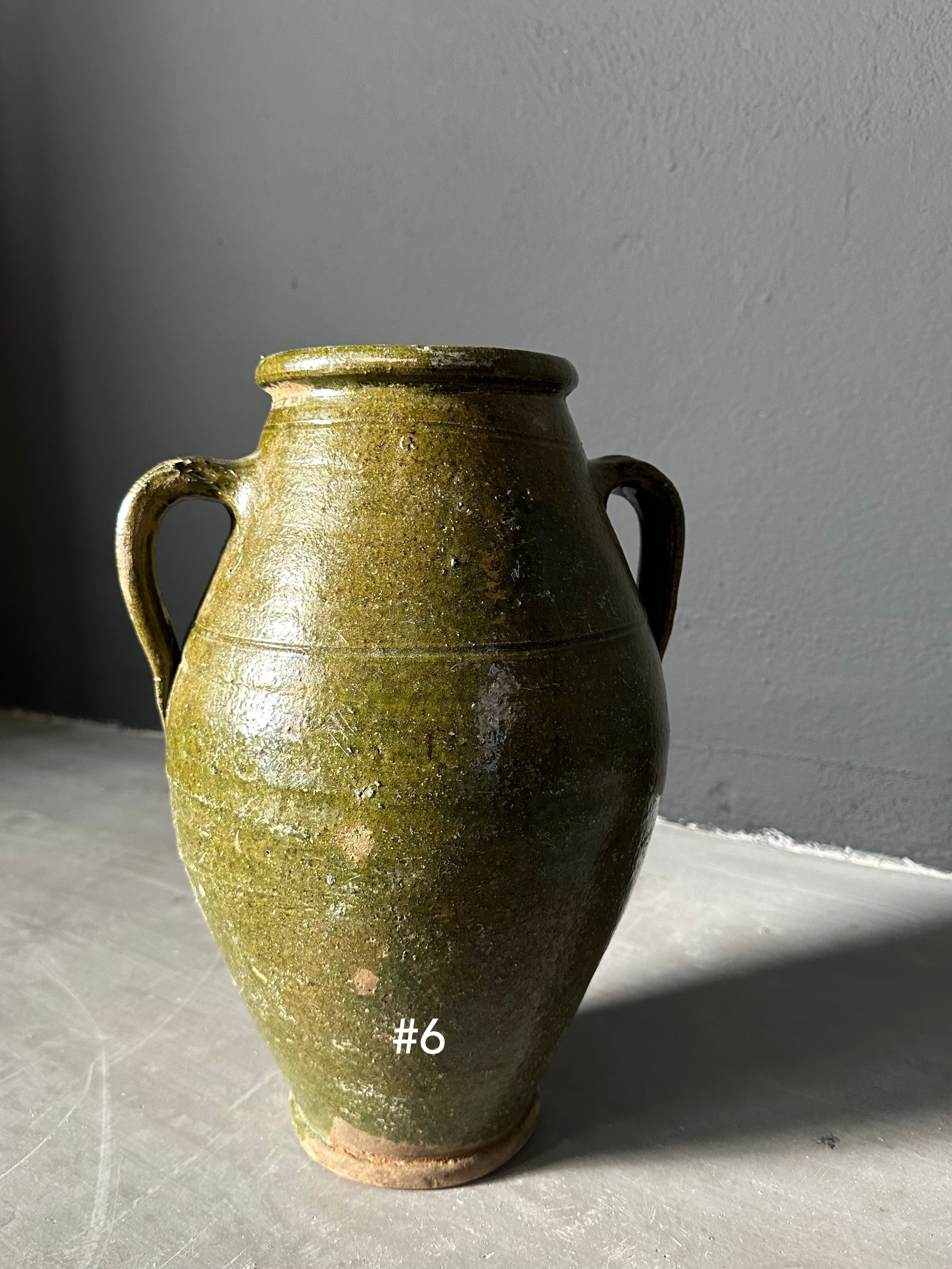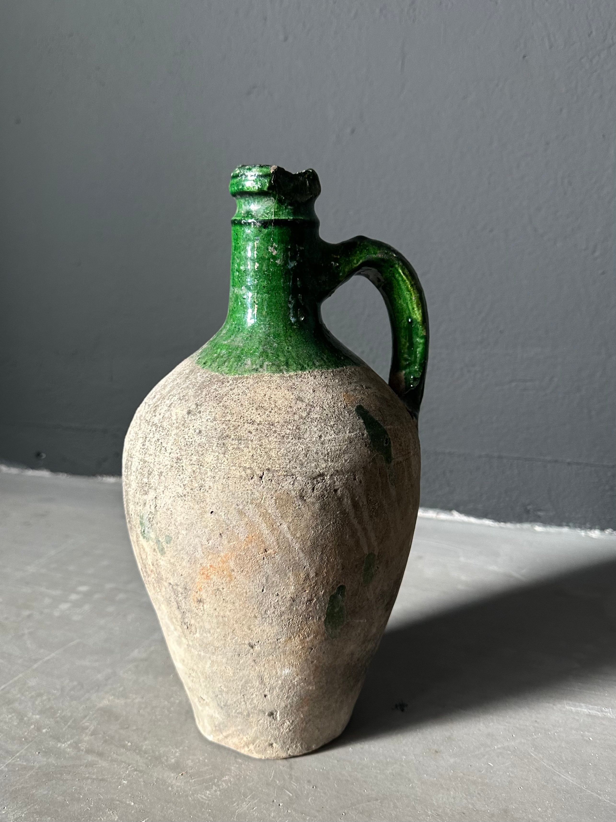 Diese alte Pottery ist wunderschön je nach Topf in verschiedenen Grüntönen glasiert und besticht durch einen eleganten Hals und seitliche Griffe.