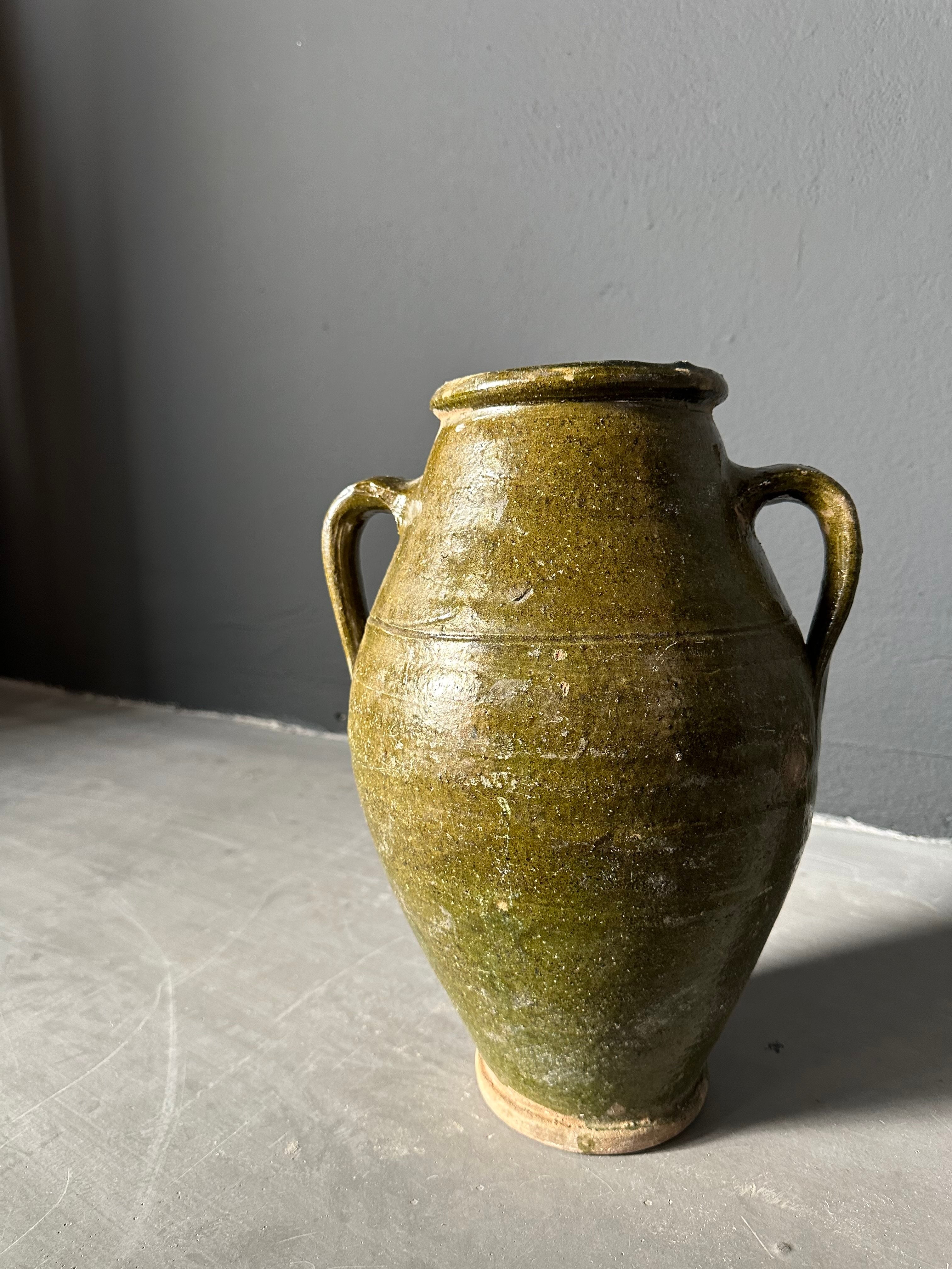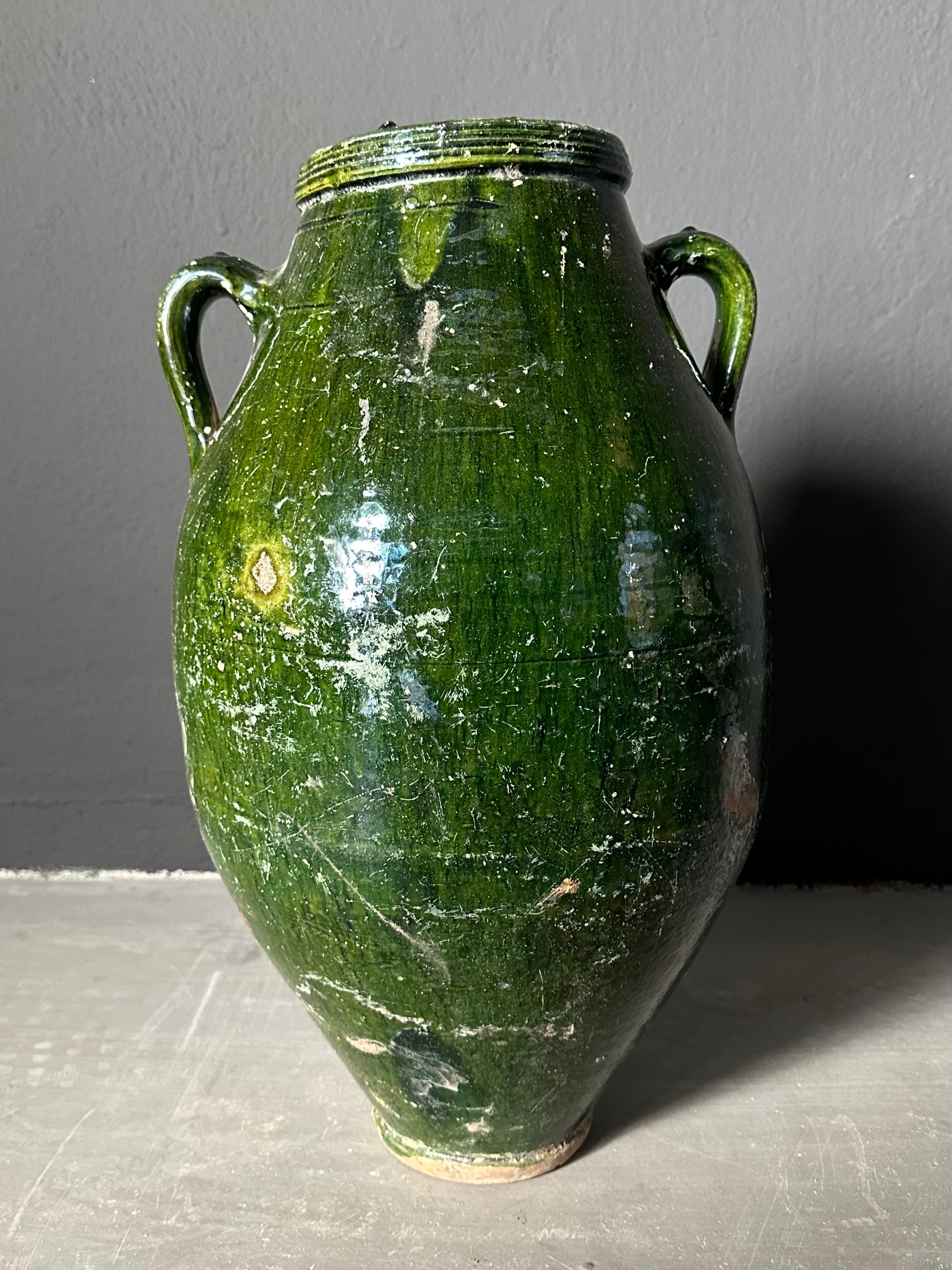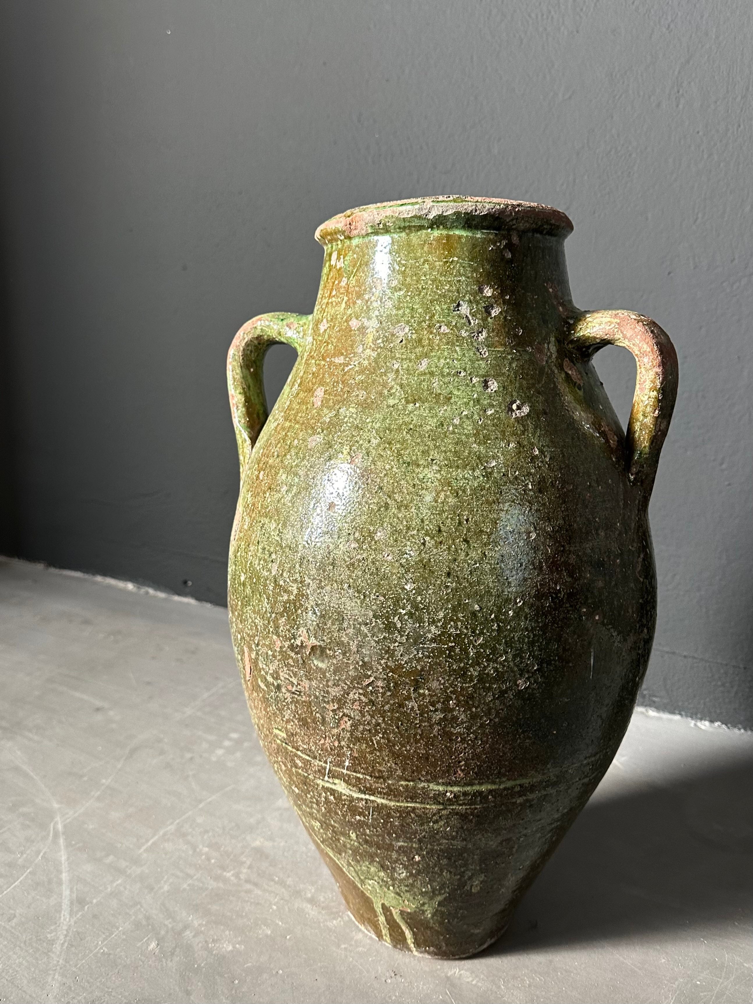 Diese alte Pottery ist wunderschön je nach Topf in verschiedenen Grüntönen glasiert und besticht durch einen eleganten Hals und seitliche Griffe.