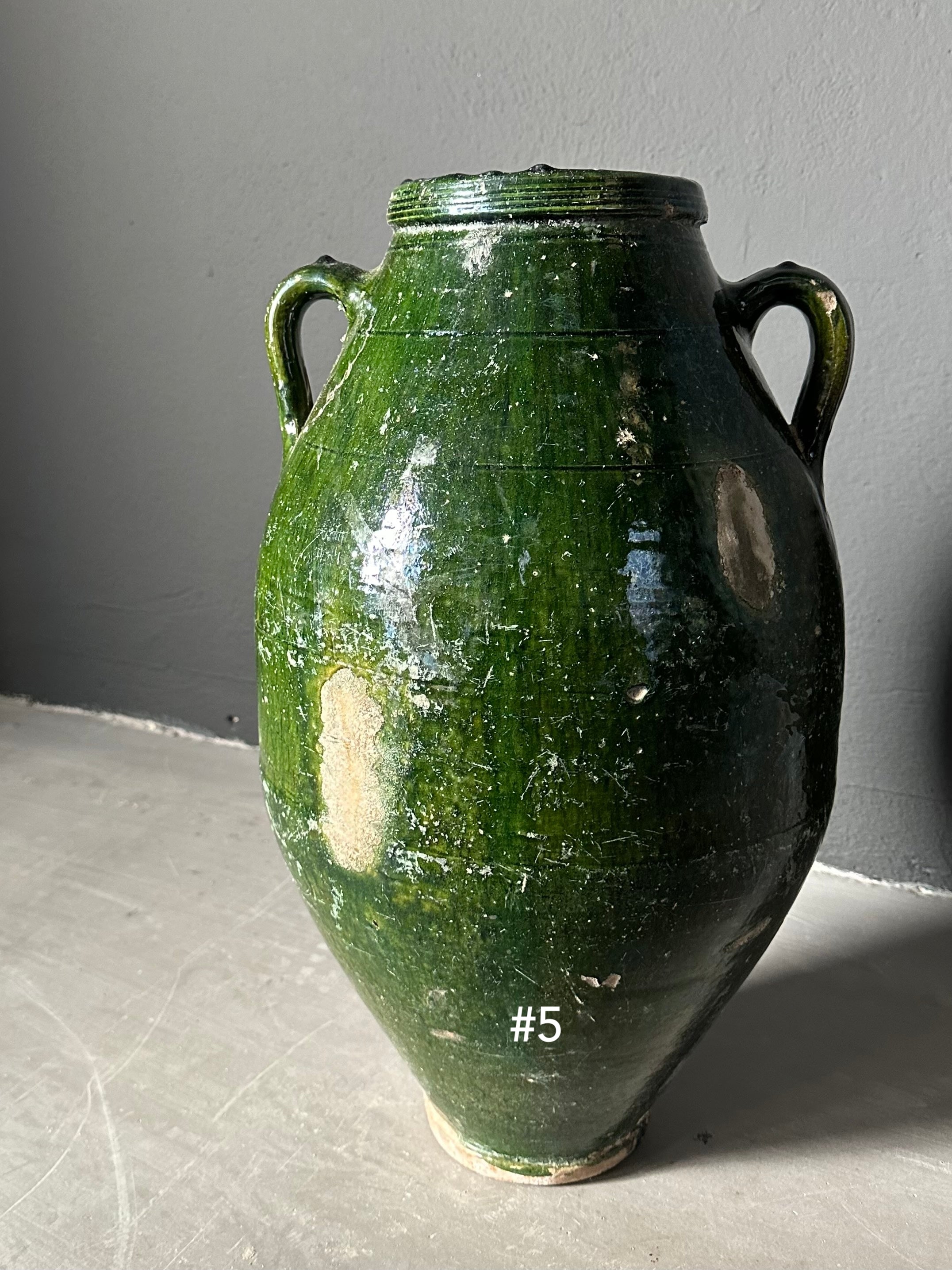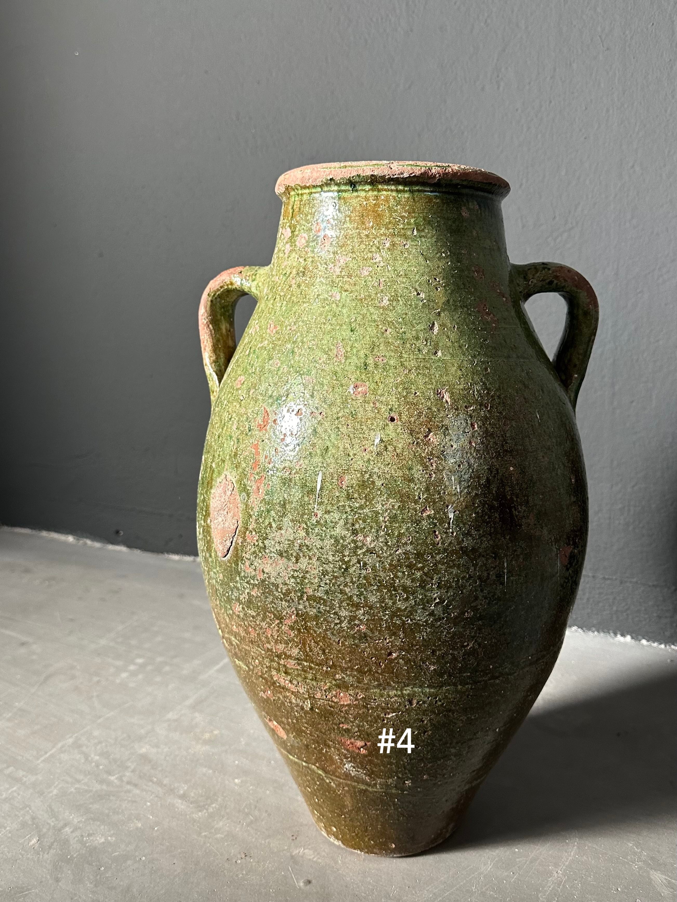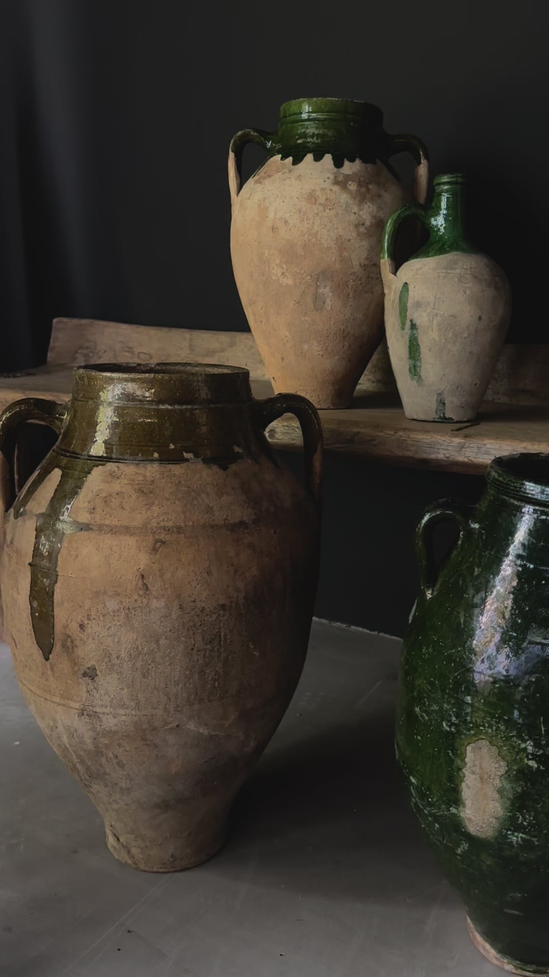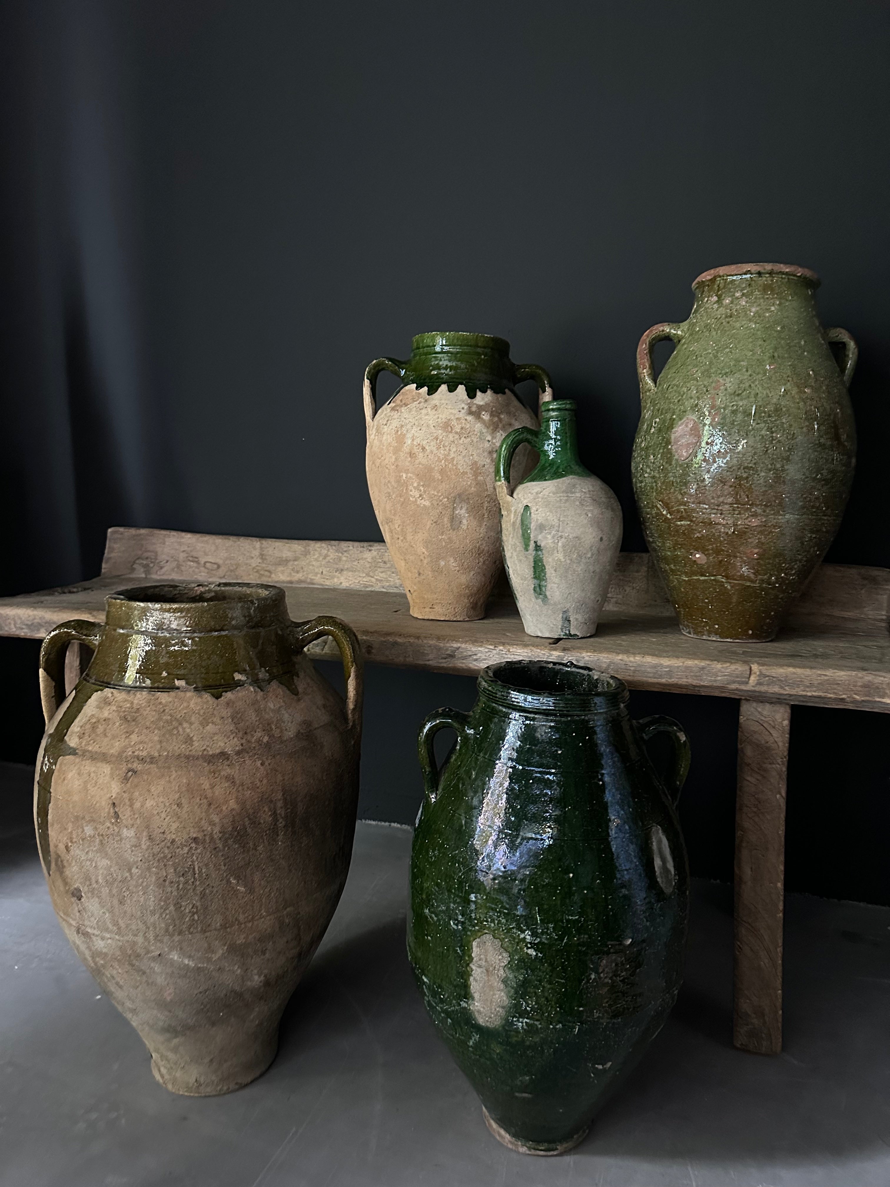 Diese alte Pottery ist wunderschön je nach Topf in verschiedenen Grüntönen glasiert und besticht durch einen eleganten Hals und seitliche Griffe.