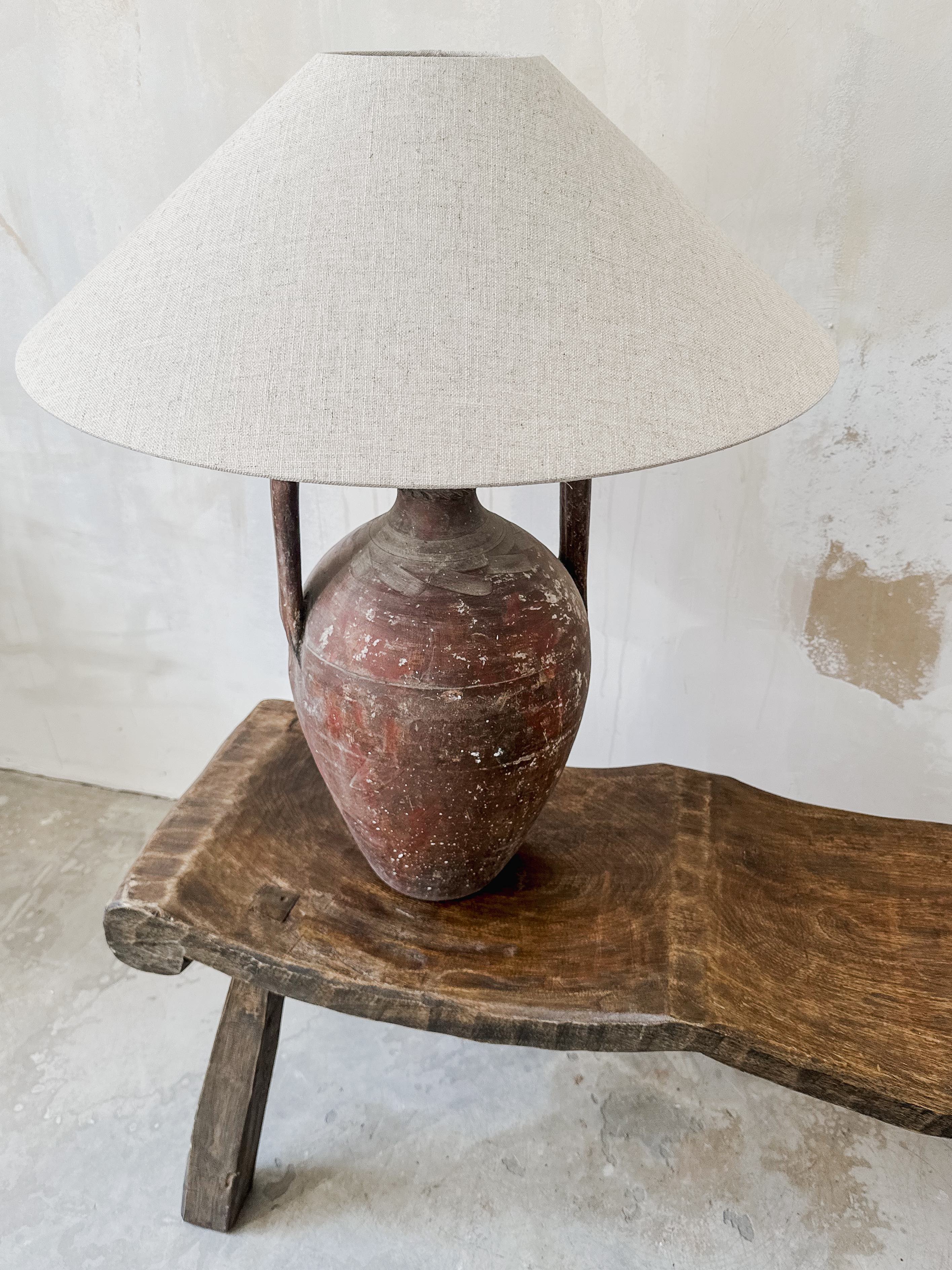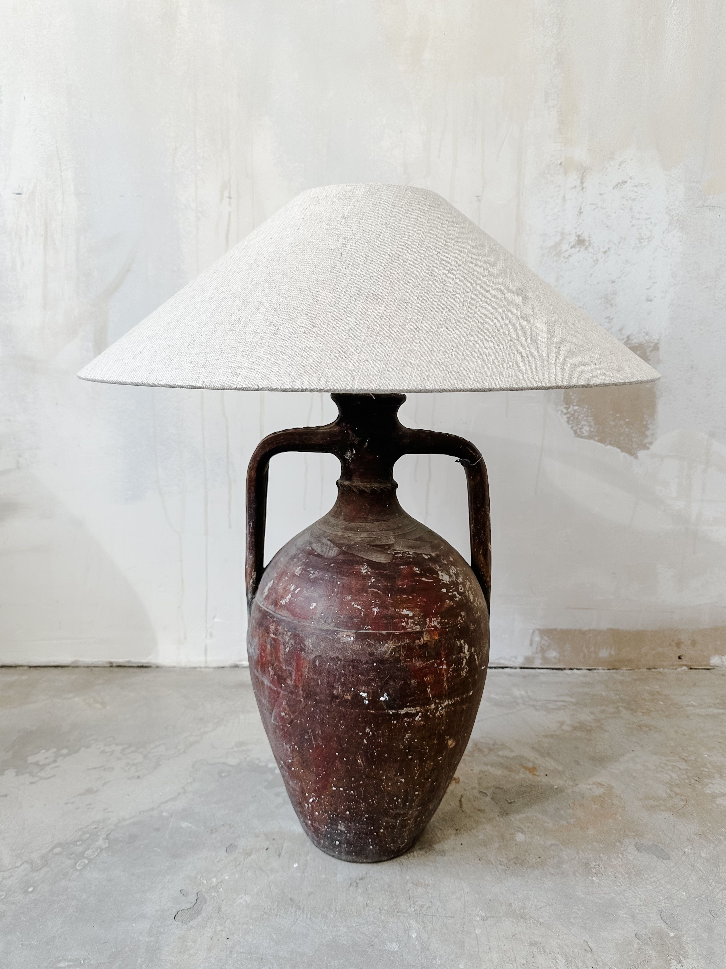 Diese traumhaft schöne Lampe besteht aus einer antiken Amphore von ca. 1900 und einem Lampenschirm aus natürlichem Leinen. Ein einzigartiges Stück in jedem Zuhause!