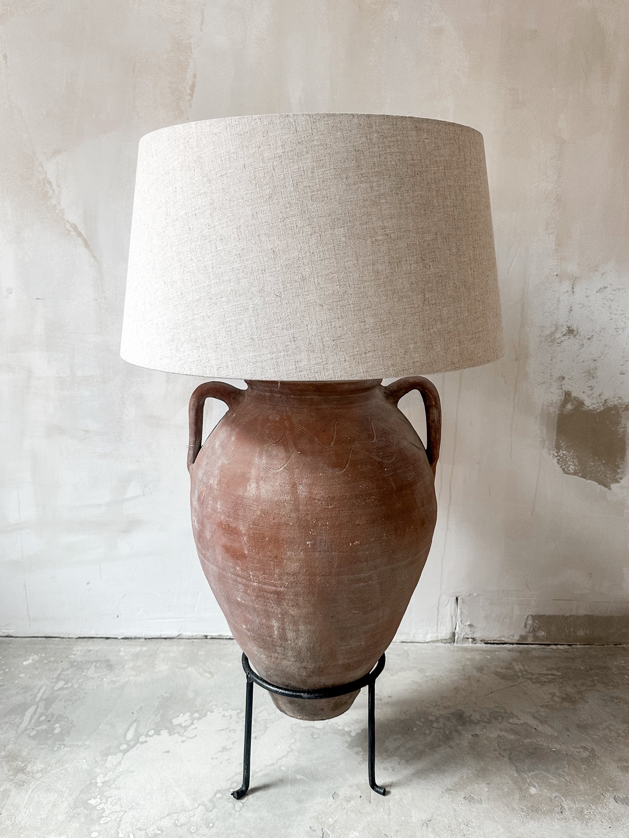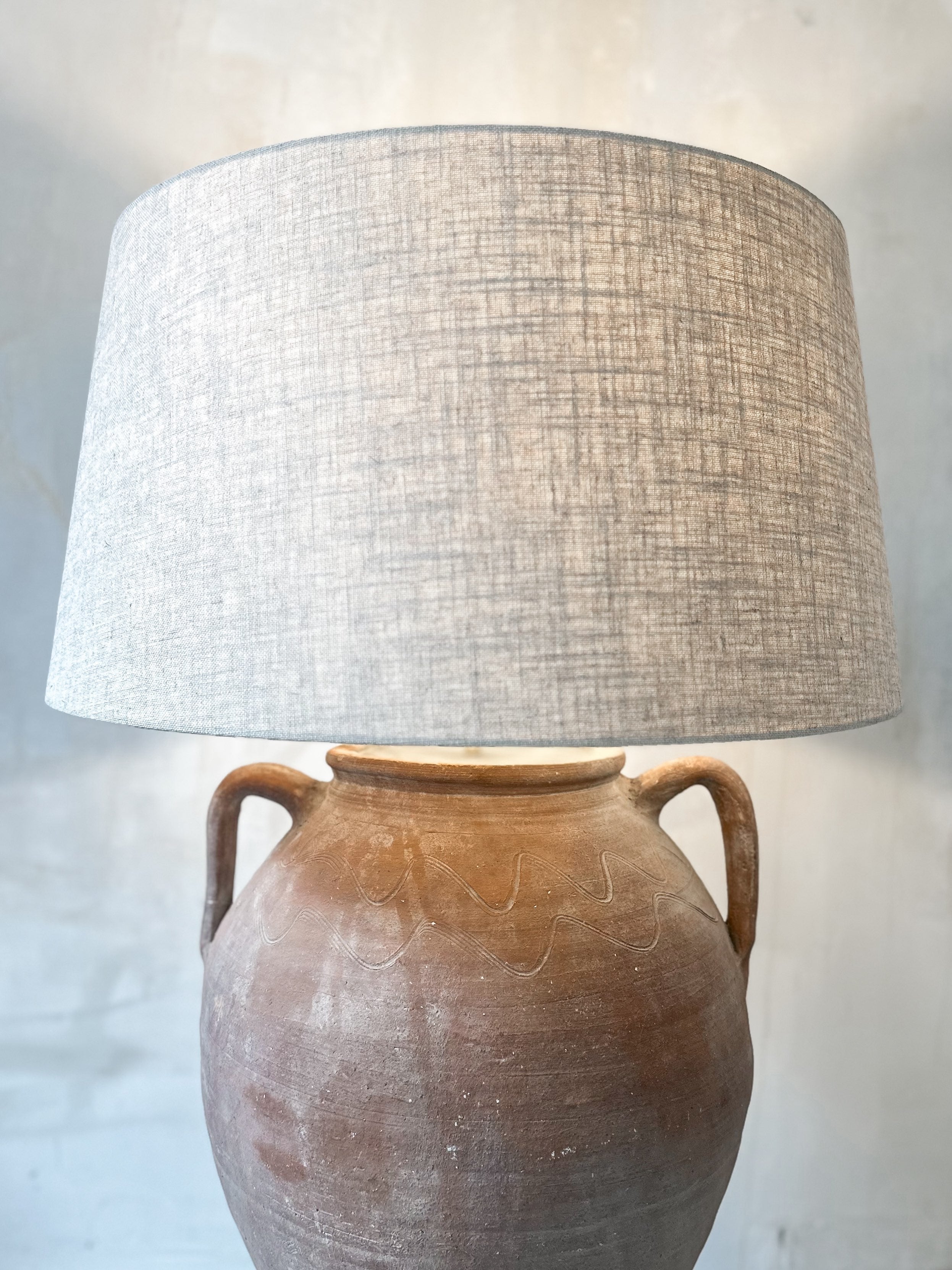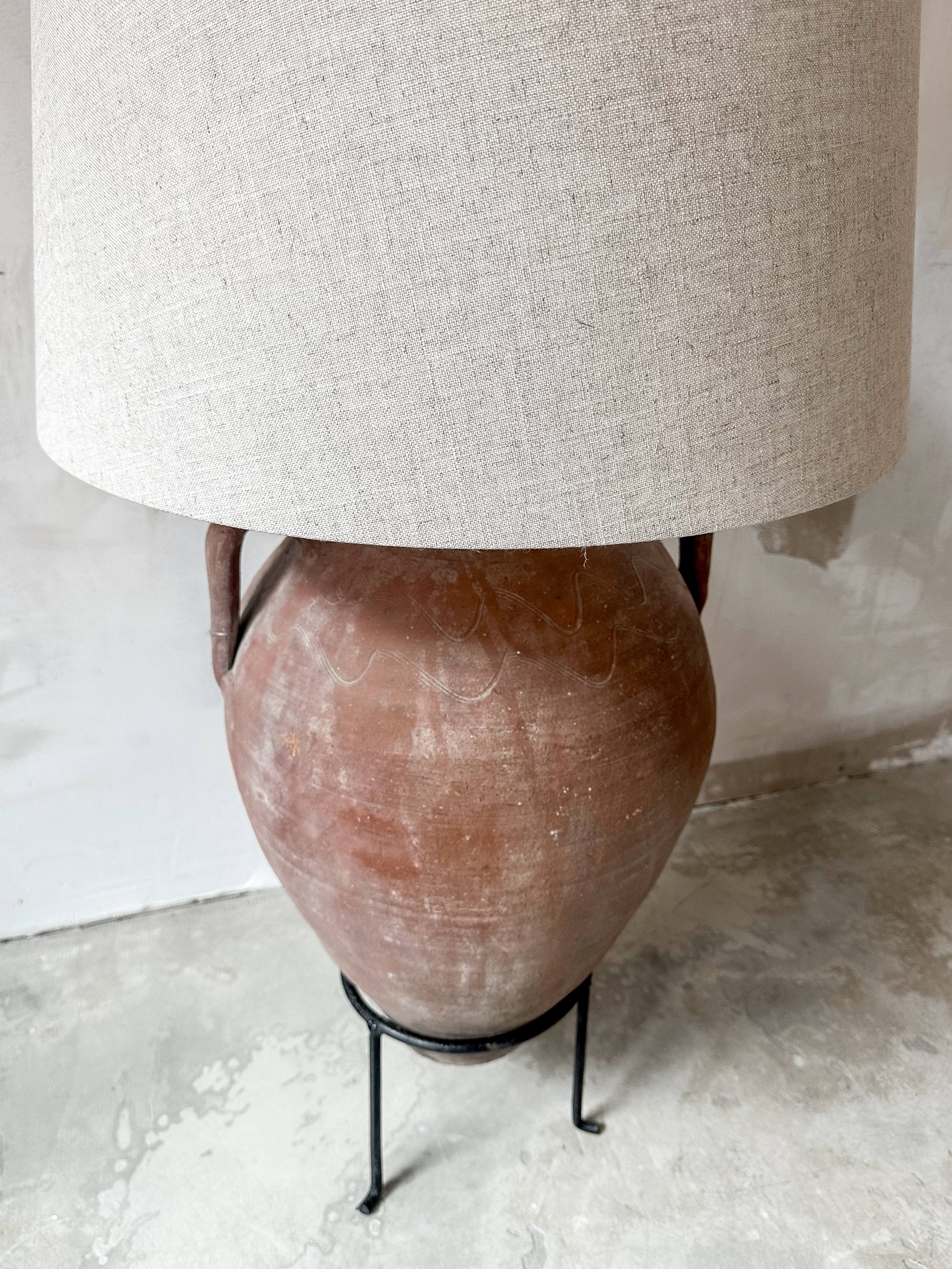 Der Lampenfuß ist aus einem antiken Terrakotta-Topf (ungefähr von 1850) aus Anatolien in der Türkei gefertigt. In diesen Töpfen wurden Olivenöl, Honig, Wasser oder Wein aufbewahrt. Das Material des großen Lampenschirms ist aus natürlichem Leinen. Der Metallfuß sorgt für einen festen Stand.