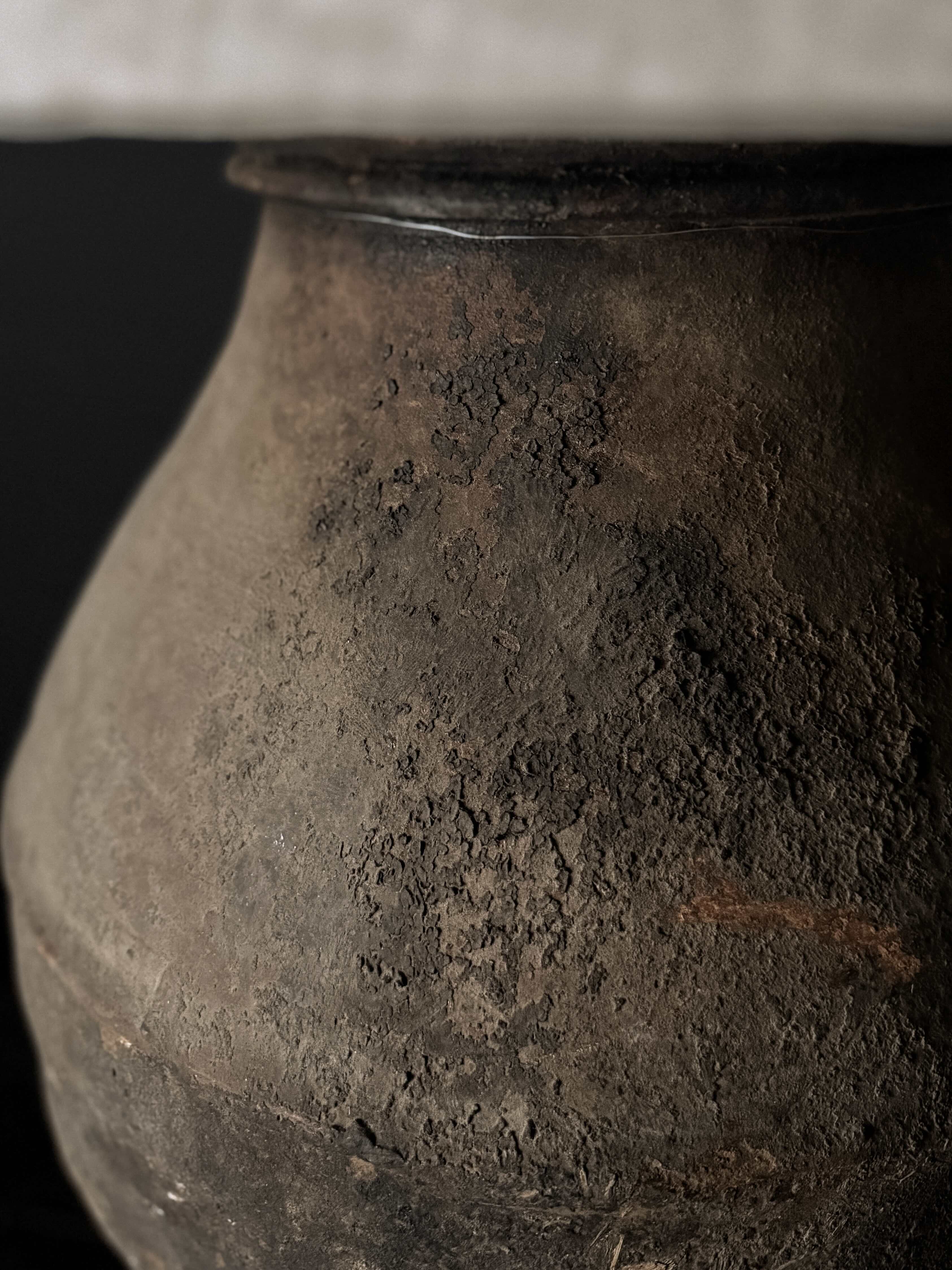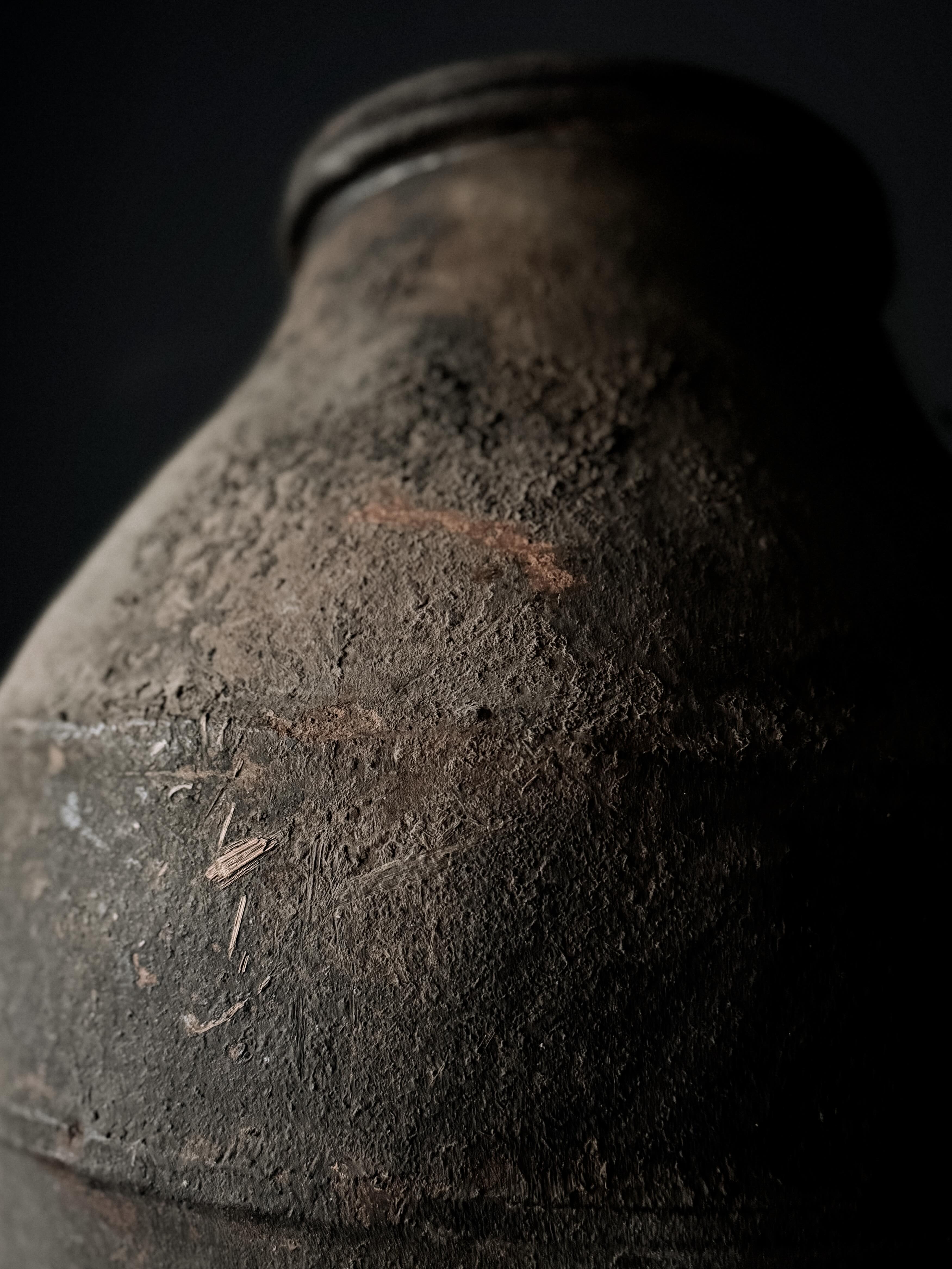 ein bauchiges Tongefäß, das am Rand eines staubigen Weges stand – irgendwo zwischen kleinen Dörfern, in denen der Wind Geschichten erzählt. Vielleicht trug Wasser für eine Familie, die früh am Morgen ihre Felder bestellte. Die schmalen Ringe, die seinen Körper umschließen, entstanden unter den Händen eines Töpfers, der den Ton ruhig und sicher drehte.