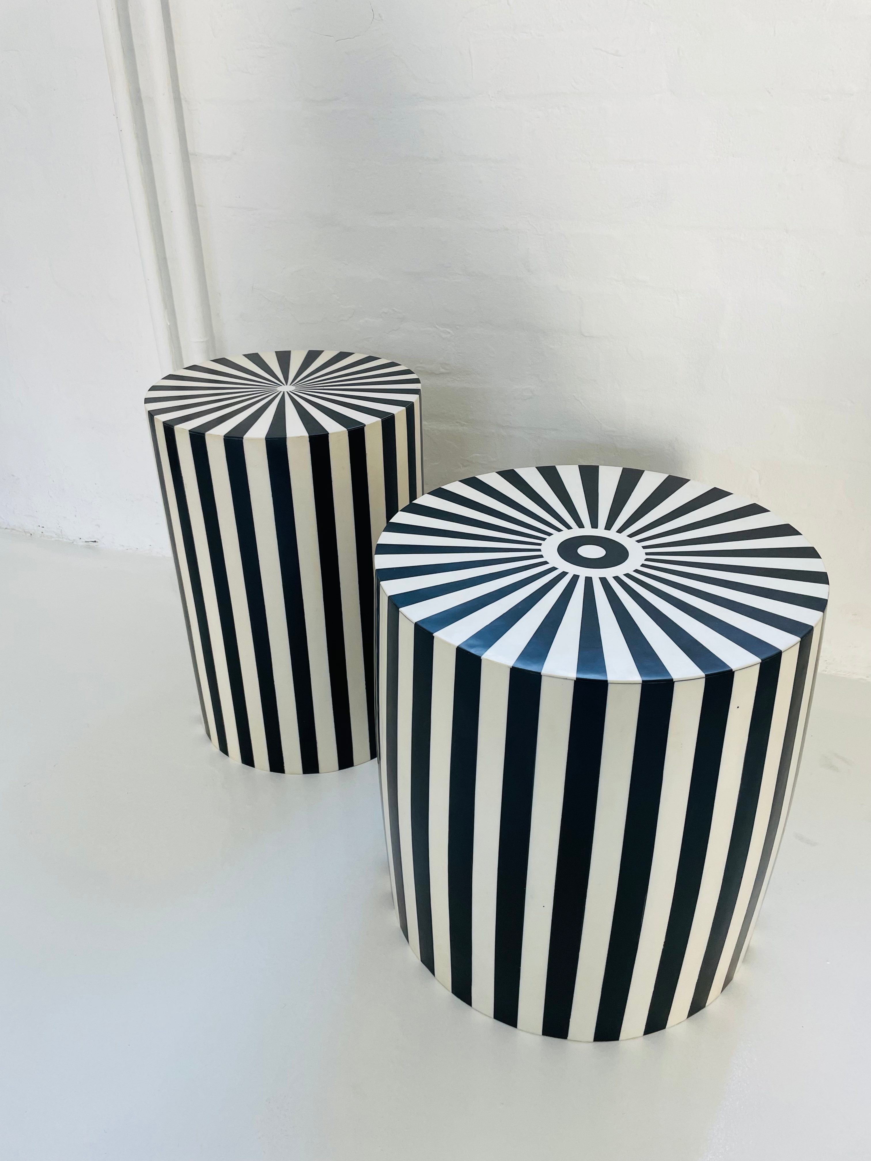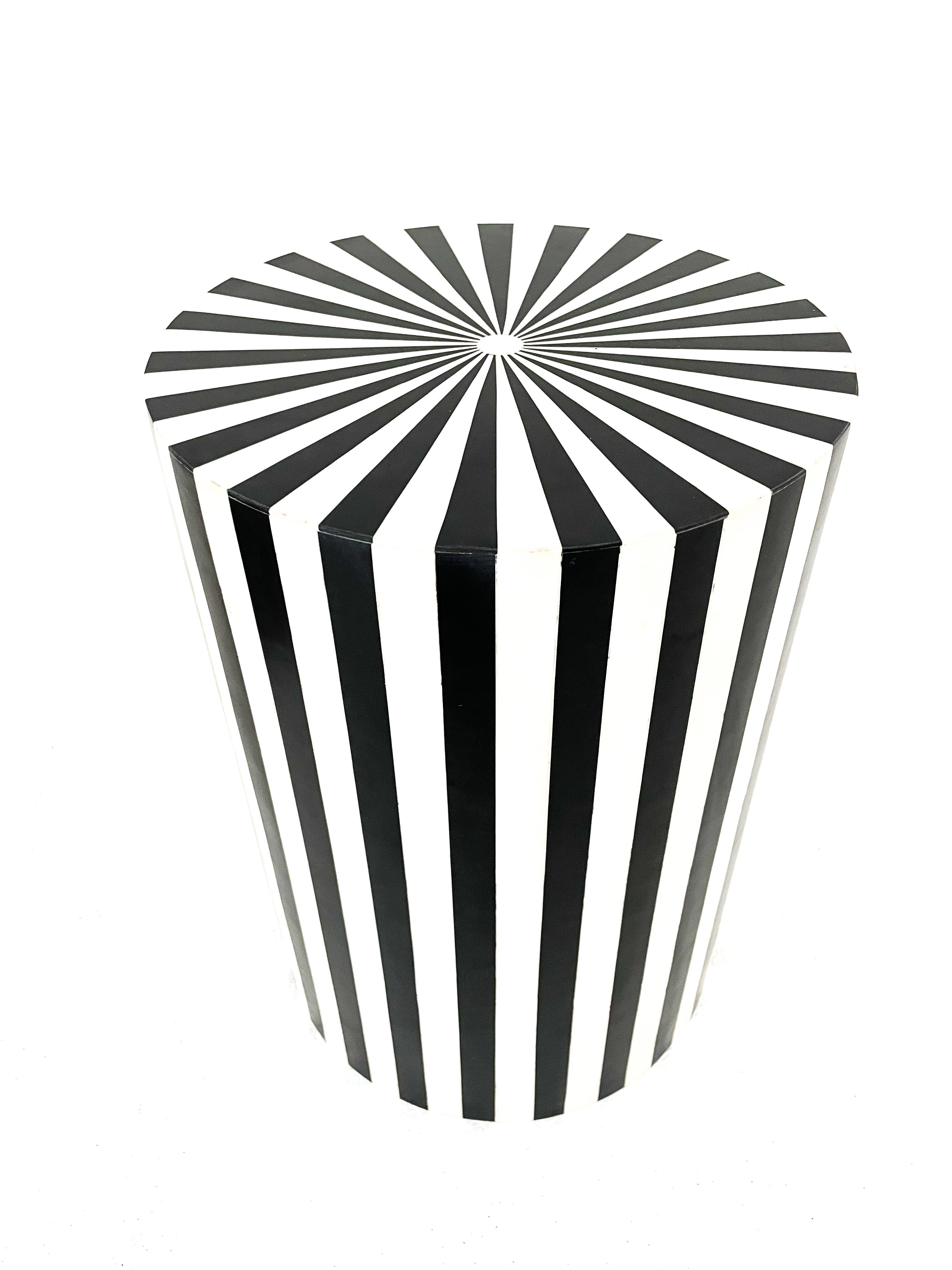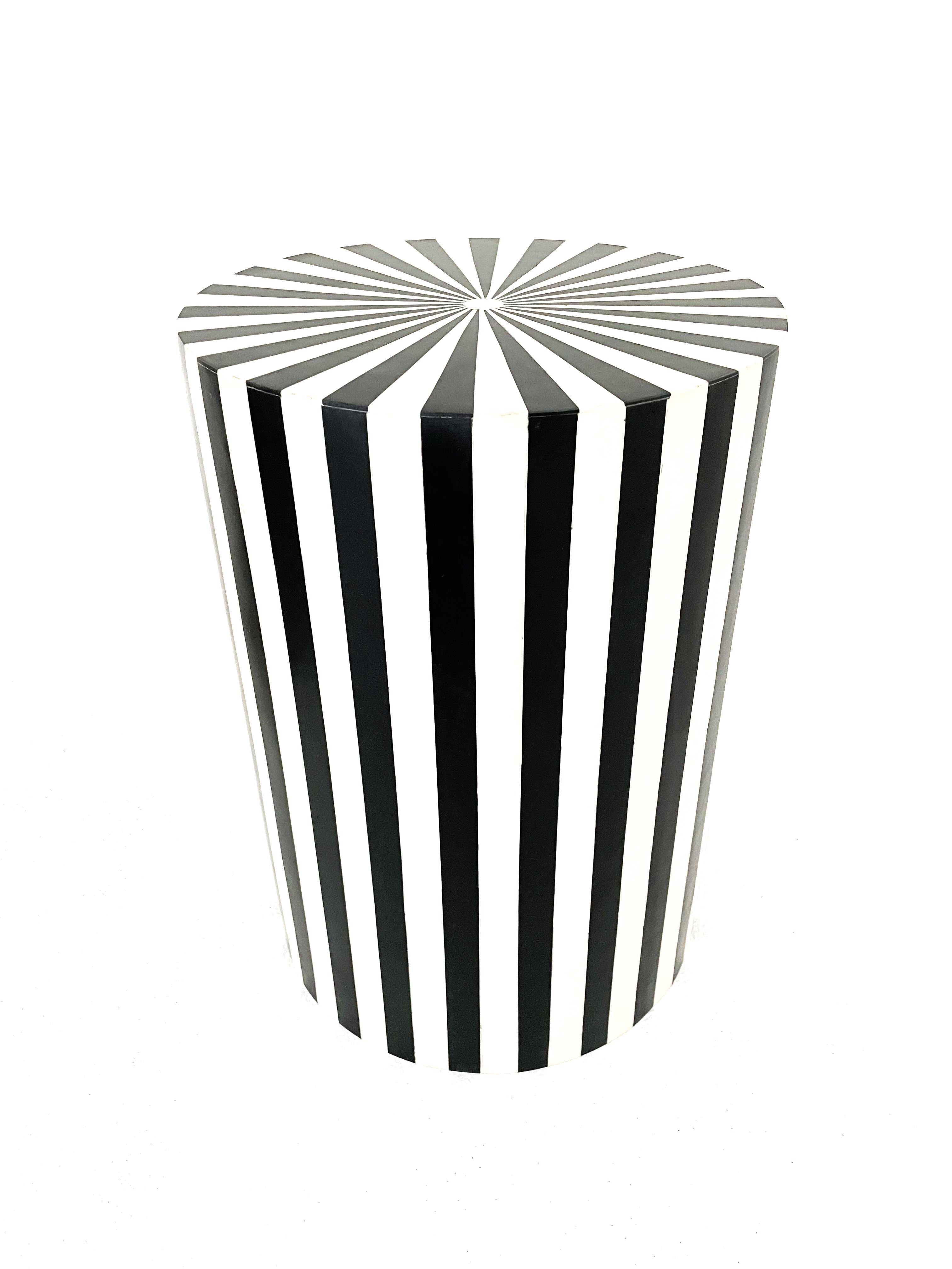 Der Beistelltisch in Zylinderform ist mit seinem strahlenförmigen Schwarz-Weiß-Muster definitiv ein außergewöhnlicher Blickfang und garantiert ein einzigartiges Design. Der Korpus sorgt durch den Holzrahmen für Stabilität, die Oberfläche ist in hochwertiger Handwerkskunst aus Knochen gefertigt.