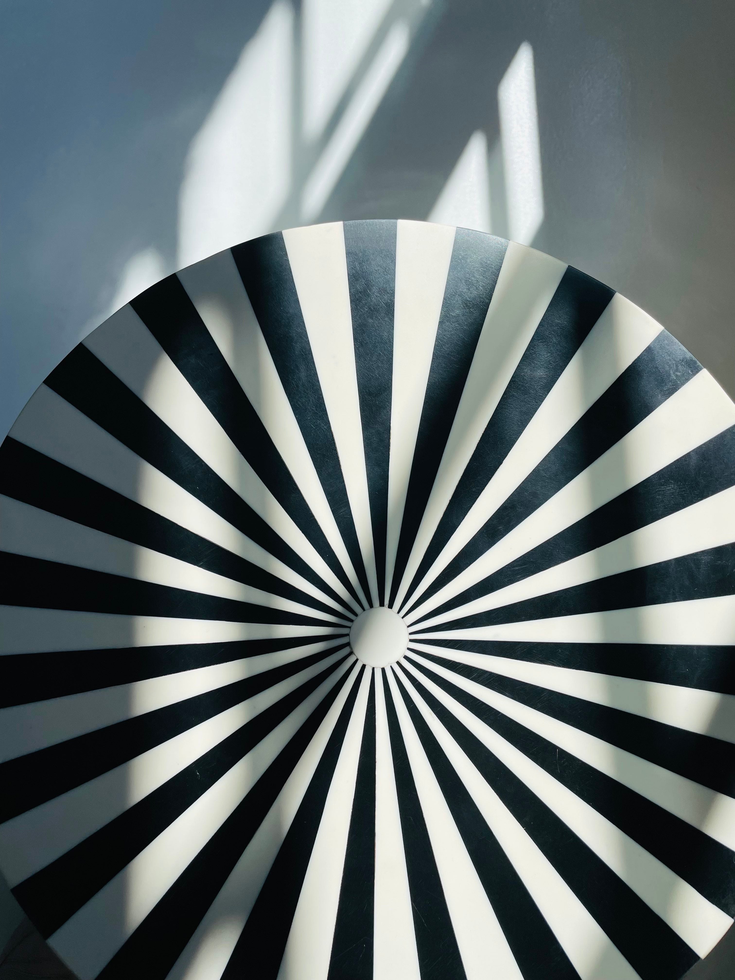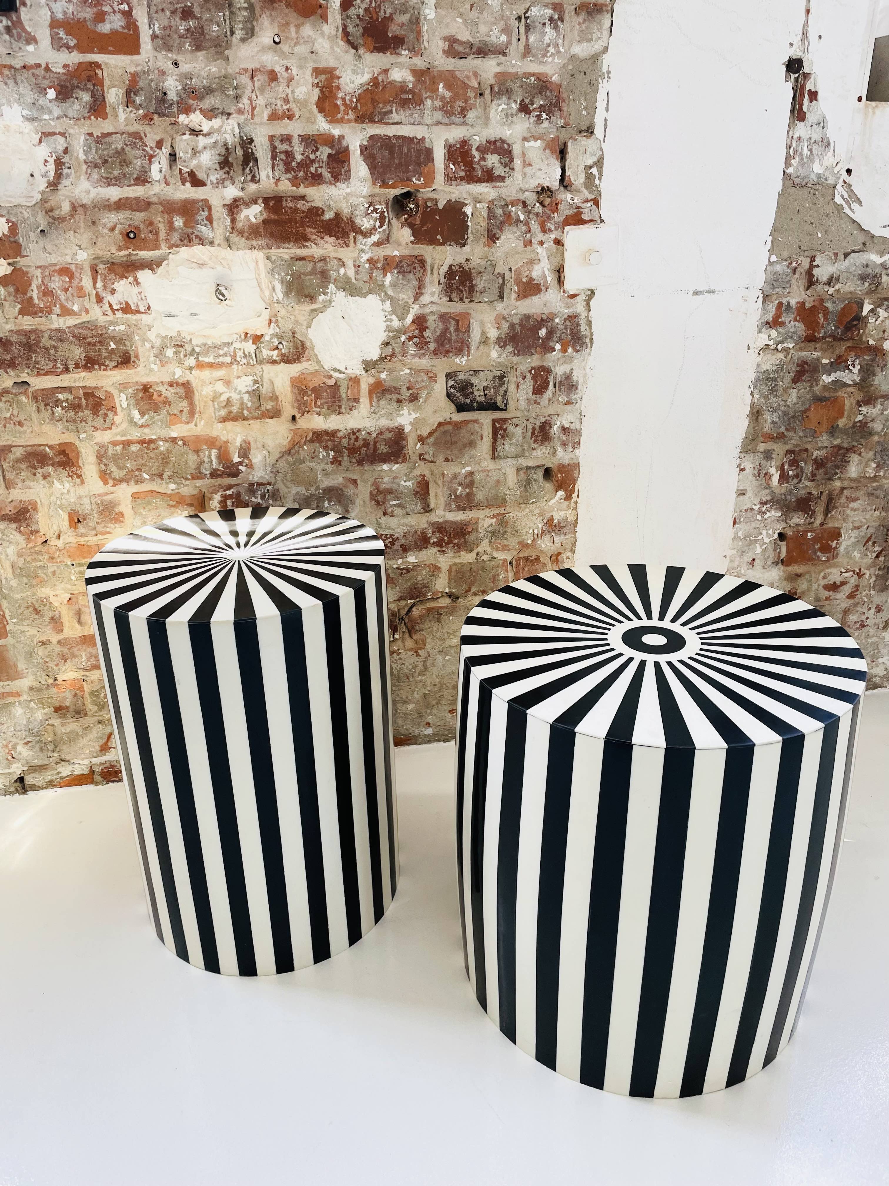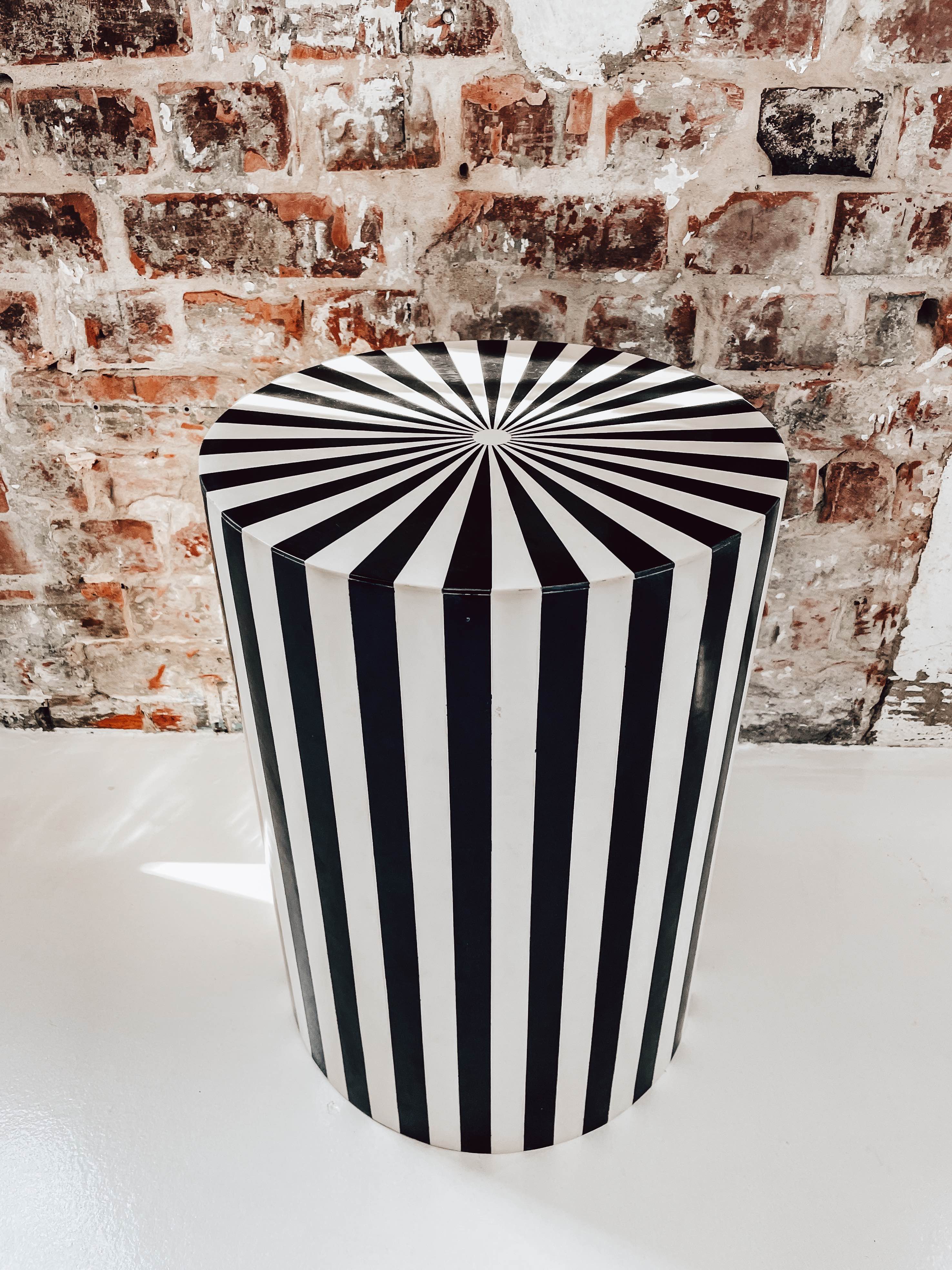 Der Beistelltisch in Zylinderform ist mit seinem strahlenförmigen Schwarz-Weiß-Muster definitiv ein außergewöhnlicher Blickfang und garantiert ein einzigartiges Design. Der Korpus sorgt durch den Holzrahmen für Stabilität, die Oberfläche ist in hochwertiger Handwerkskunst aus Knochen gefertigt.