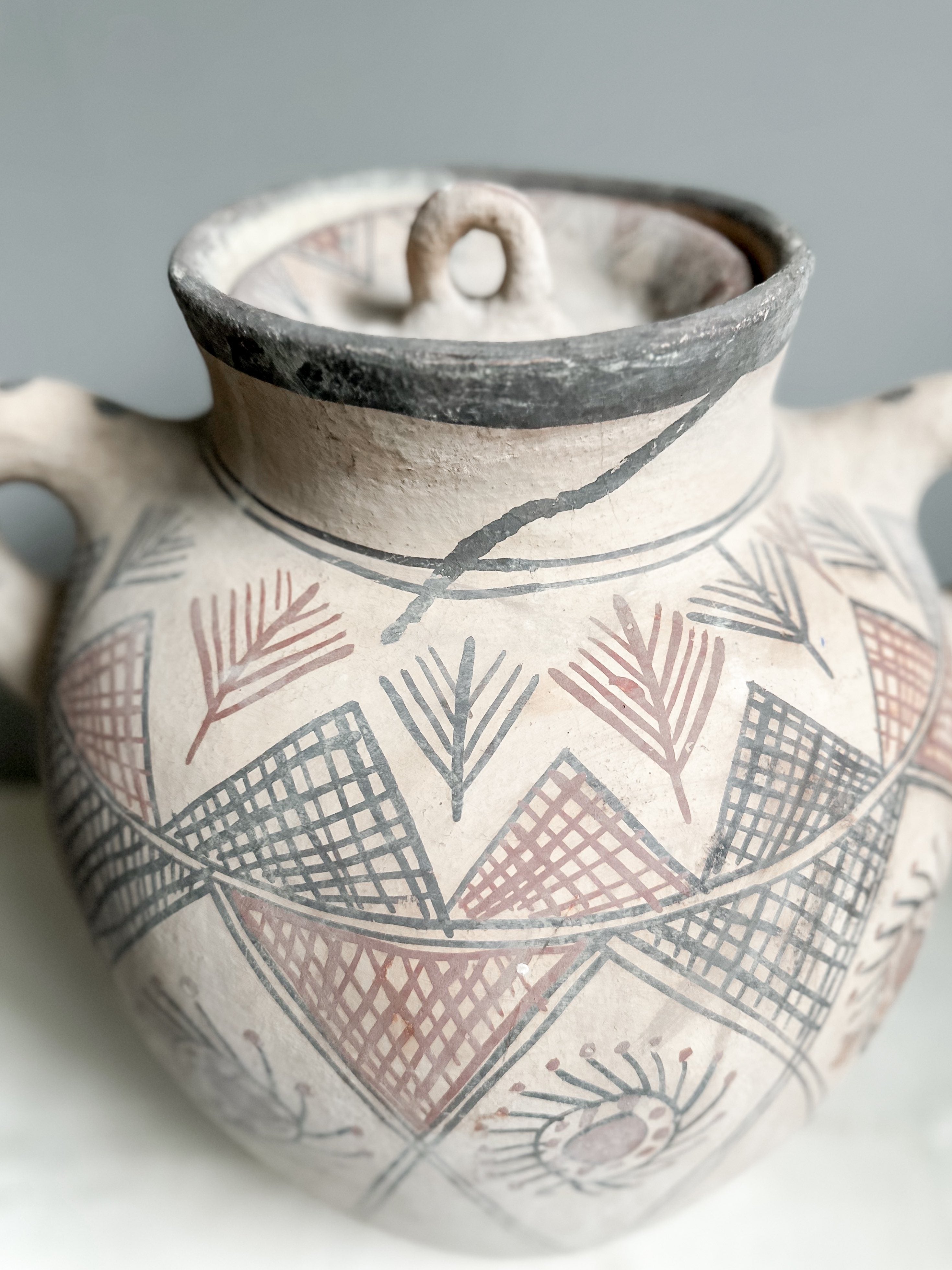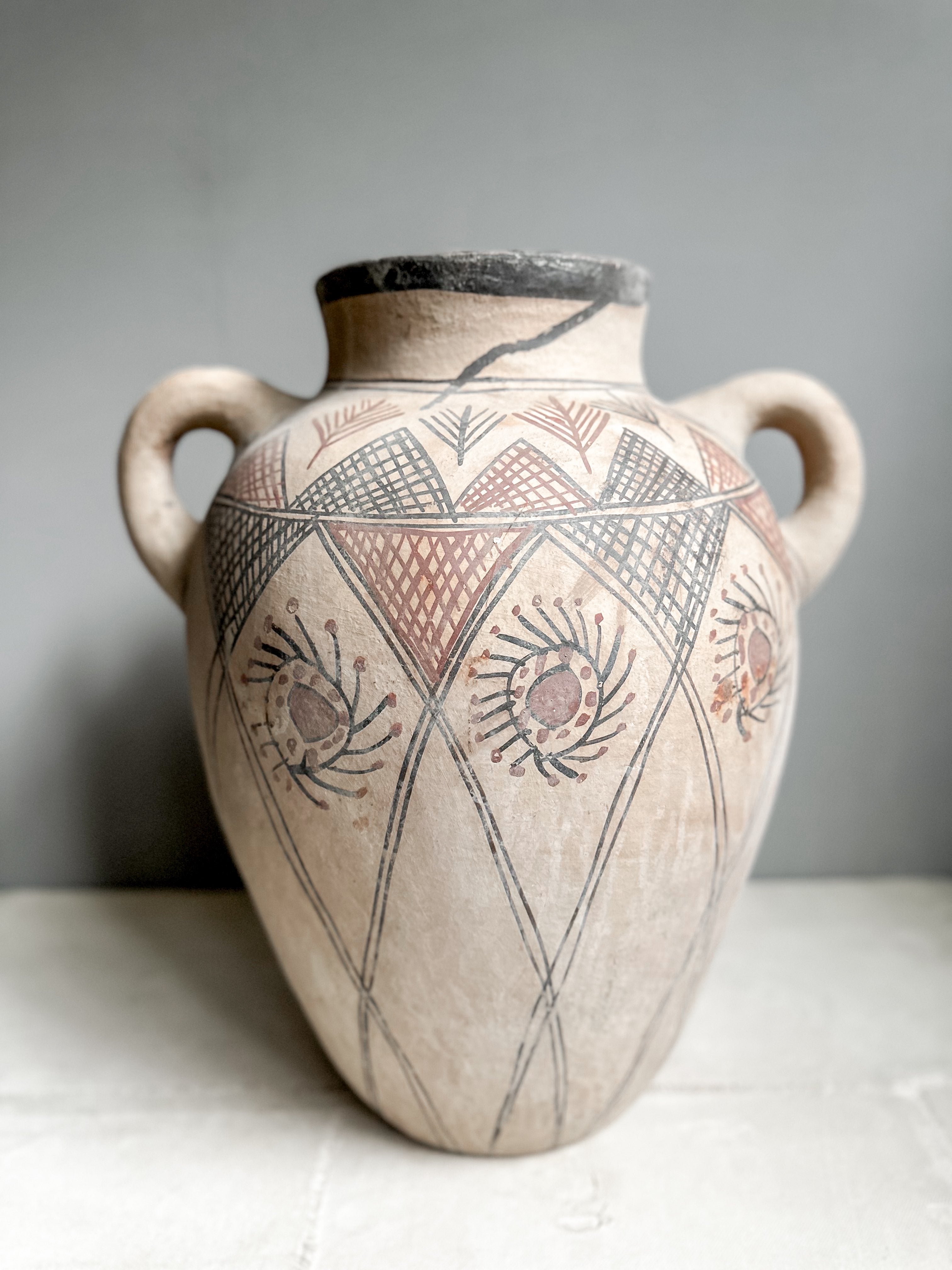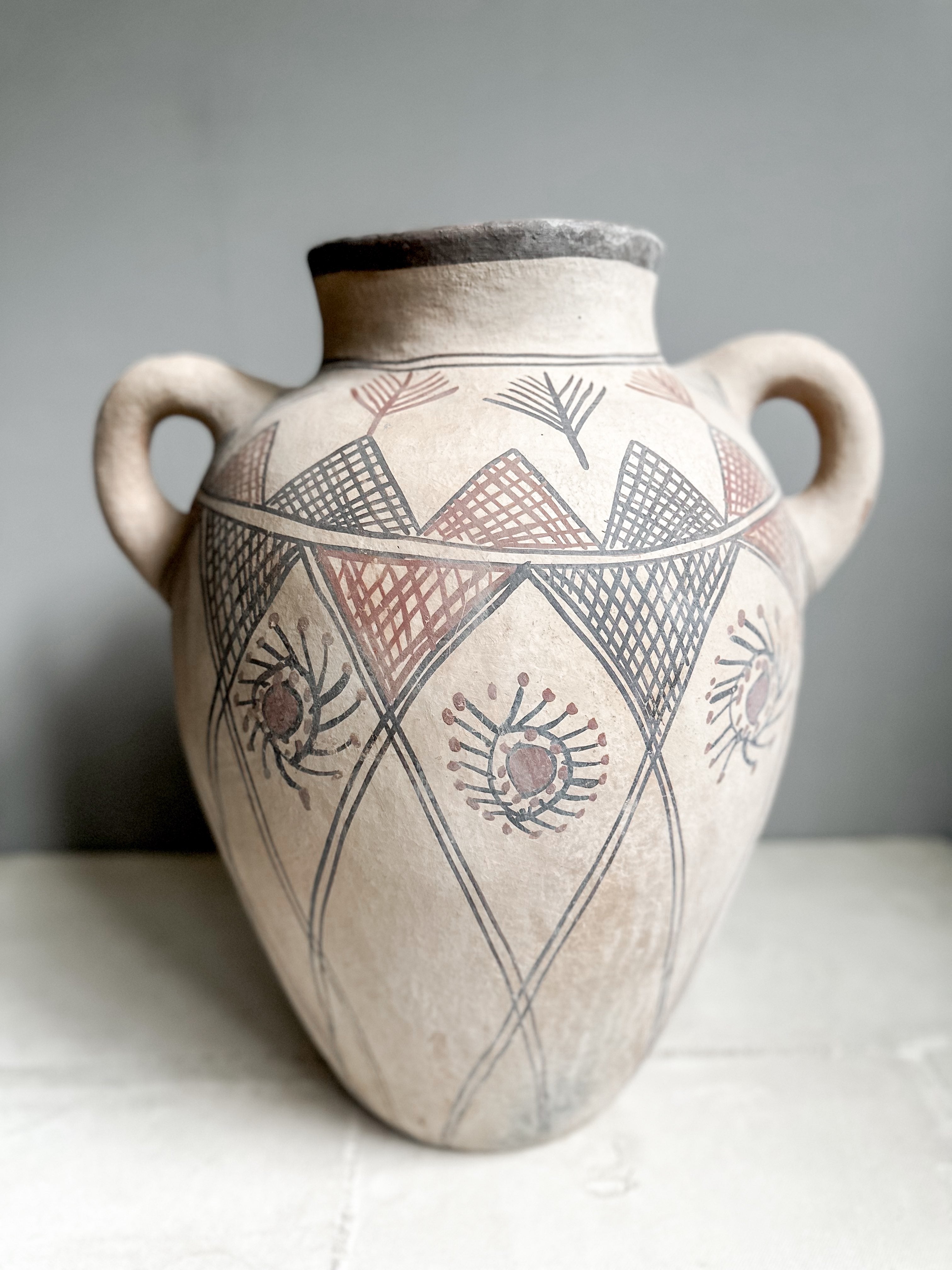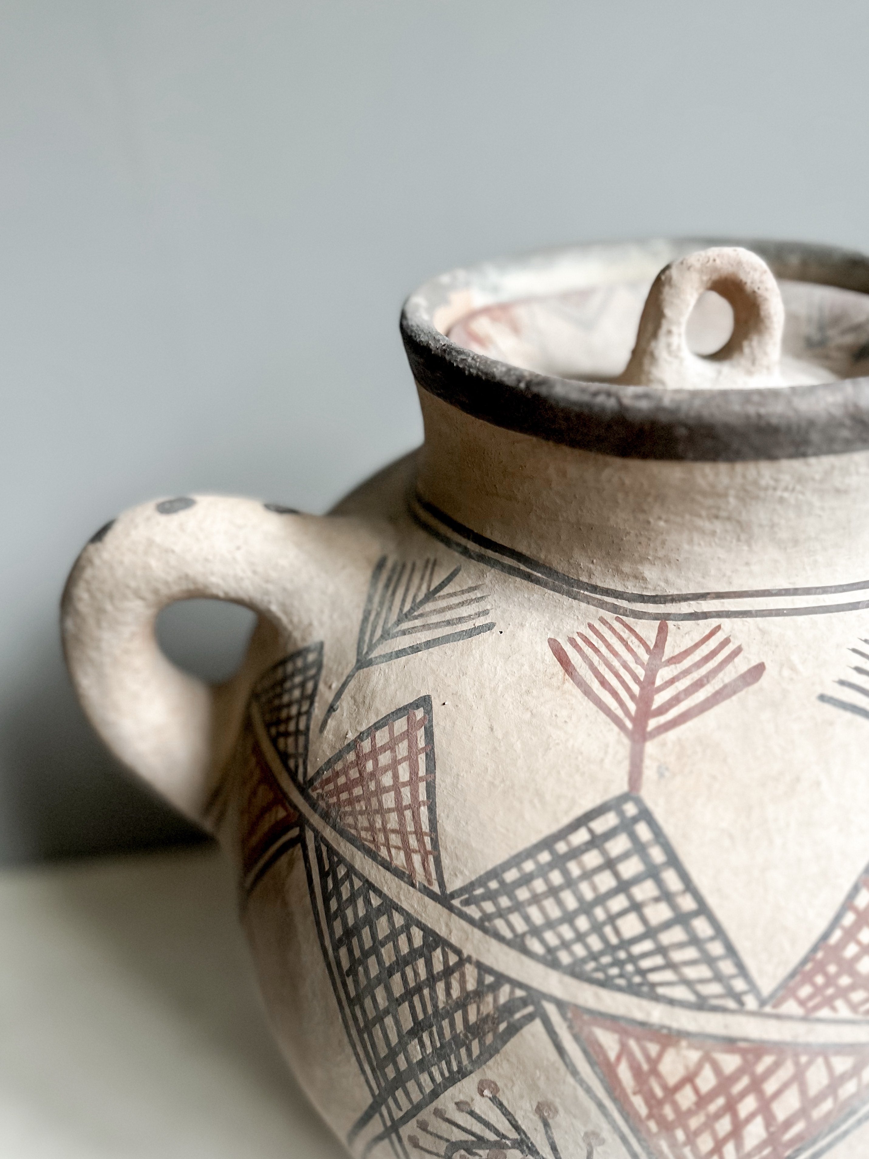 Diese Töpfe werden von den wundervollen Frauen im Rif Gebirge im Norden Marokkos handgefertigt. Die Pottery wird aus lokalem Ton hergestellt und auf offenem Feuer gebrannt. Die geometrischen Muster sind sorgfältig von Hand bemalt und stets einzigartig inspiriert von alter Felsenmalerei.