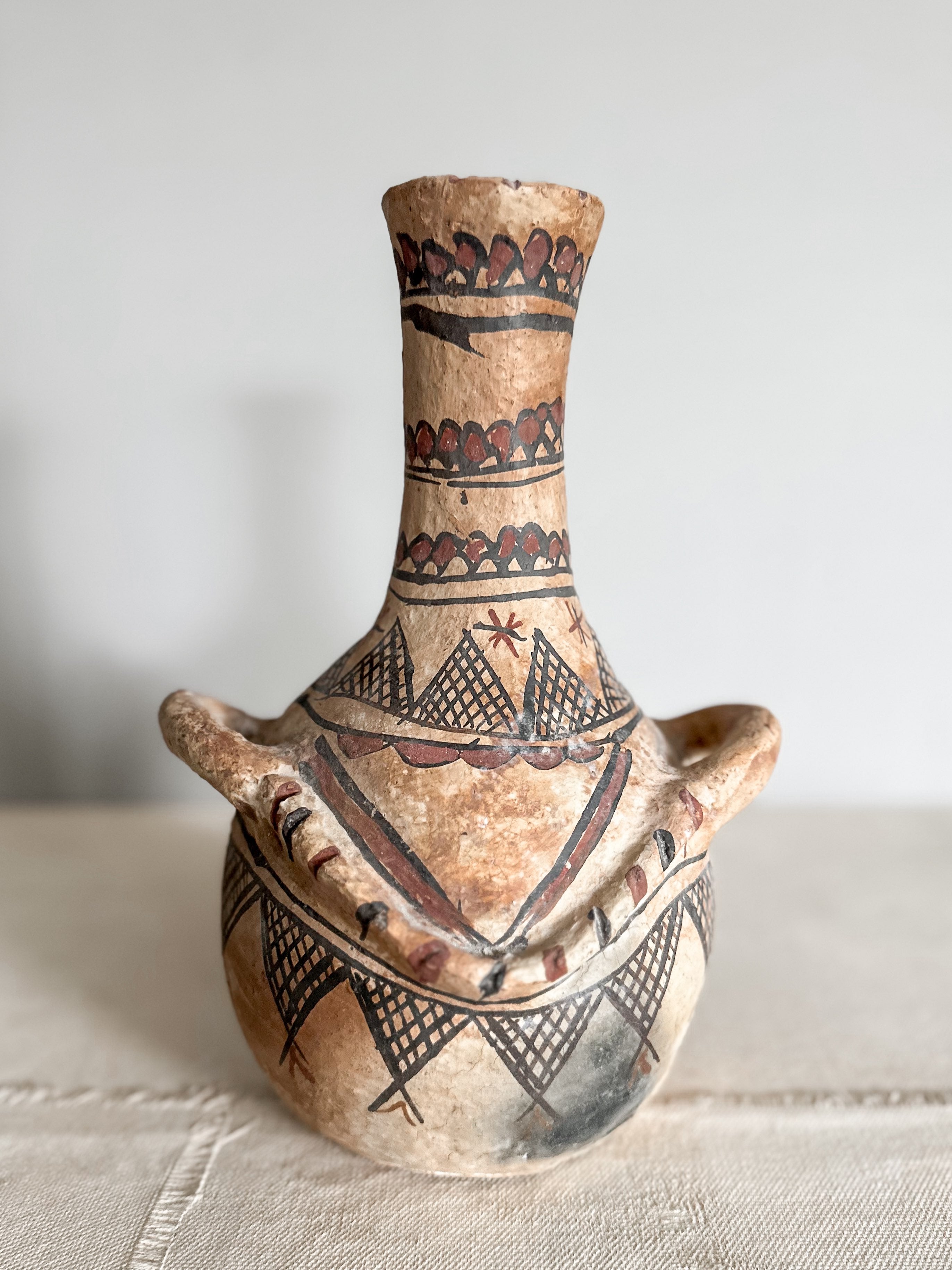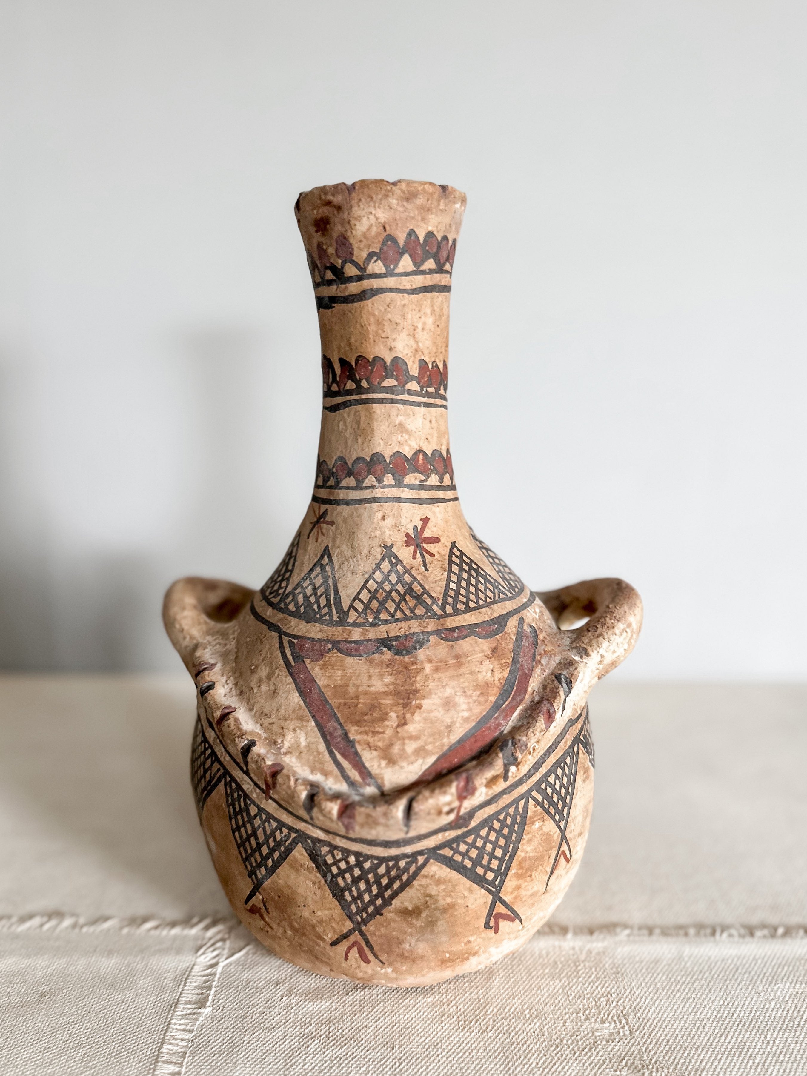 Diese Töpfe werden von den wundervollen Frauen im Rif Gebirge im Norden Marokkos handgefertigt. Die Pottery wird aus lokalem Ton hergestellt und auf offenem Feuer gebrannt. Die geometrischen Muster sind sorgfältig von Hand bemalt und stets einzigartig inspiriert von alter Felsenmalerei.