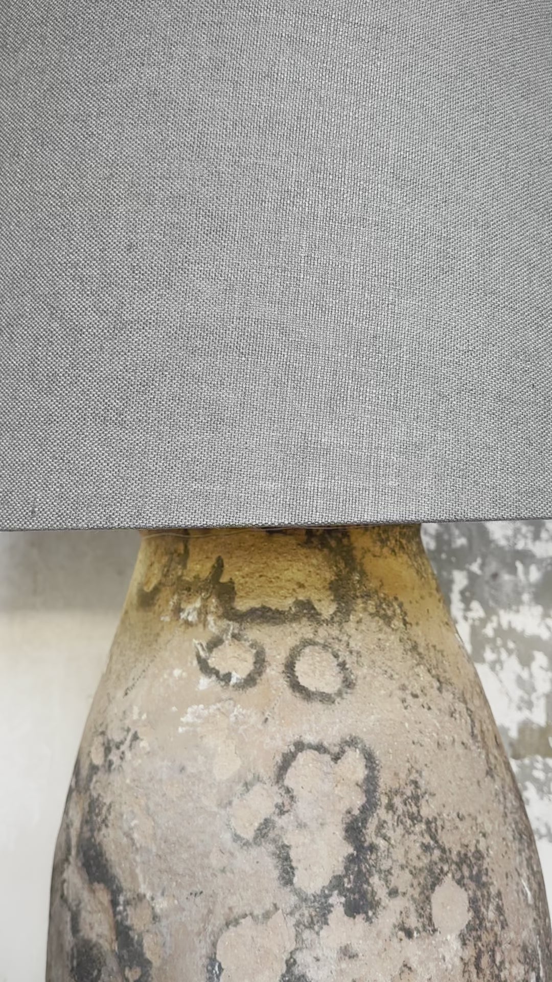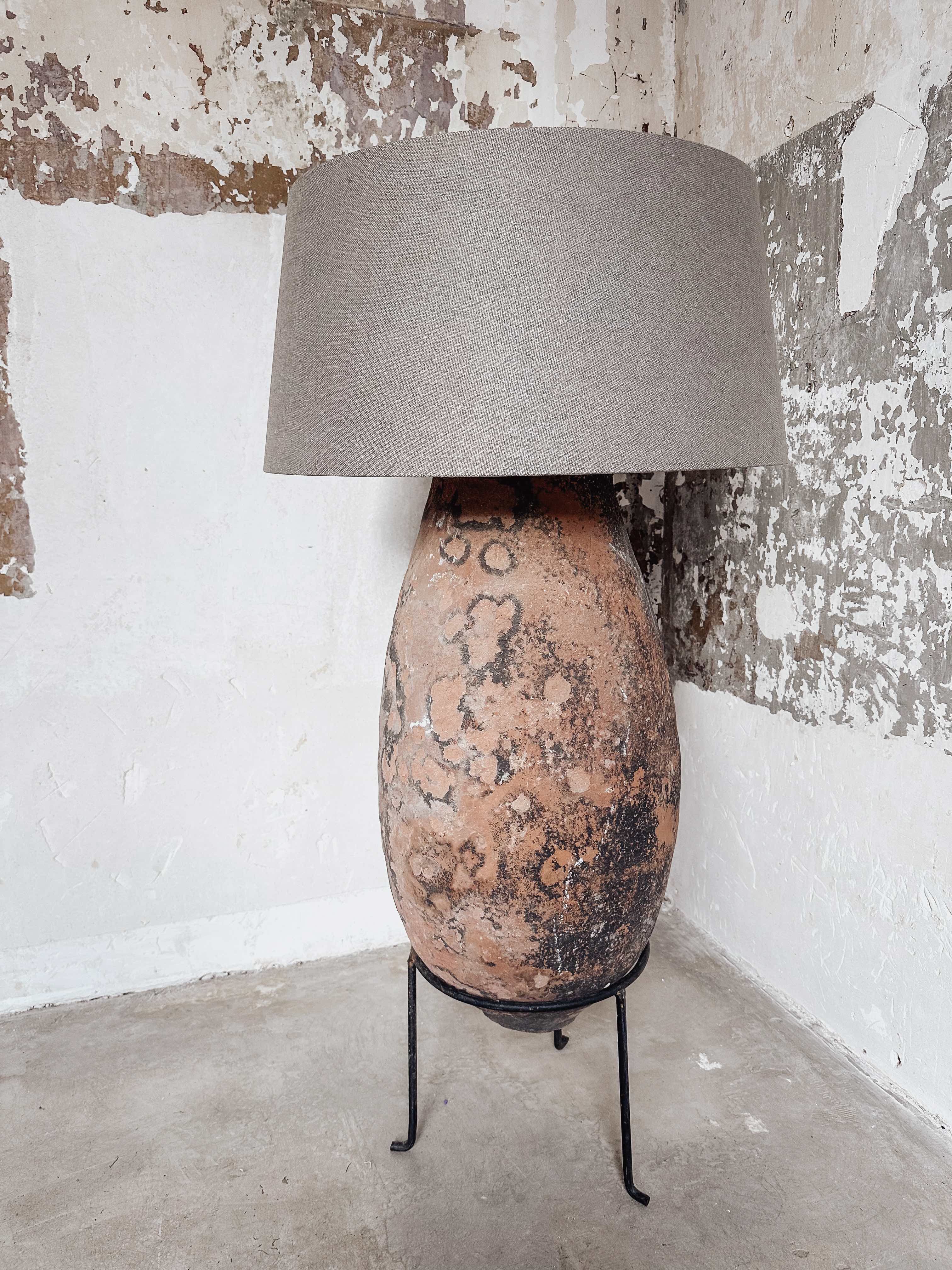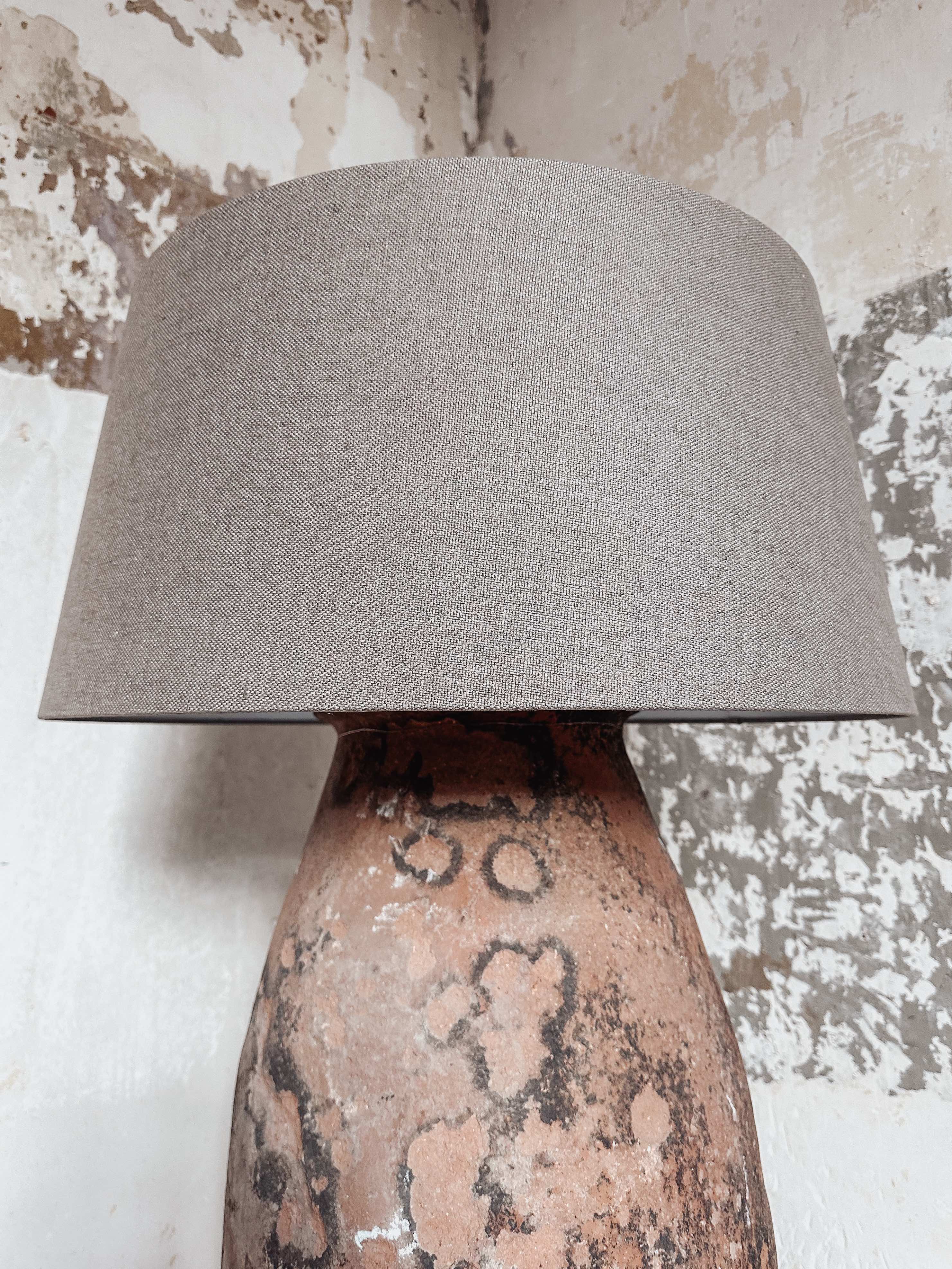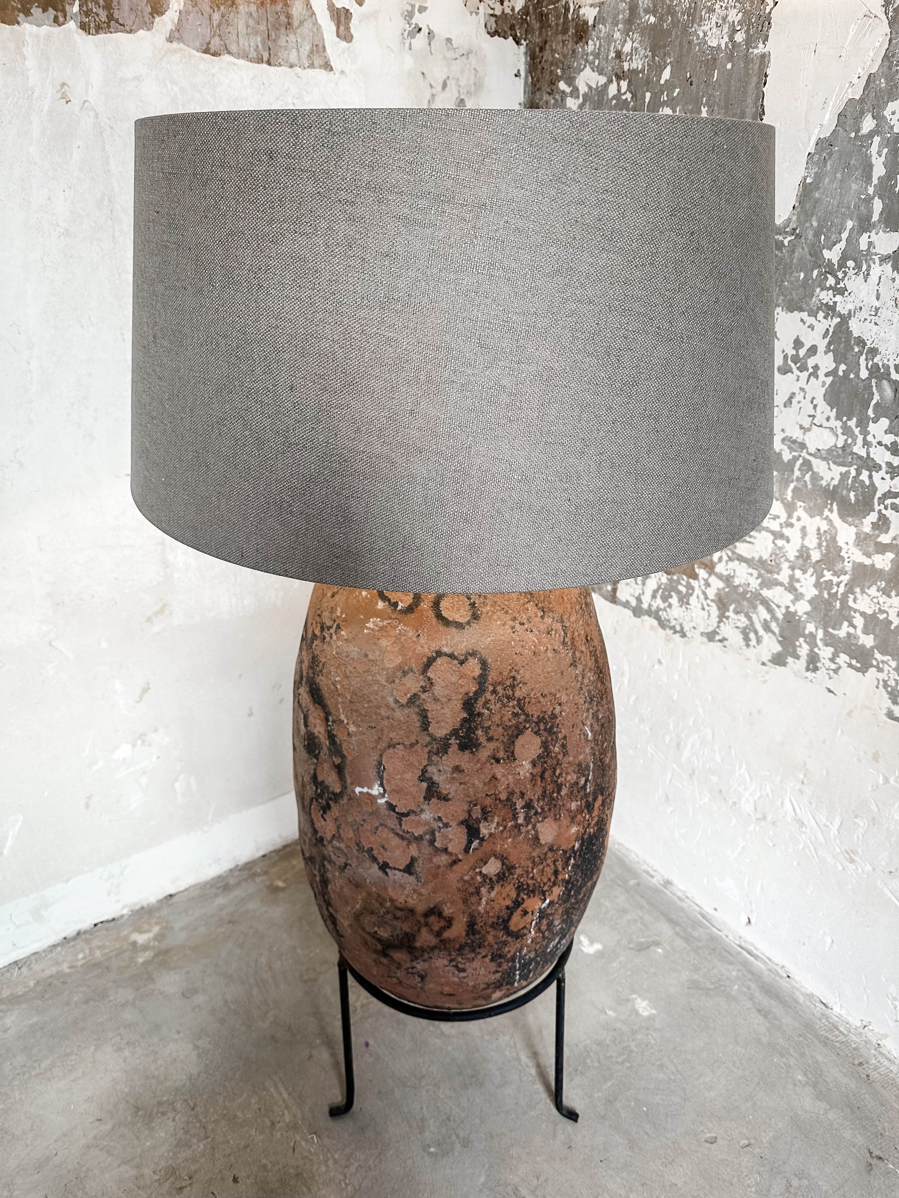 Der Lampenfuß ist aus einem antiken Terrakotta-Topf (ungefähr von 1800) aus Anatolien in der Türkei gefertigt. In diesen Töpfen wurden Olivenöl, Honig, Wasser oder Wein aufbewahrt. Das Material des großen Lampenschirms ist Leinen in taupe. Der Metallfuß sorgt für einen festen Stand.