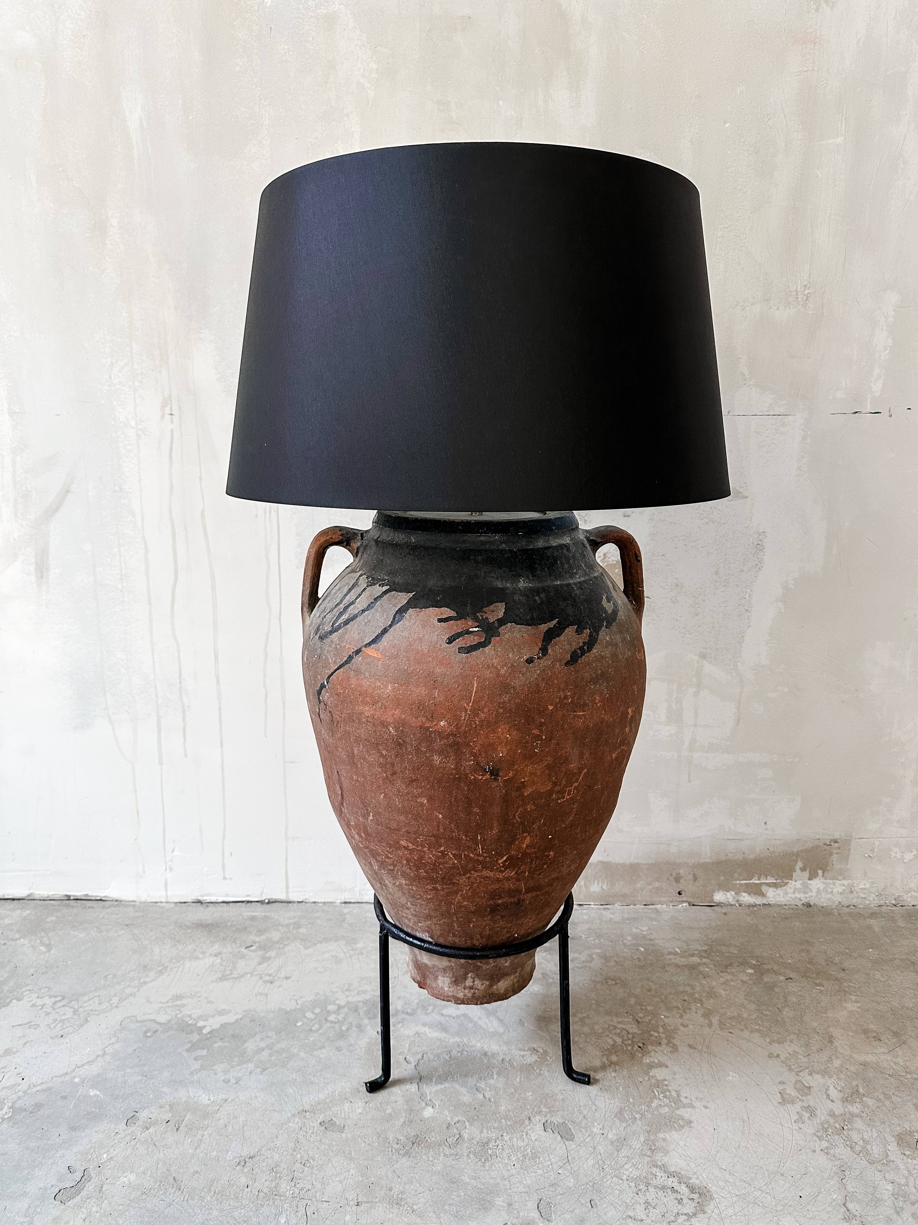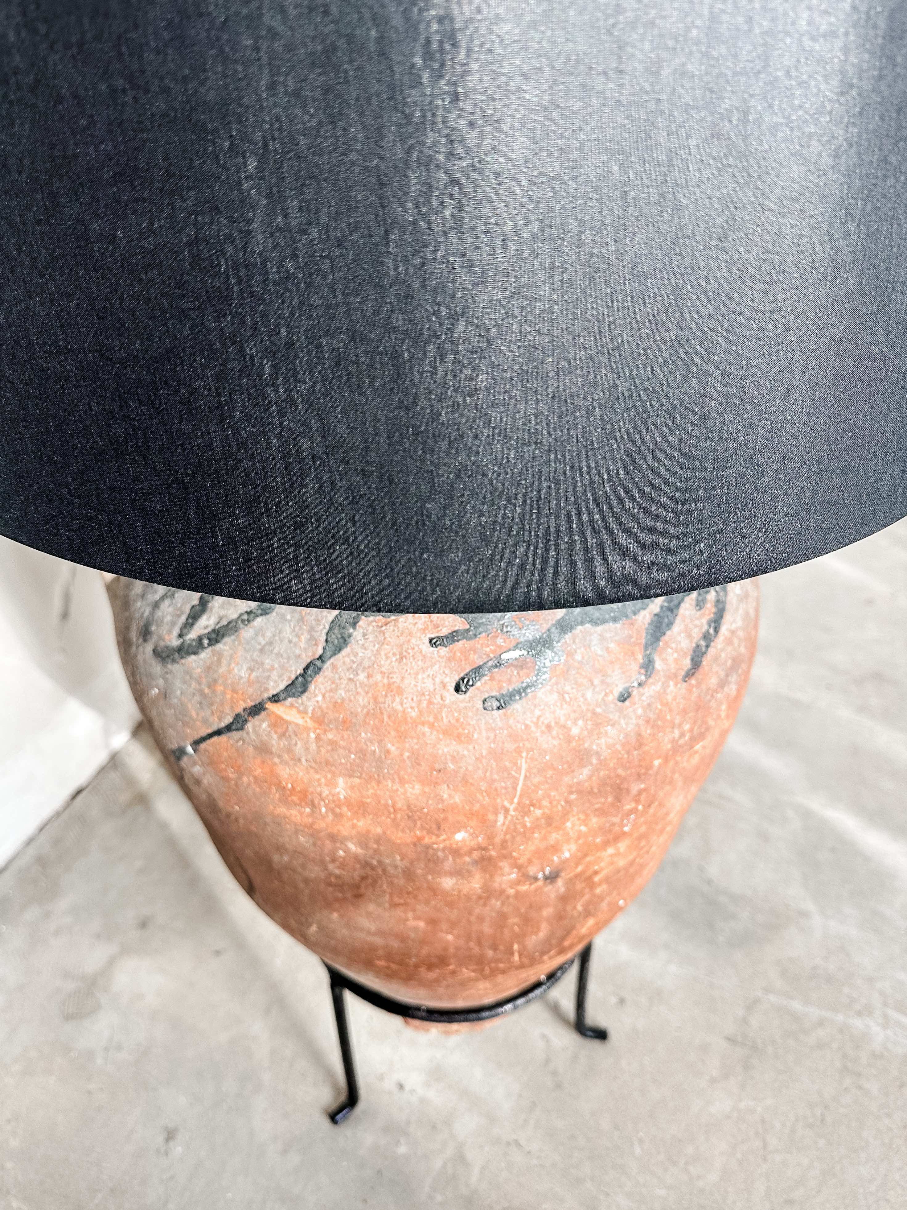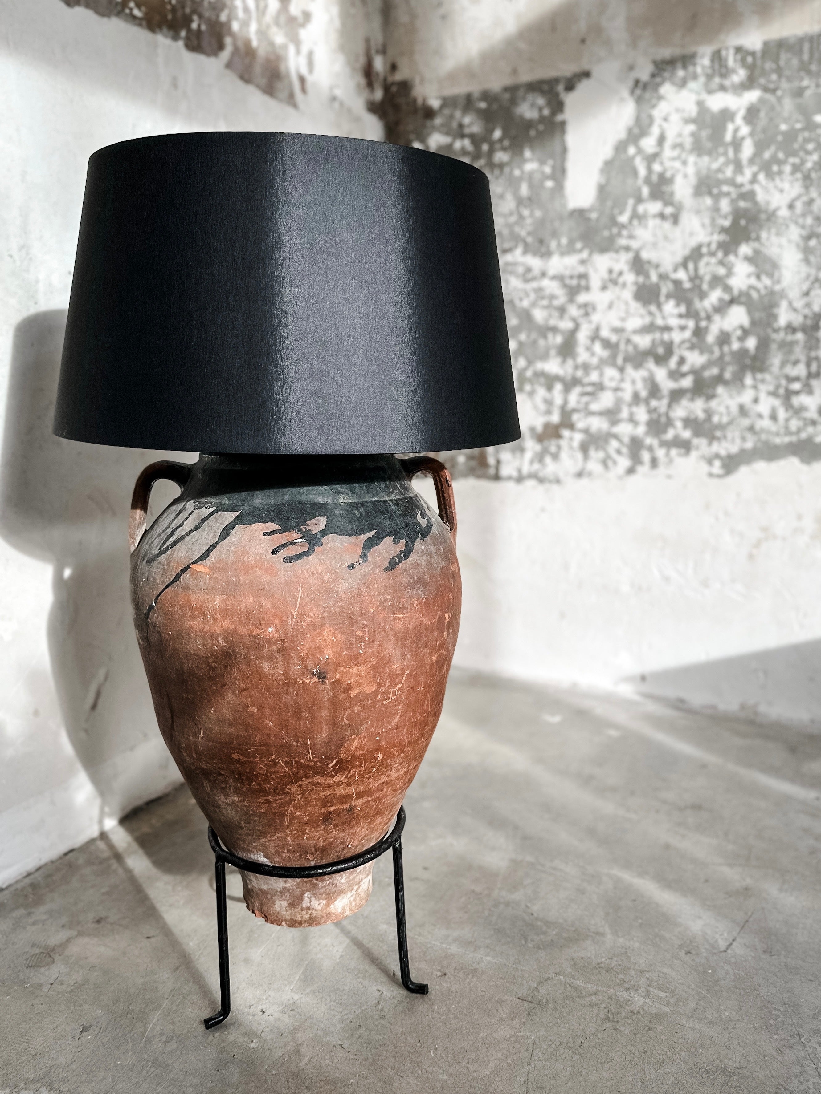 Der Lampenfuß ist aus einem antiken Terrakotta-Topf (ungefähr von 1850) aus Anatolien in der Türkei gefertigt. In diesen Töpfen wurden Olivenöl, Honig, Wasser oder Wein aufbewahrt. Das Material des großen Lampenschirms ist Chintz in schwarz. Der Metallfuß sorgt für einen festen Stand.