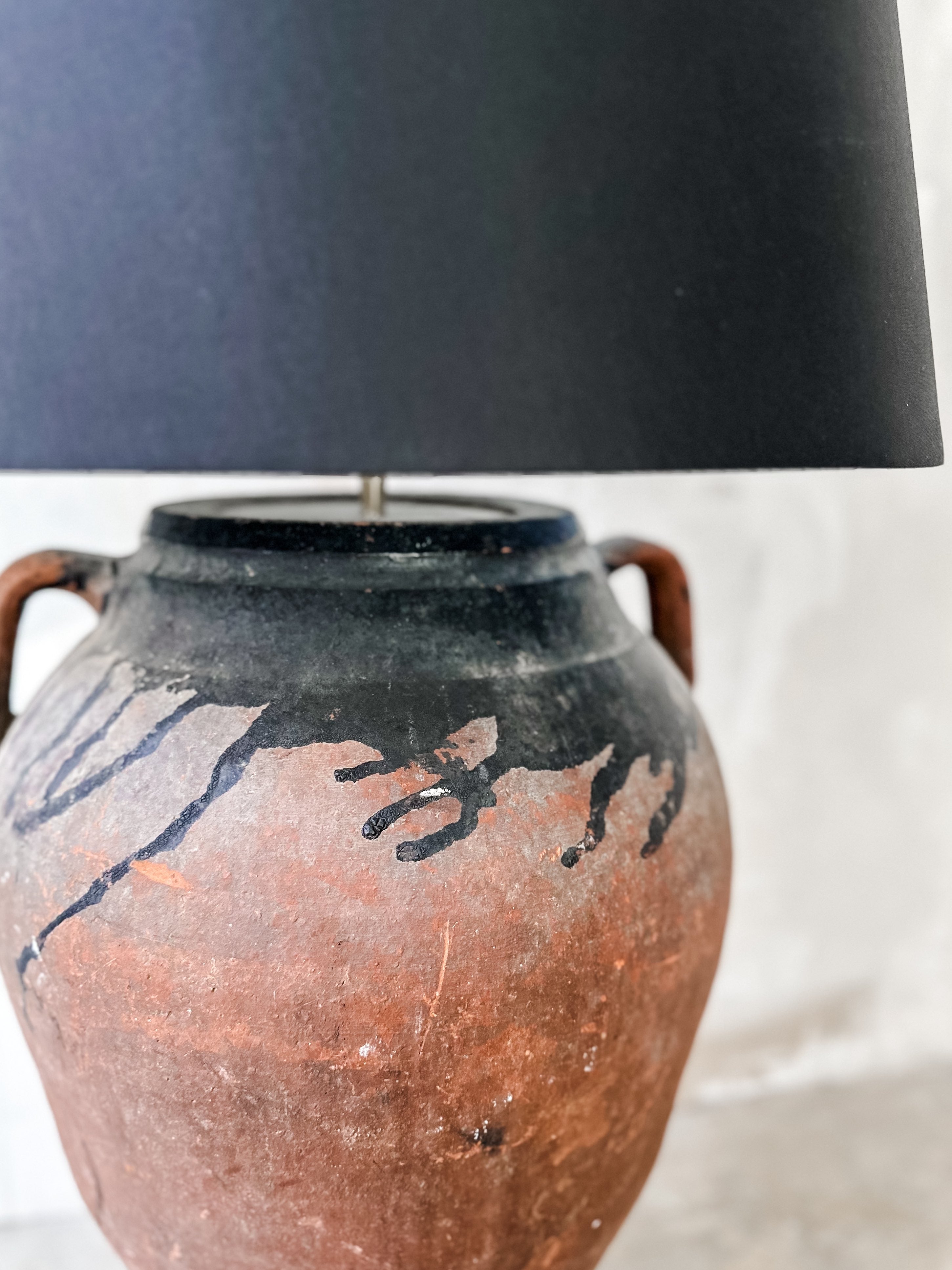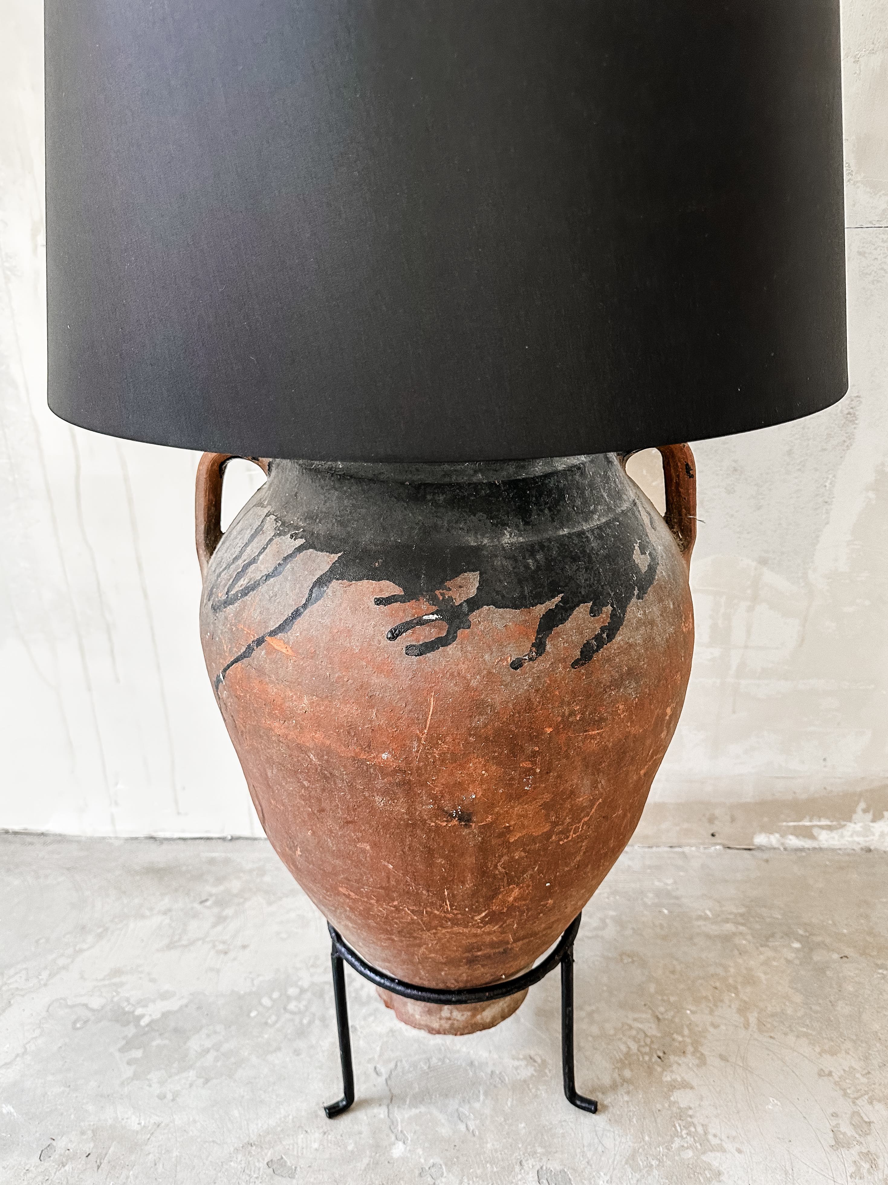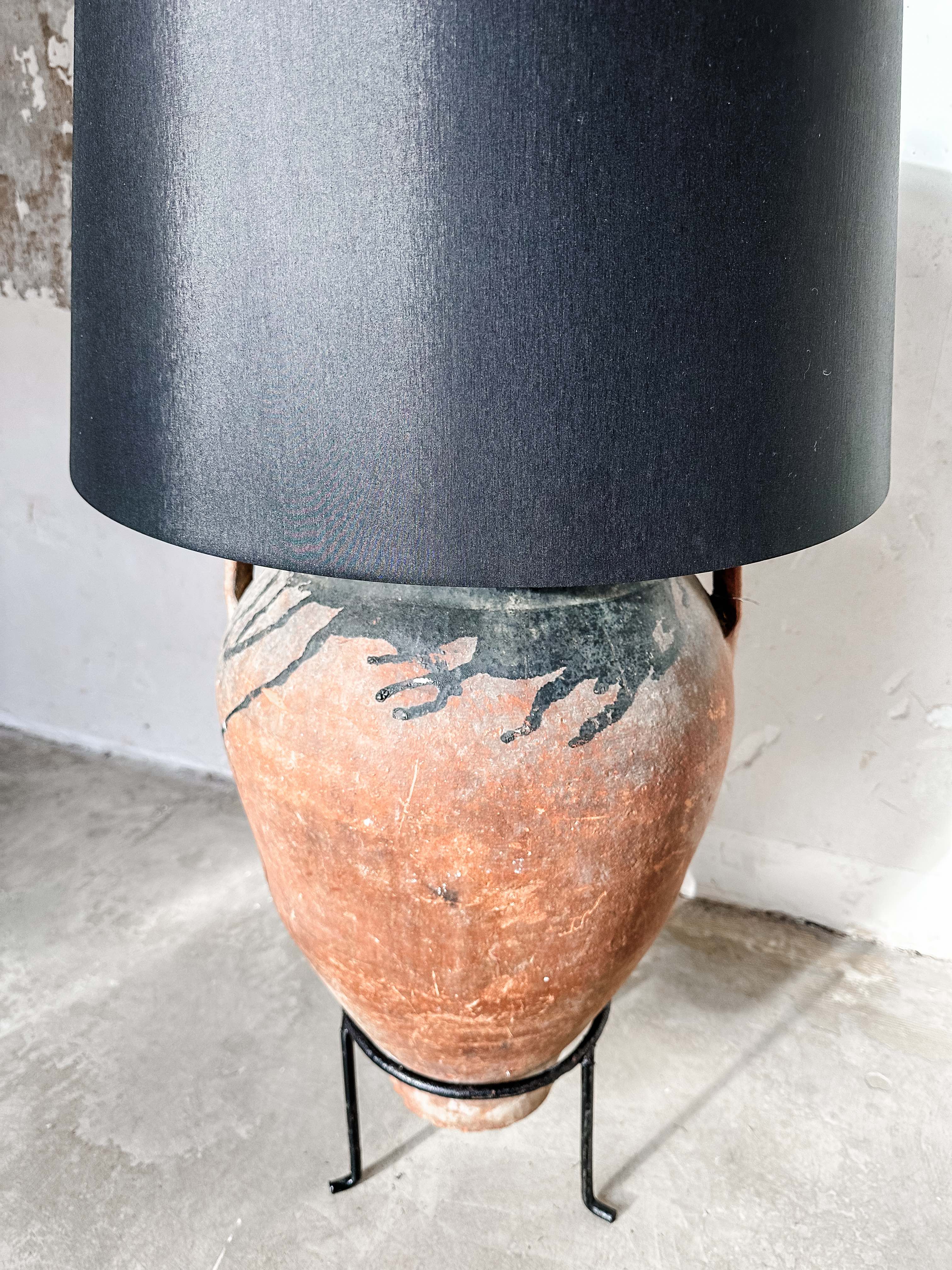 Der Lampenfuß ist aus einem antiken Terrakotta-Topf (ungefähr von 1850) aus Anatolien in der Türkei gefertigt. In diesen Töpfen wurden Olivenöl, Honig, Wasser oder Wein aufbewahrt. Das Material des großen Lampenschirms ist Chintz in schwarz. Der Metallfuß sorgt für einen festen Stand.