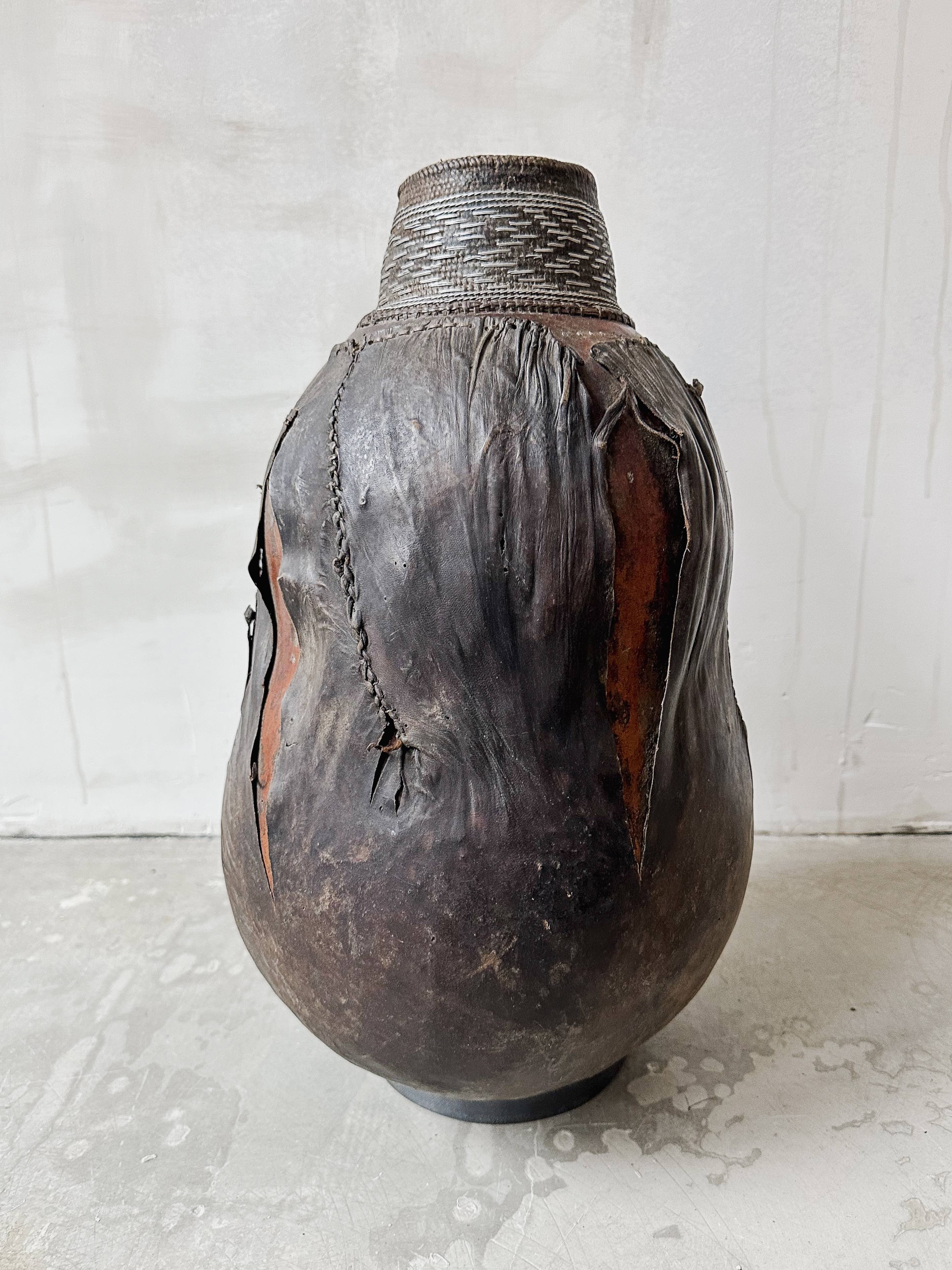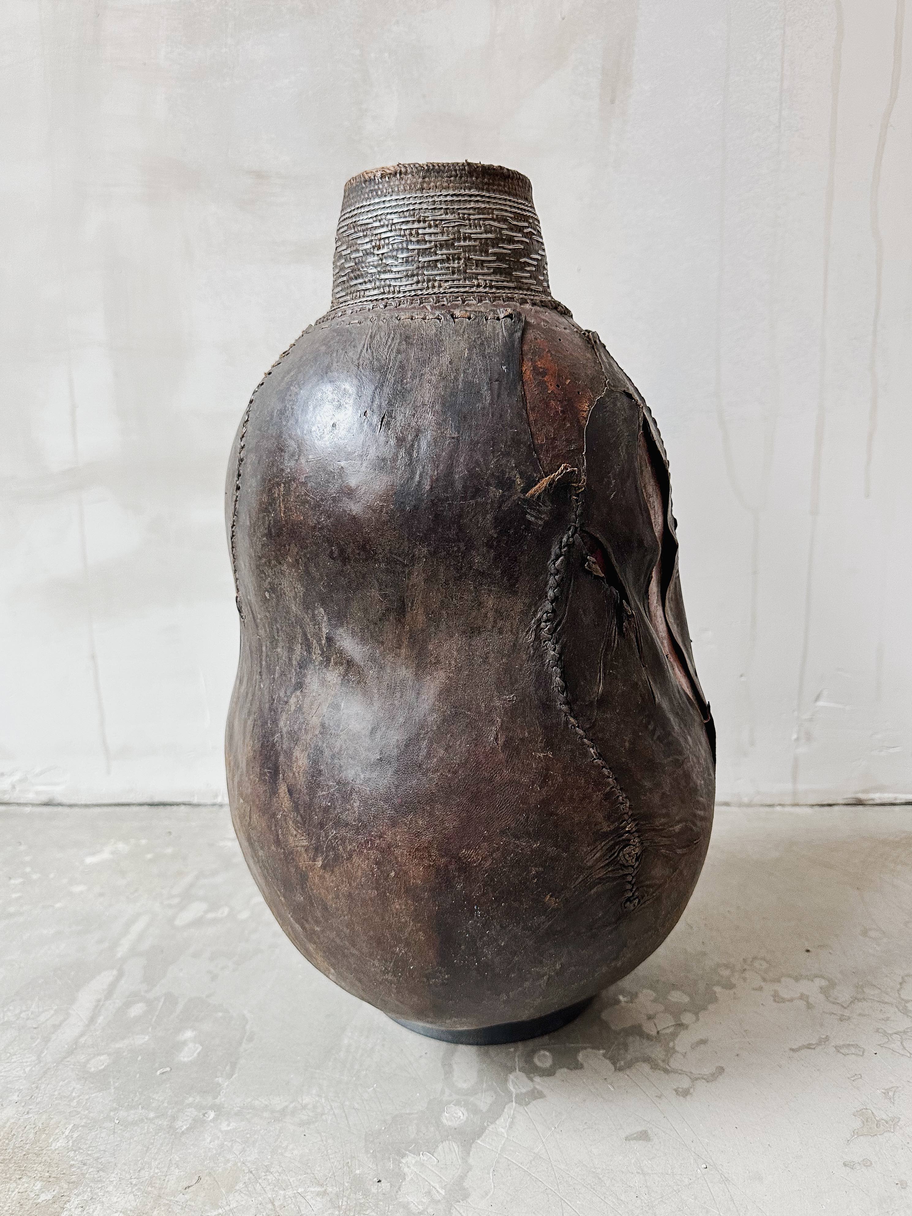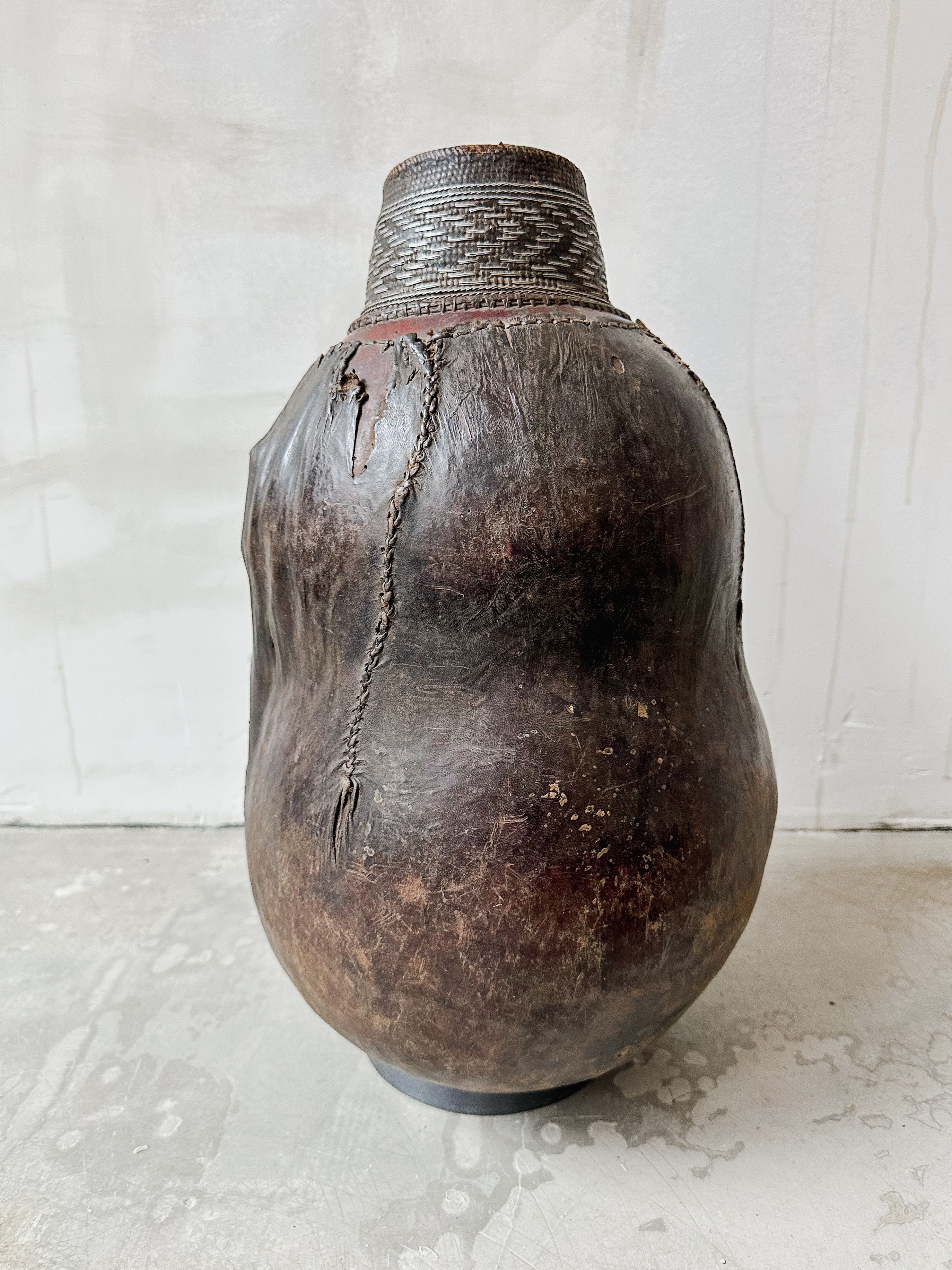 Dieser wundervolle Korb stammt vom Volk der Borana in Äthiopien. Er wurde ursprünglich zur Lagerung von Milch verwendet. Er besteht aus Bindfäden, die mit Harz oder Fett wasserdicht gemacht wurden. Die Verzierung ist aus Metalldraht, die äußere Schicht aus Leder.