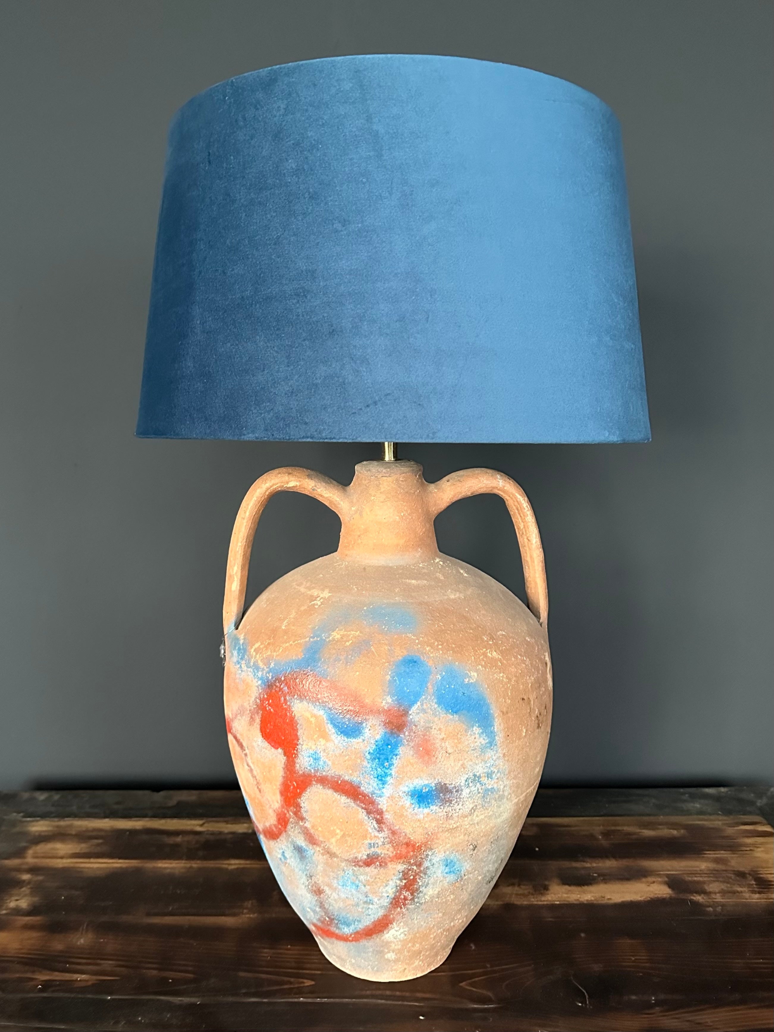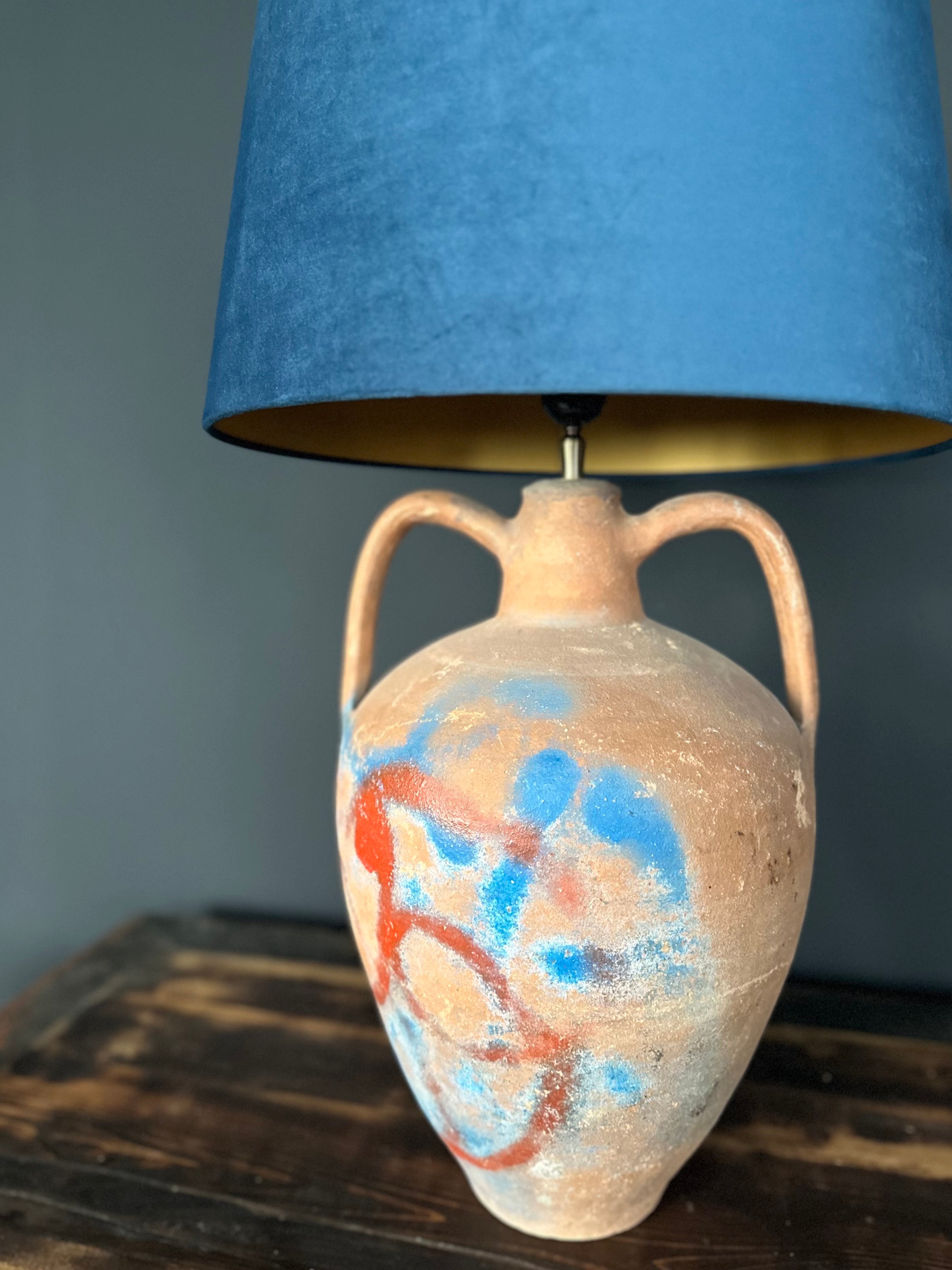 Diese außergewöhnliche Lampe besteht aus einer antiken Amphore von ca. 1900 und einem Lampenschirm aus Samt (innen gold). Absolut verliebt in diese Graffiti Lampe!