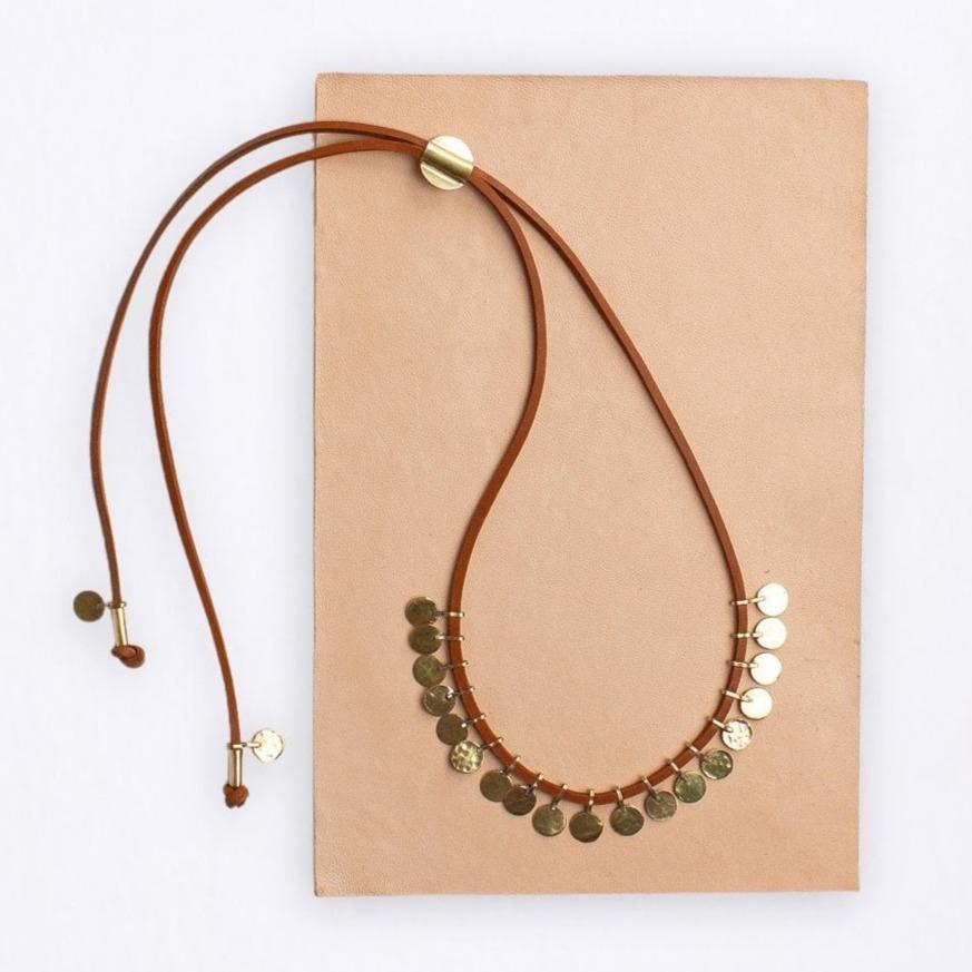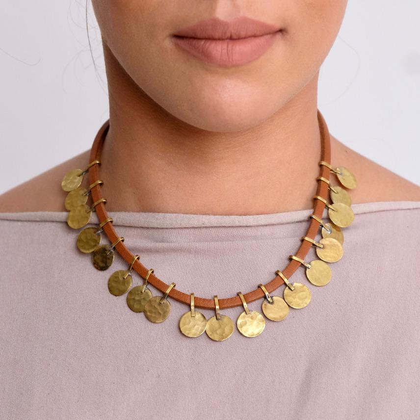 Die Schönheit von Messing und Leder vereint sich an dieser langen Halskette, an der handgefertigte gehämmerte Messingscheiben befestigt sind. Diese Messingscheiben erinnern an Münzen (Floos), wie sie häufig in traditionellem Berberschmuck verwendet werden. Diese Kette ist leicht verstellbar, sodass sie hoch, niedrig oder in beliebiger Länge dazwischen getragen werden kann.