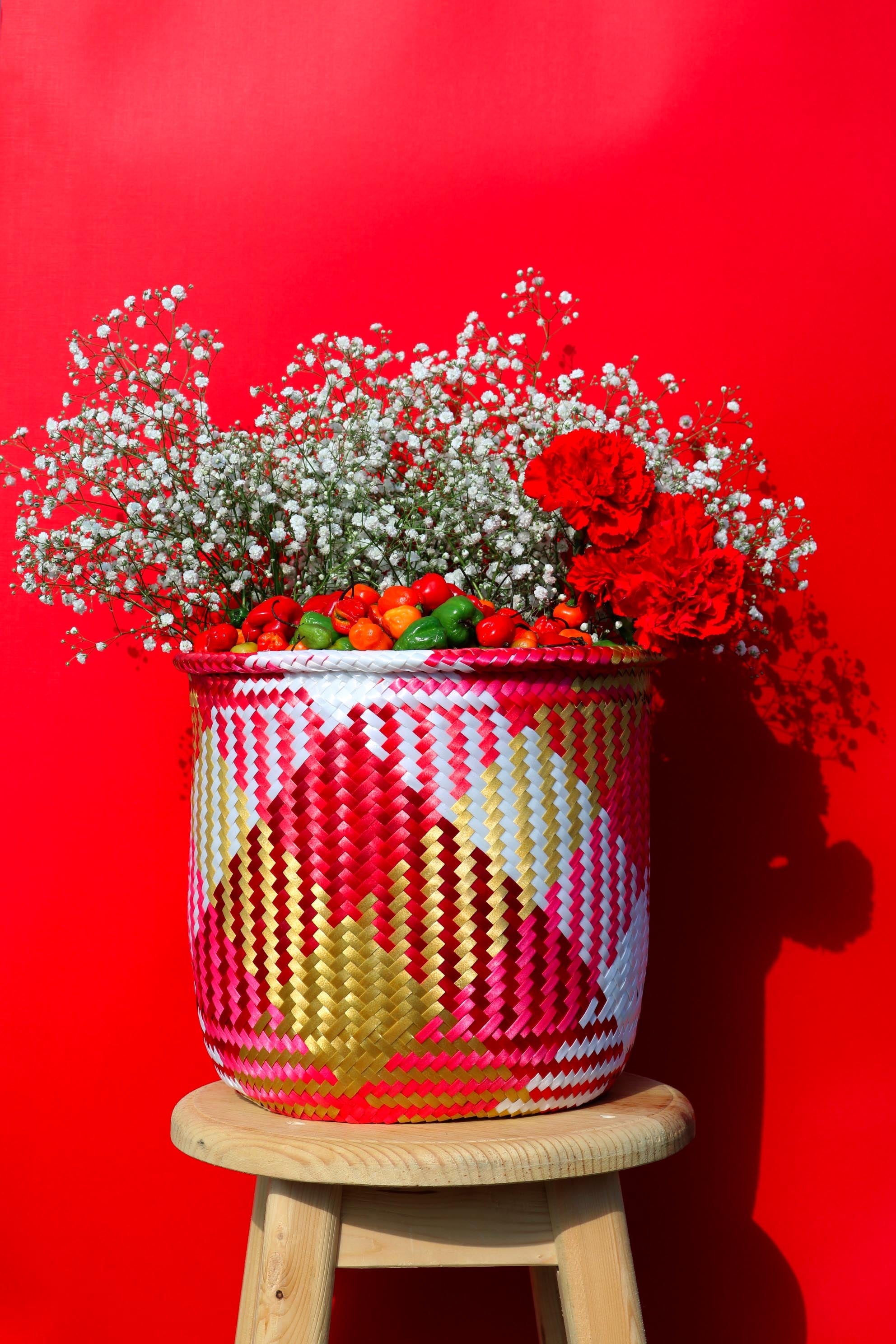 Handgeflochtener Plastikkorb rot-gold-weiß