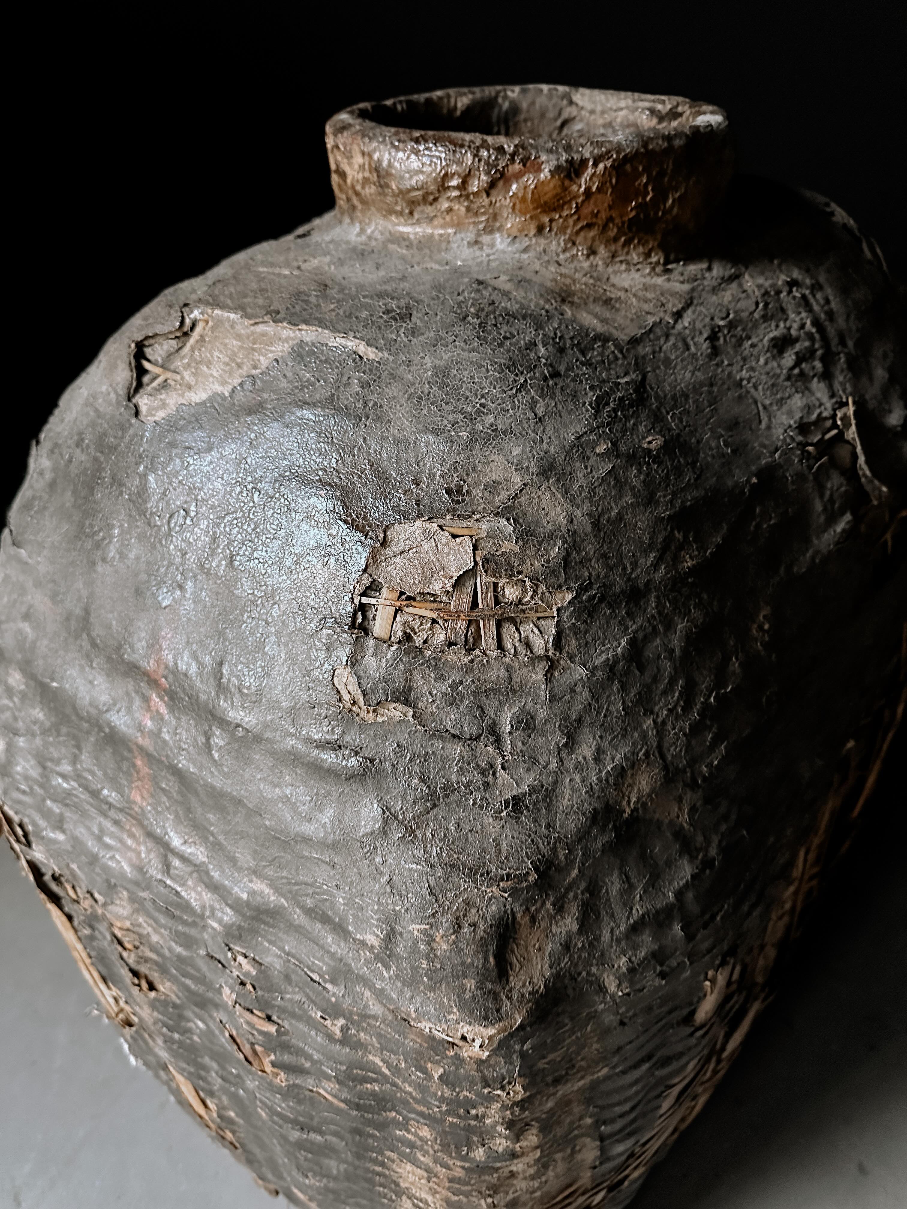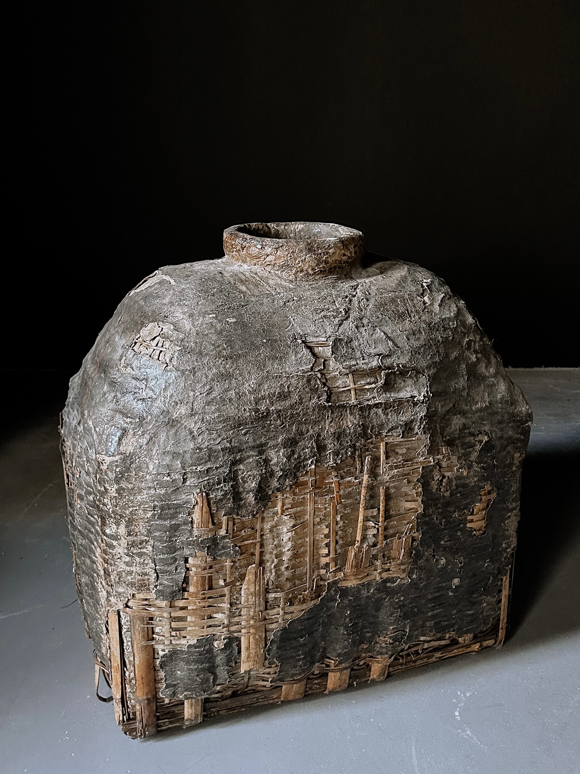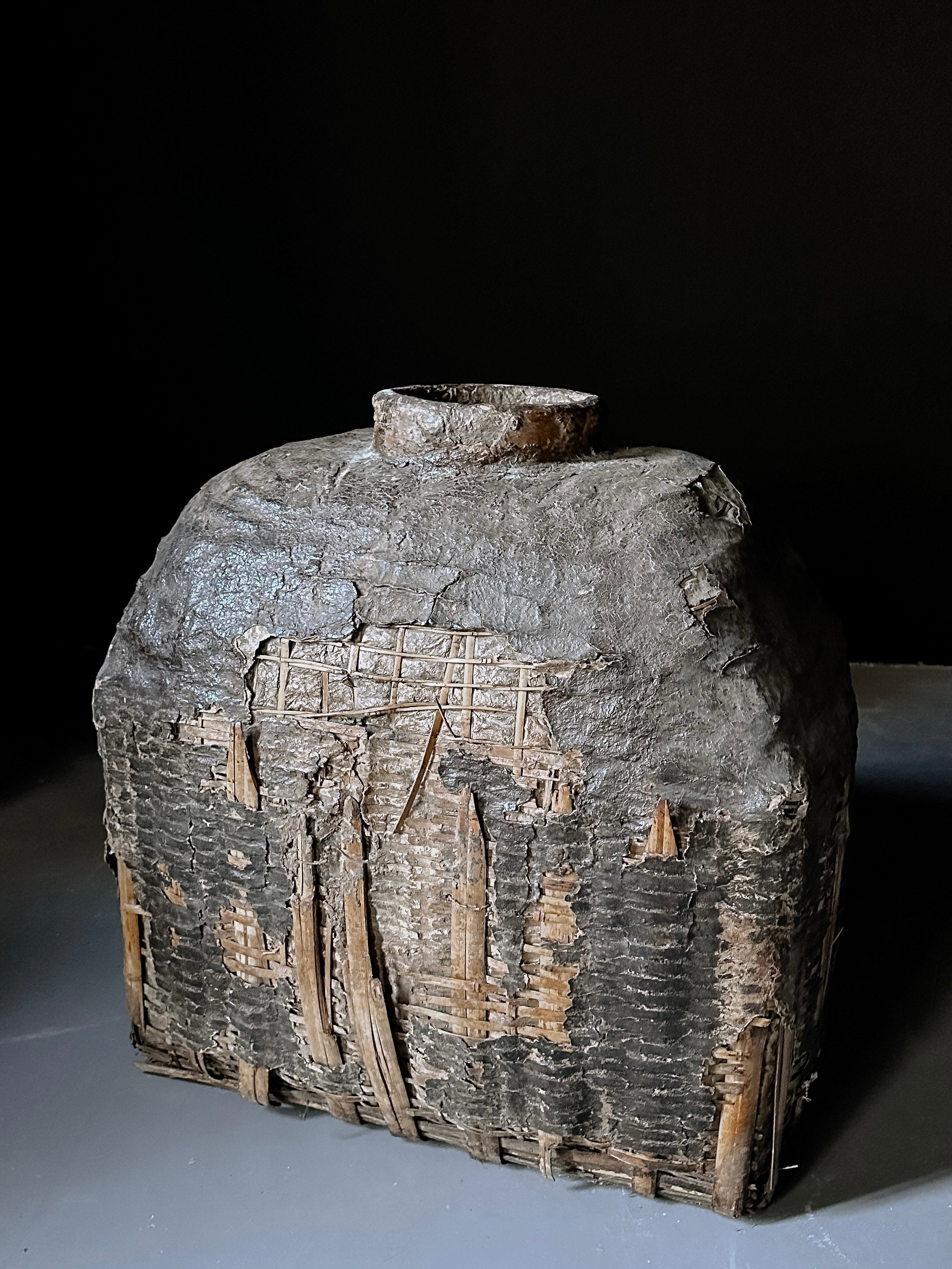 Die Körbe wurden früher in China verwendet, um Essig oder Öl zu lagern, wahrscheinlich für Lampen. Eine aufgetragene Lehm- bzw. Lederpaste schützte die Körbe vor Wasser. Im Laufe der Zeit ist die Paste gerissen, und eine einzigartige Patina ist auf der Oberfläche entstanden.