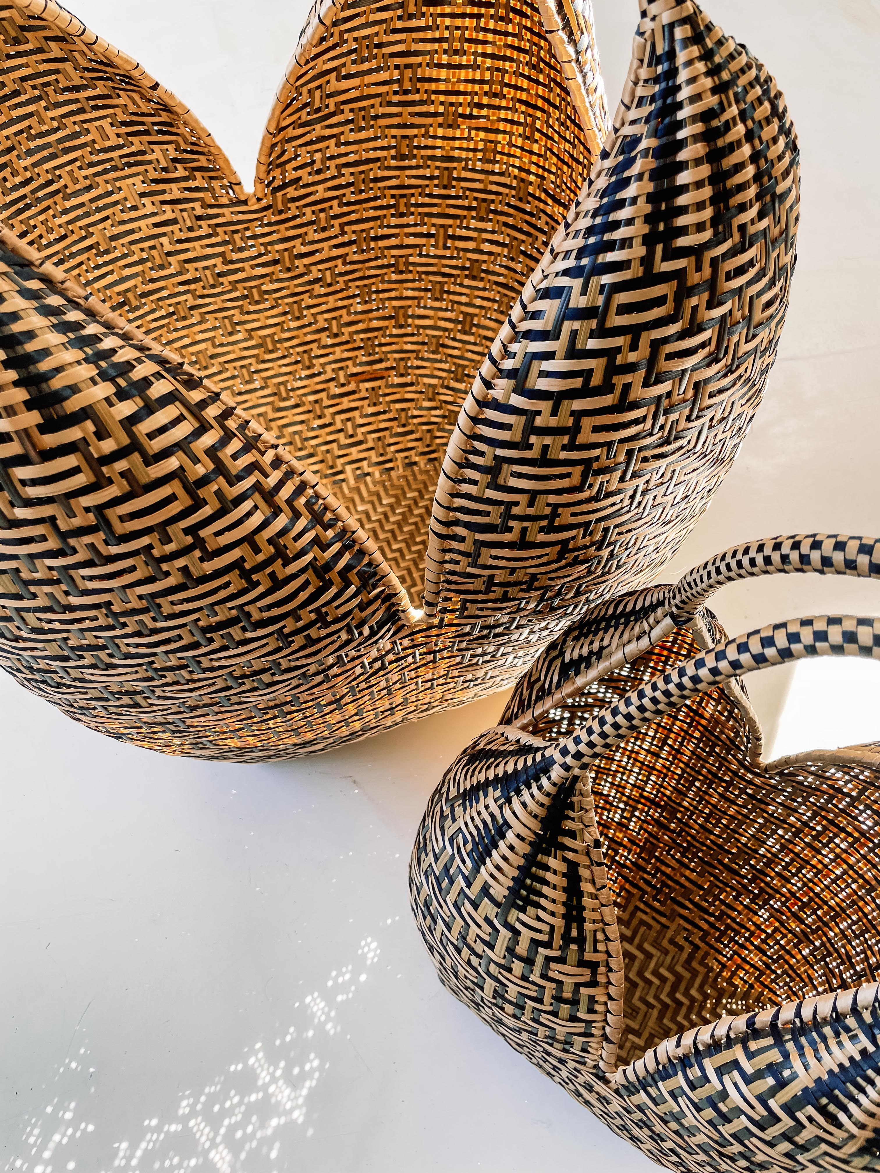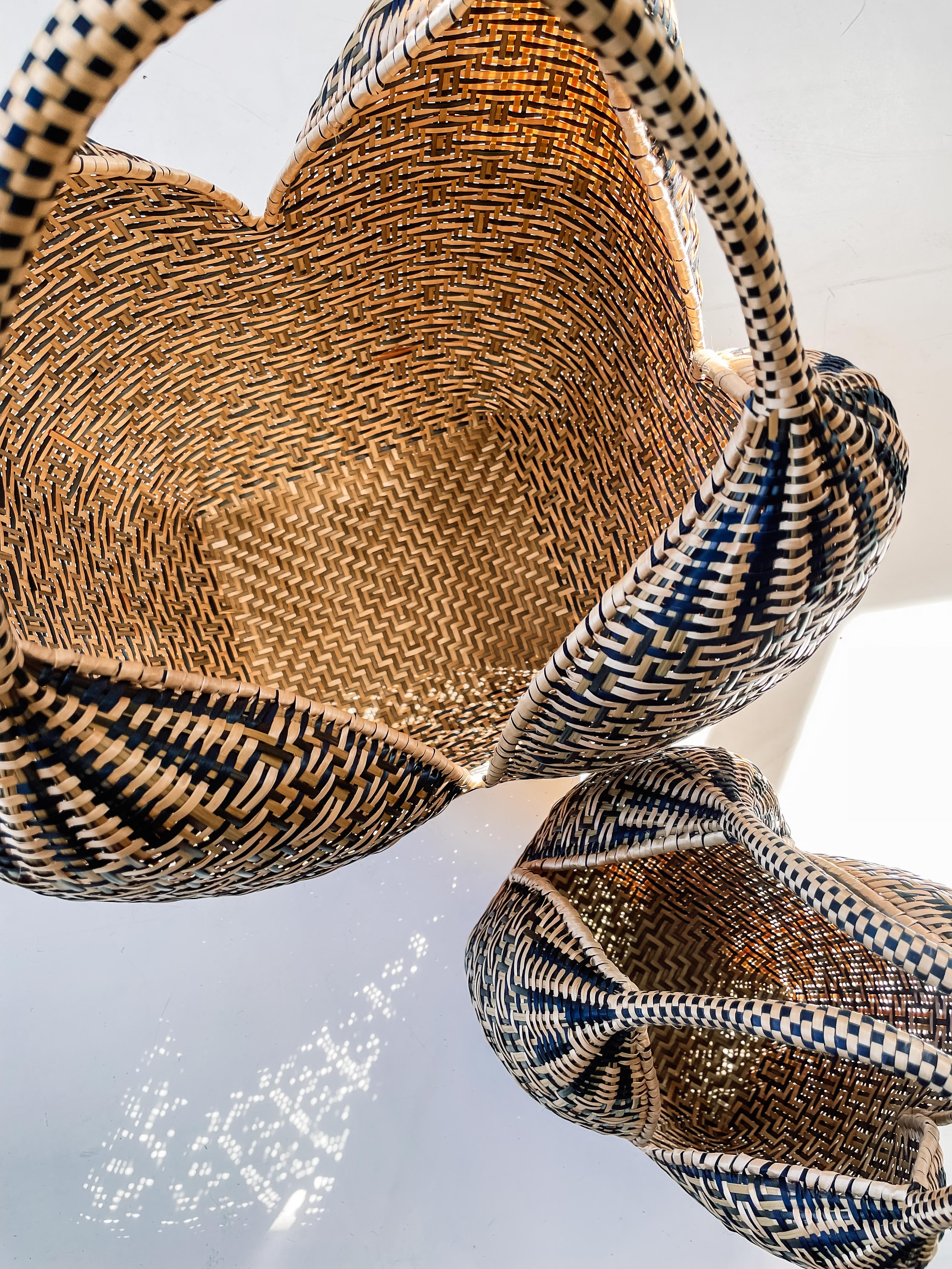 Diese außergewöhnlichen Körbe werden in Guapi, Cauca, Kolumbien, von Hand gewebt. Dieses besondere Handwerk wird bereits seit Generationen weitergegeben. Die Arbeit ist klar verteilt: Die Frauen weben die Körbe, die Männer wandern im Wald umher, um die notwendigen Materialien zu ernten.