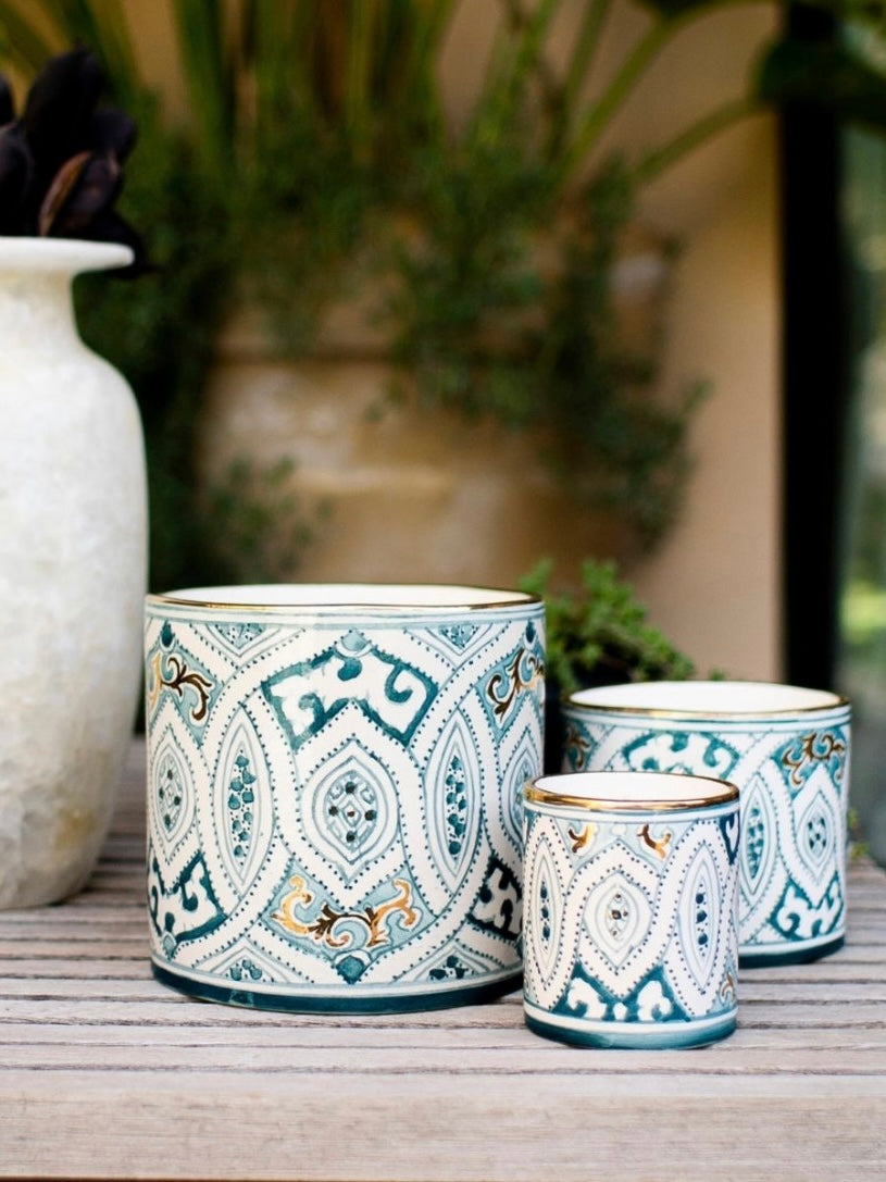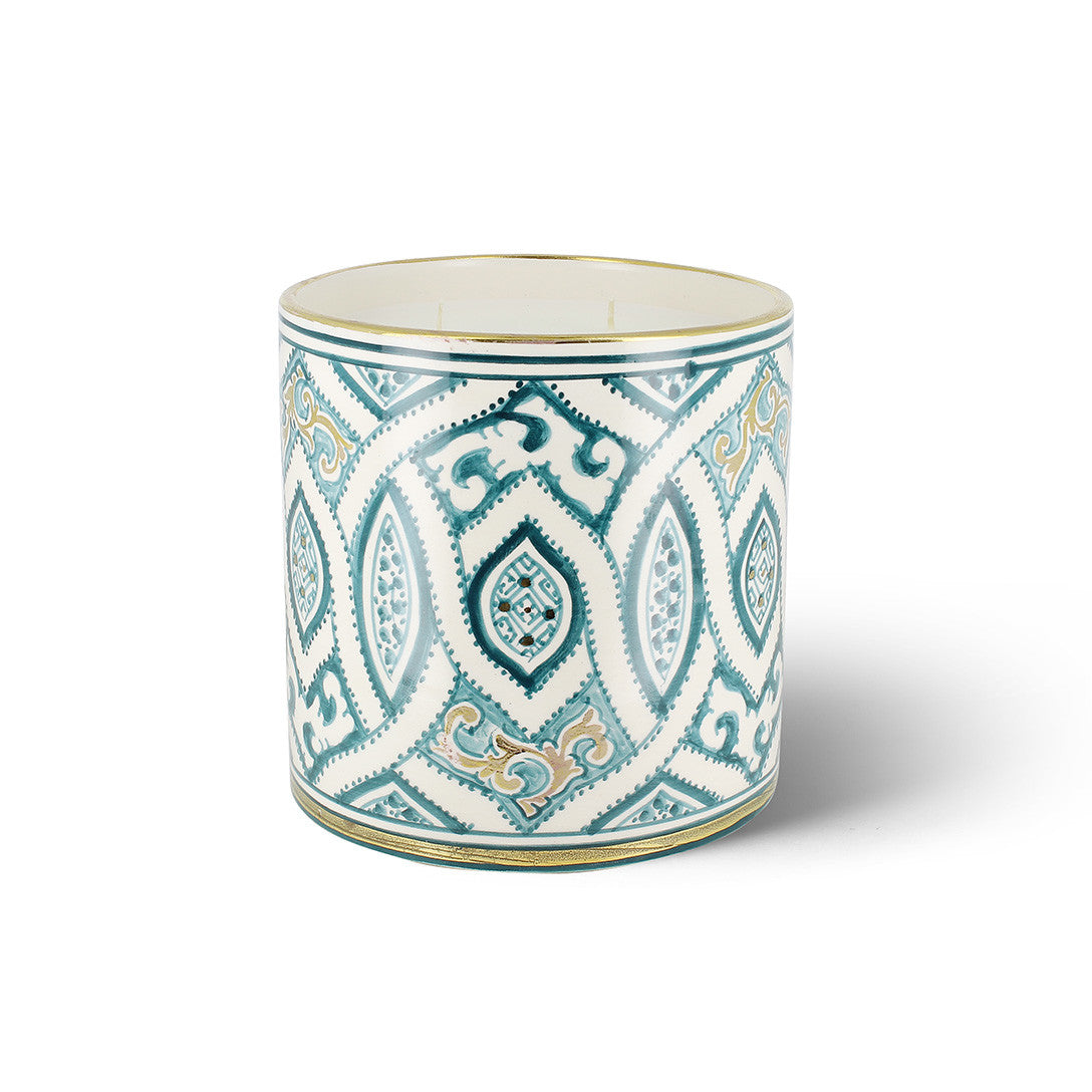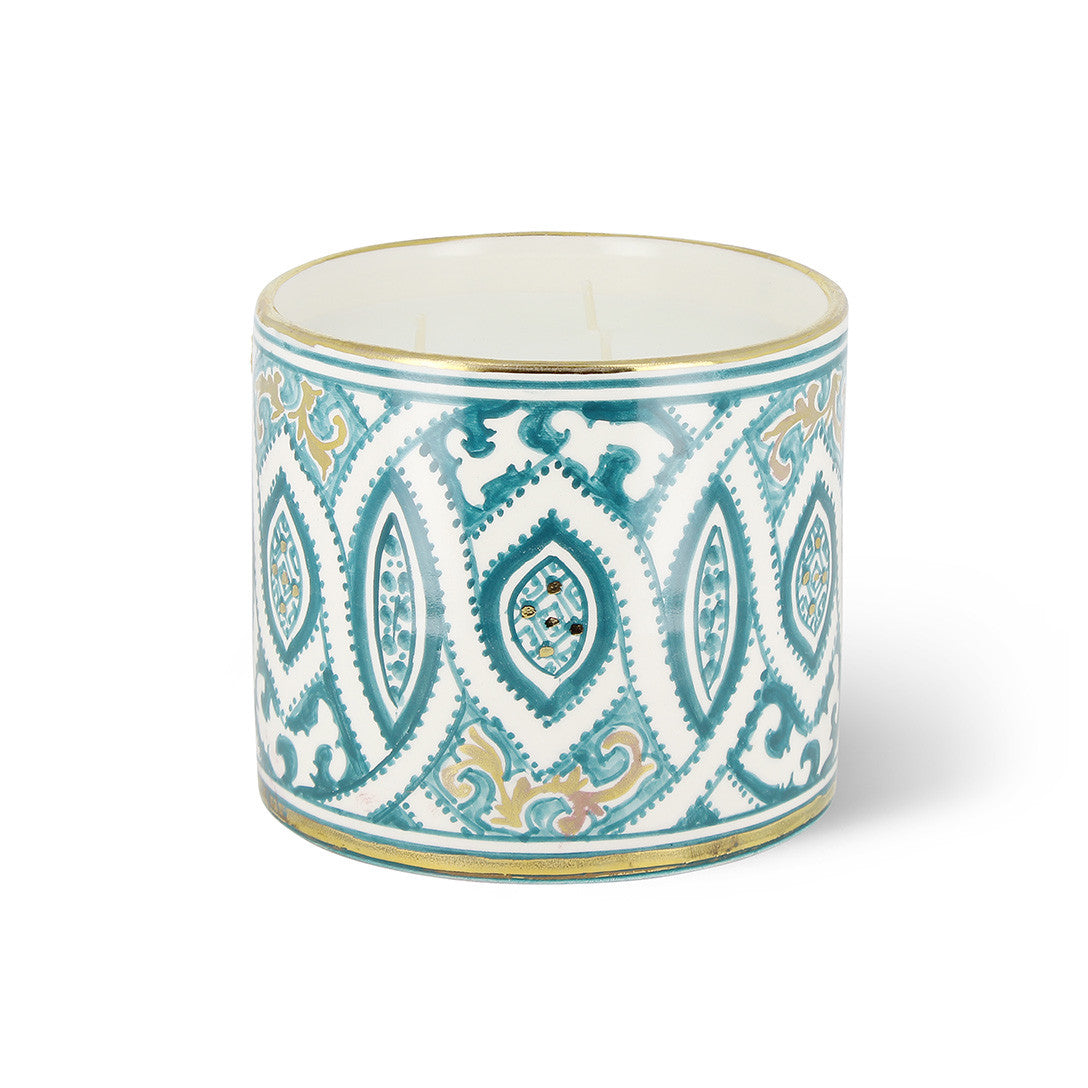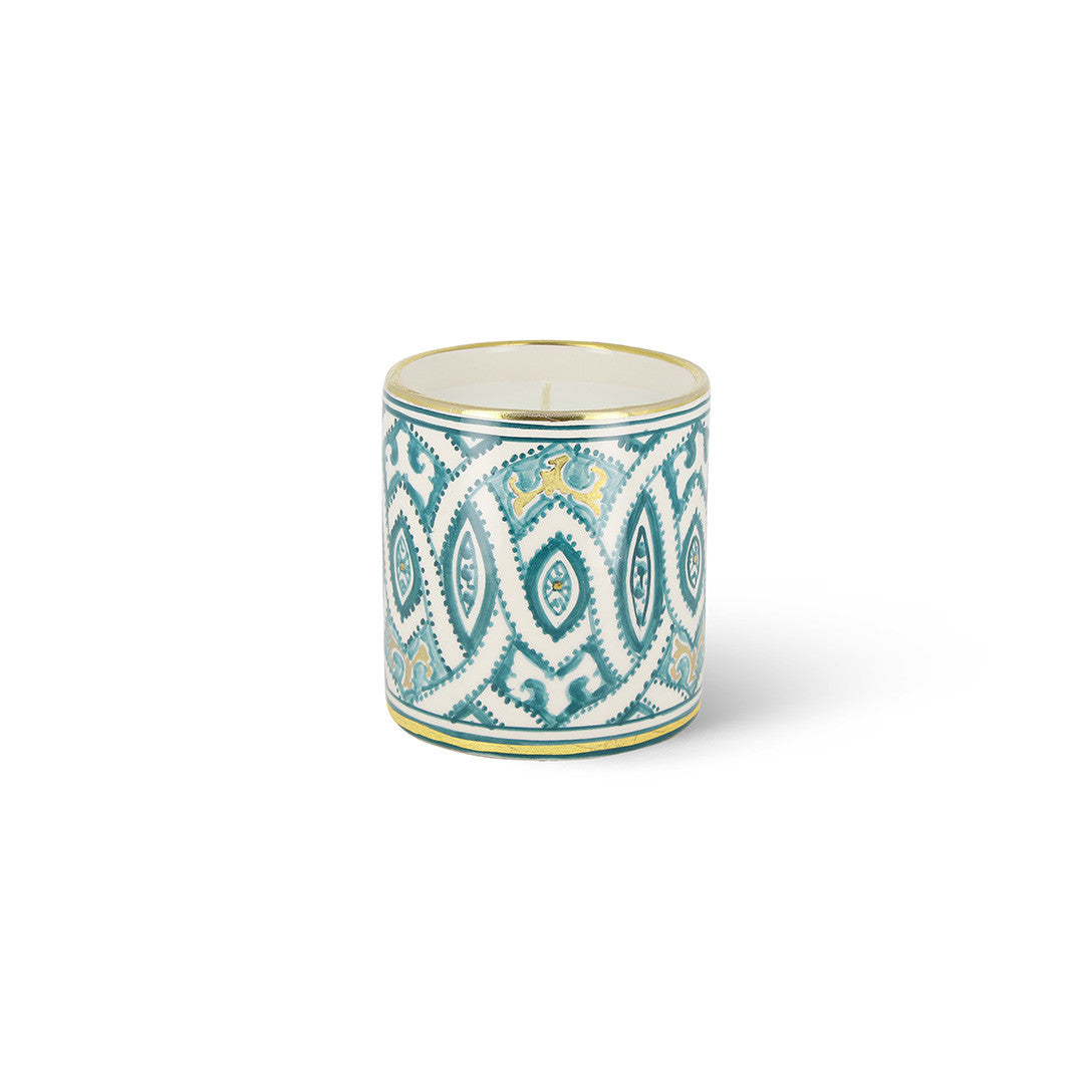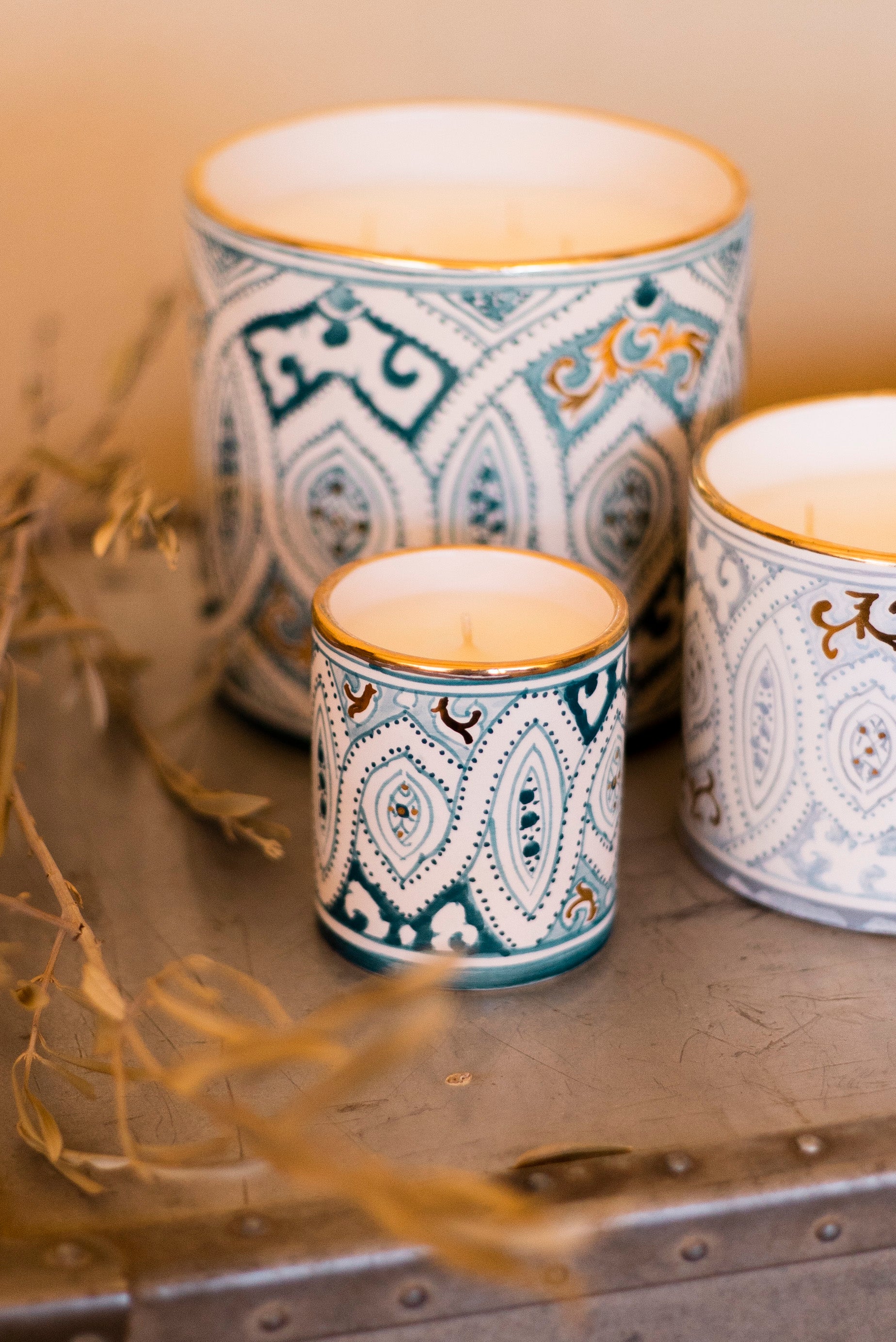 Duftkerze aus natürlichen und organischen Rohstoffen in andalusischer Keramik mit 12 Karat Gold, handgefertigt in einer Manufaktur in Marokko. Die Duftrichtung Orangenblüte bietet einen frischen und sinnlichen Duft.