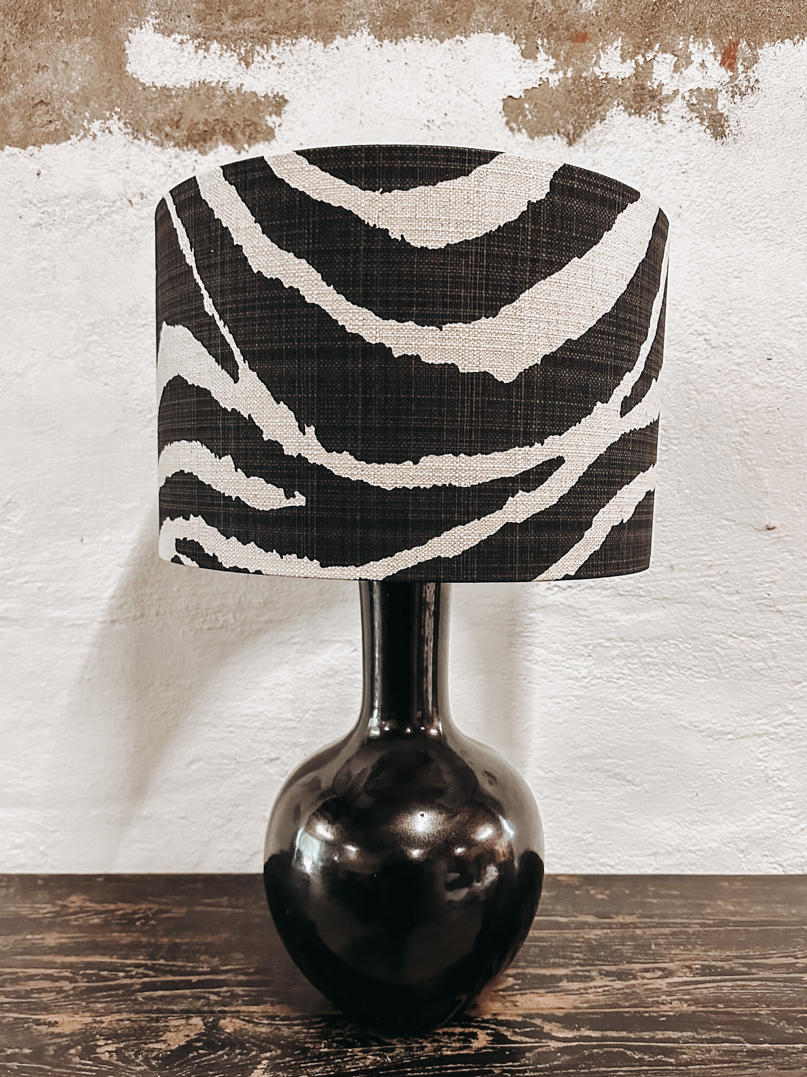 Statement Lampe aus einem schwarzen Porzellanfuß in Form einer Vase mit wunderschönem schwarz-weißen Animal Print Lampenschirm. Lieferung ohne Glühbirne, mit Kabel.