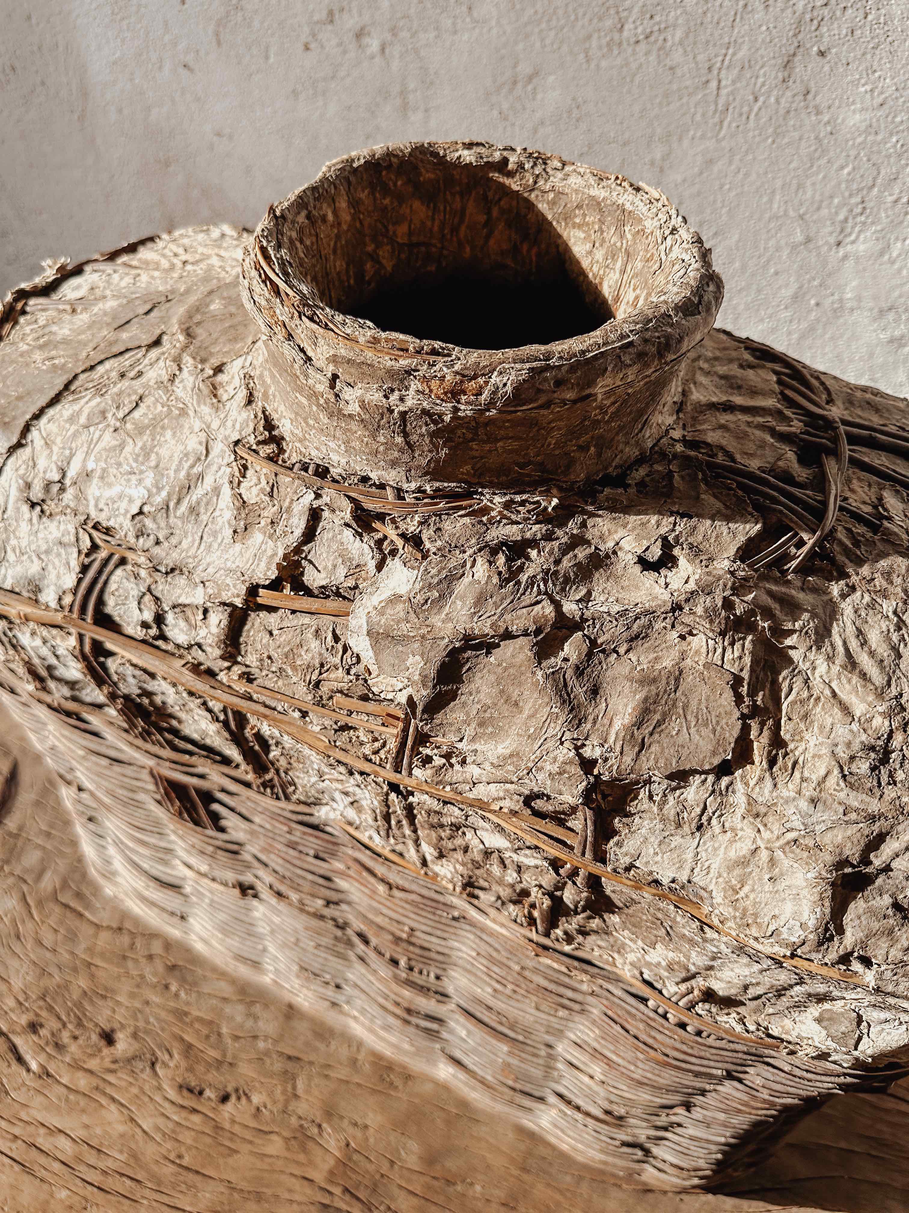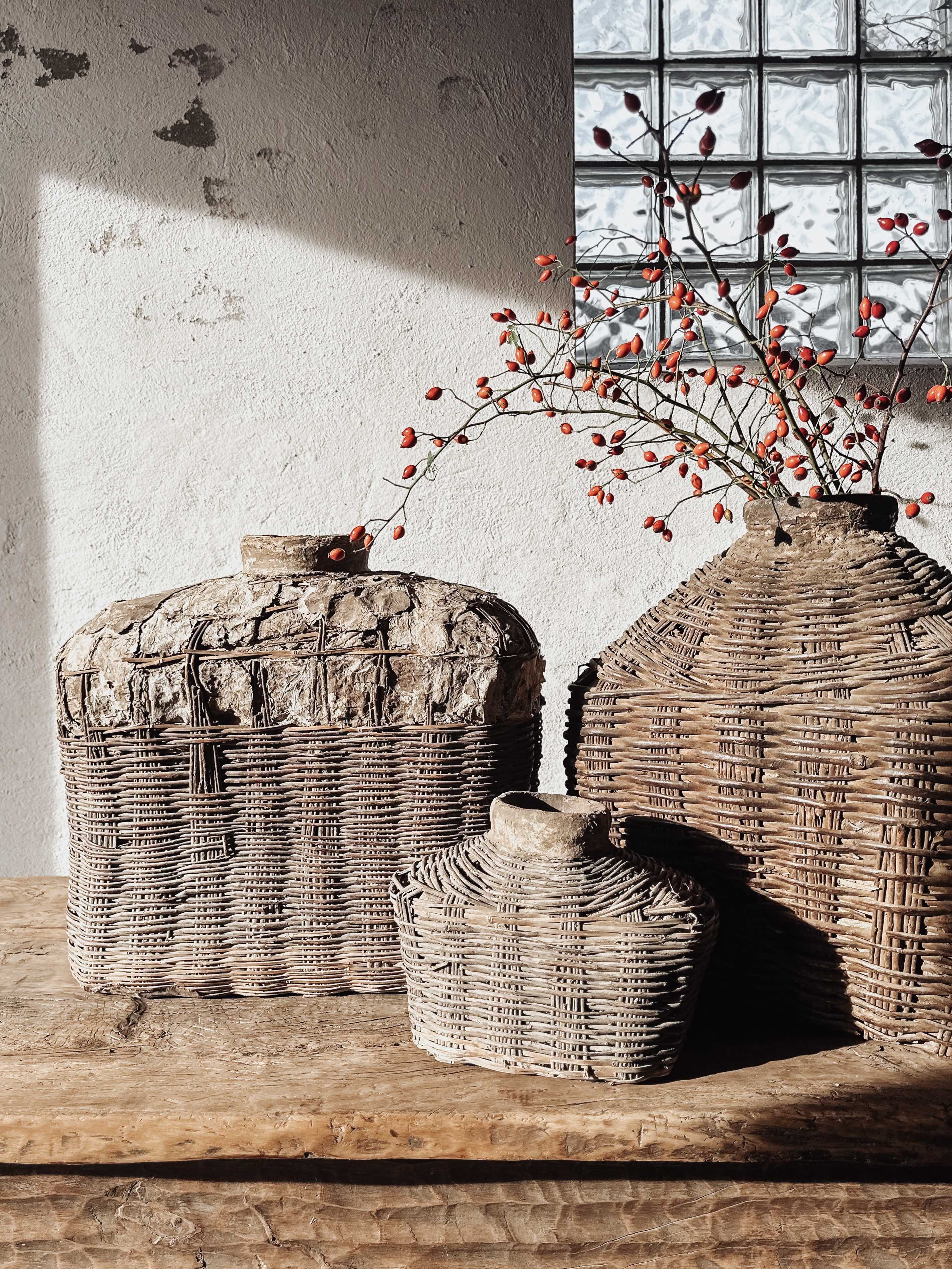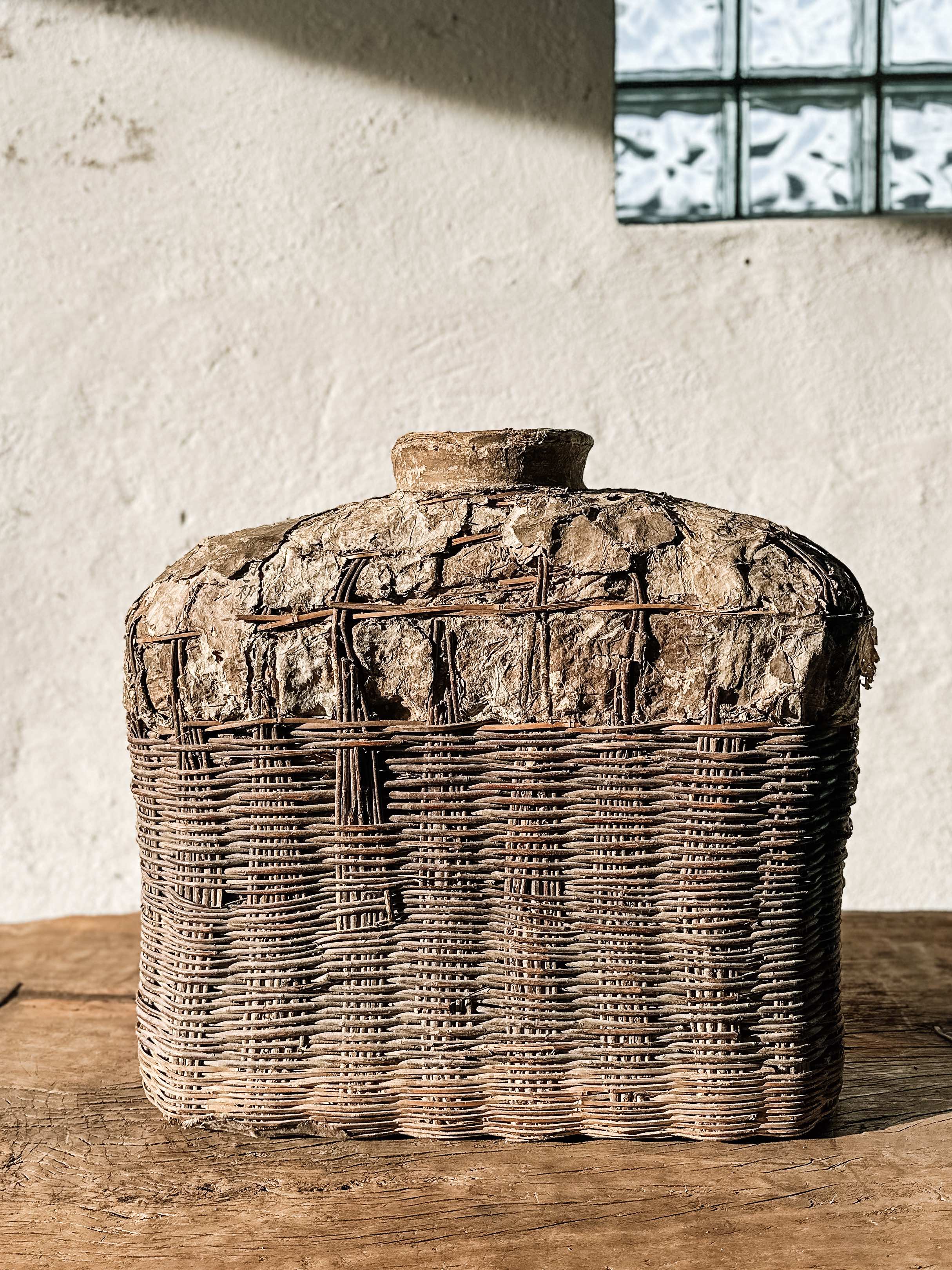 Die Körbe wurden früher in China verwendet, um Essig oder Öl zu lagern, wahrscheinlich für Lampen. Eine aufgetragene Lehm- bzw. Lederpaste schützte die Körbe vor Wasser. Im Laufe der Zeit ist die Paste gerissen, und eine einzigartige Patina ist auf der Oberfläche entstanden.