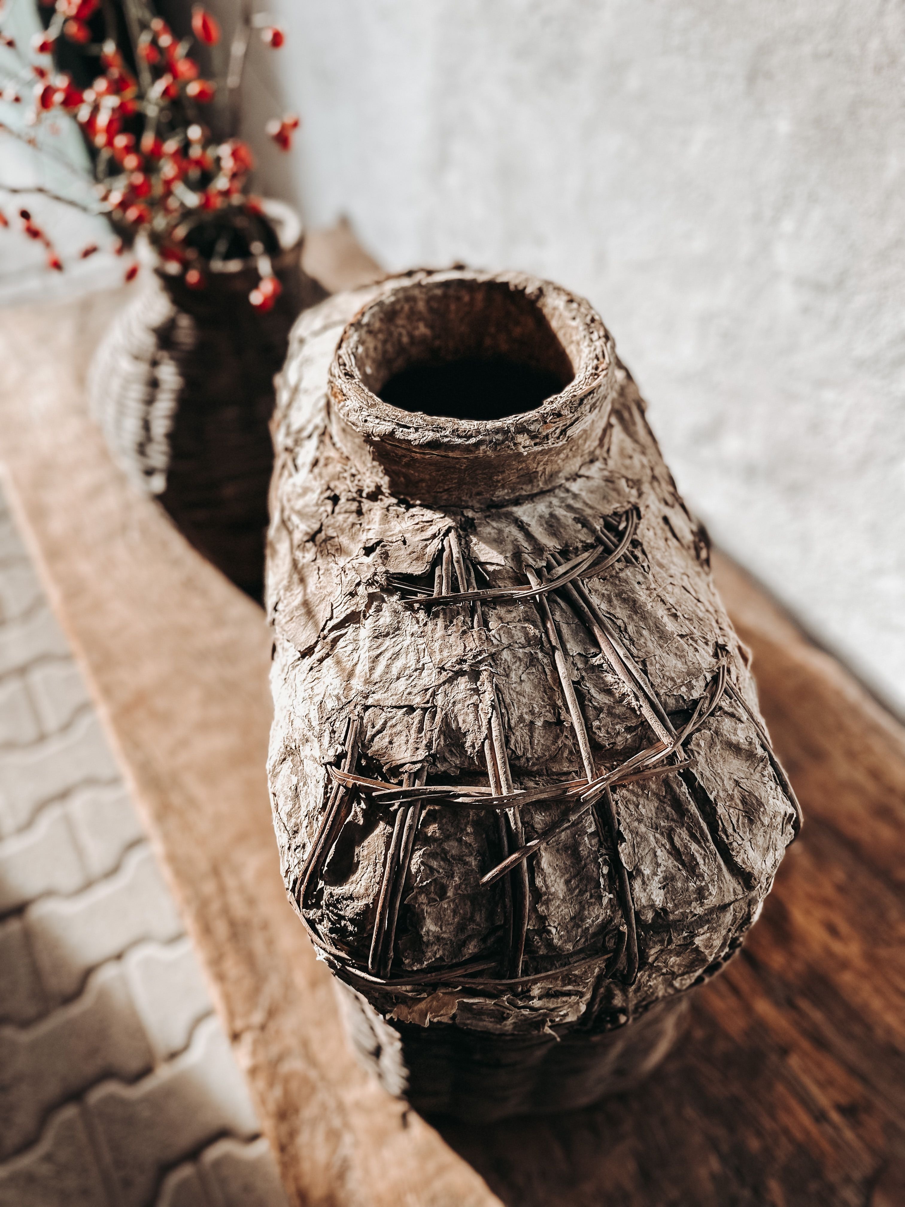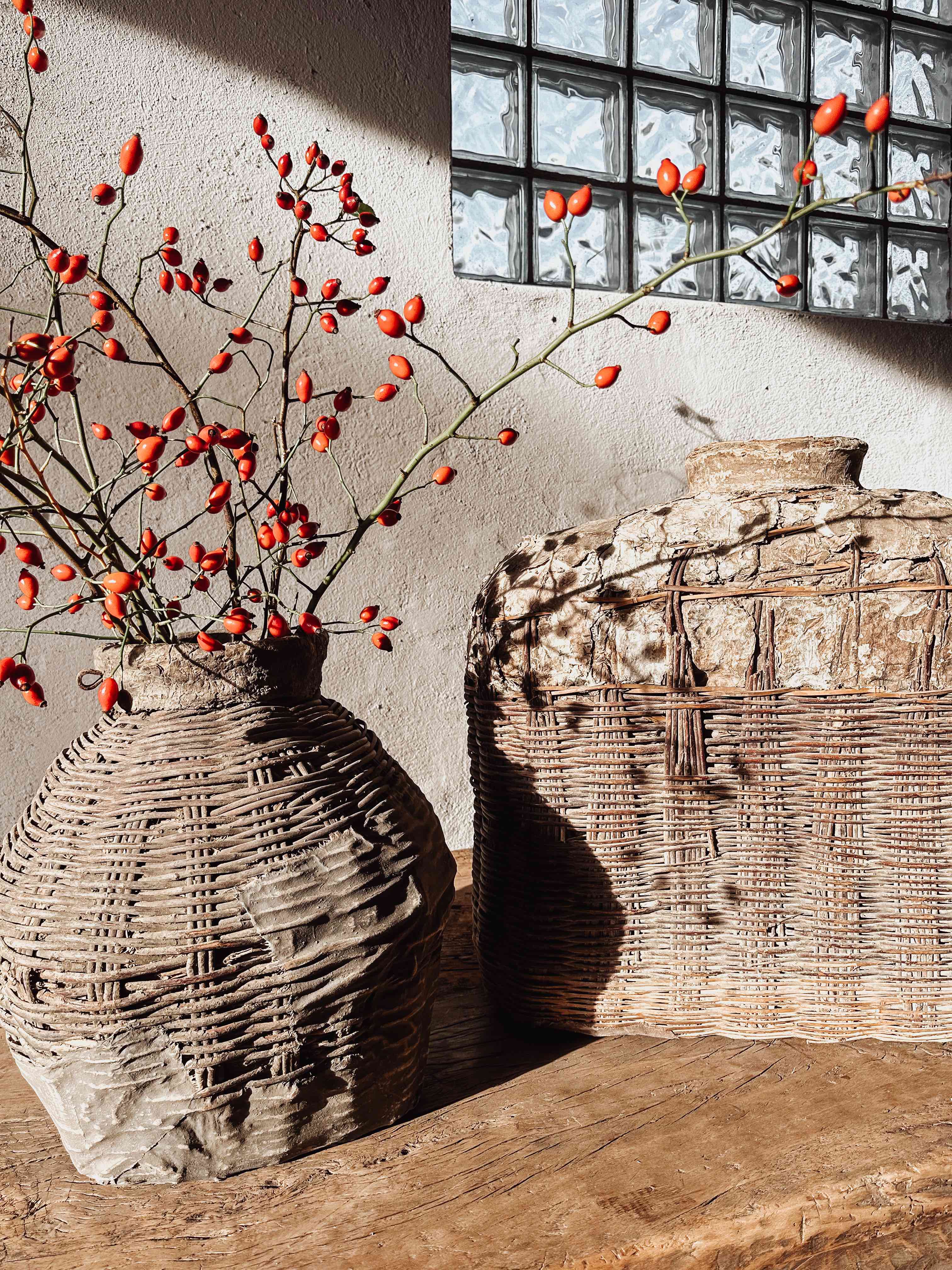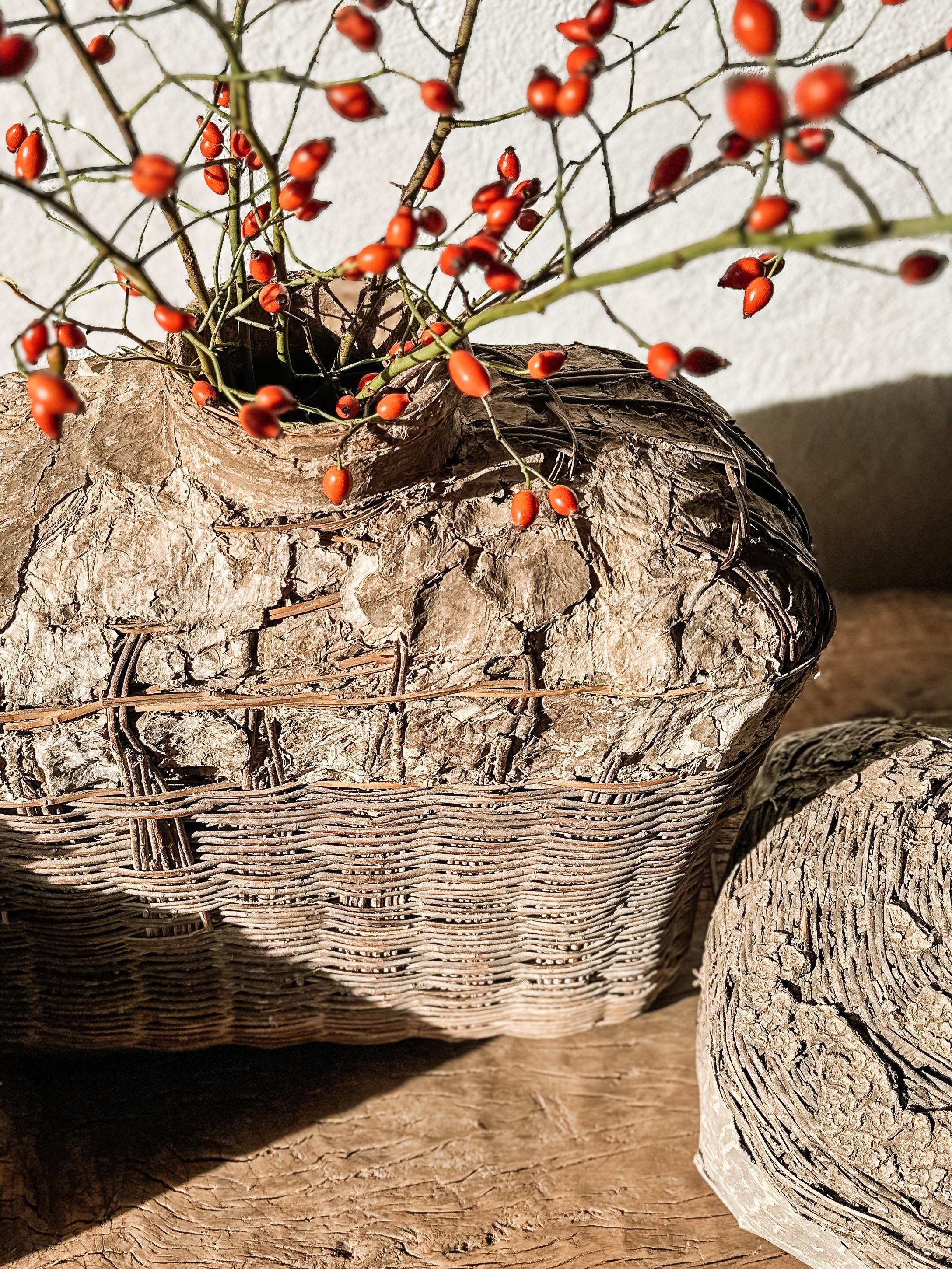 Die Körbe wurden früher in China verwendet, um Essig oder Öl zu lagern, wahrscheinlich für Lampen. Eine aufgetragene Lehm- bzw. Lederpaste schützte die Körbe vor Wasser. Im Laufe der Zeit ist die Paste gerissen, und eine einzigartige Patina ist auf der Oberfläche entstanden.