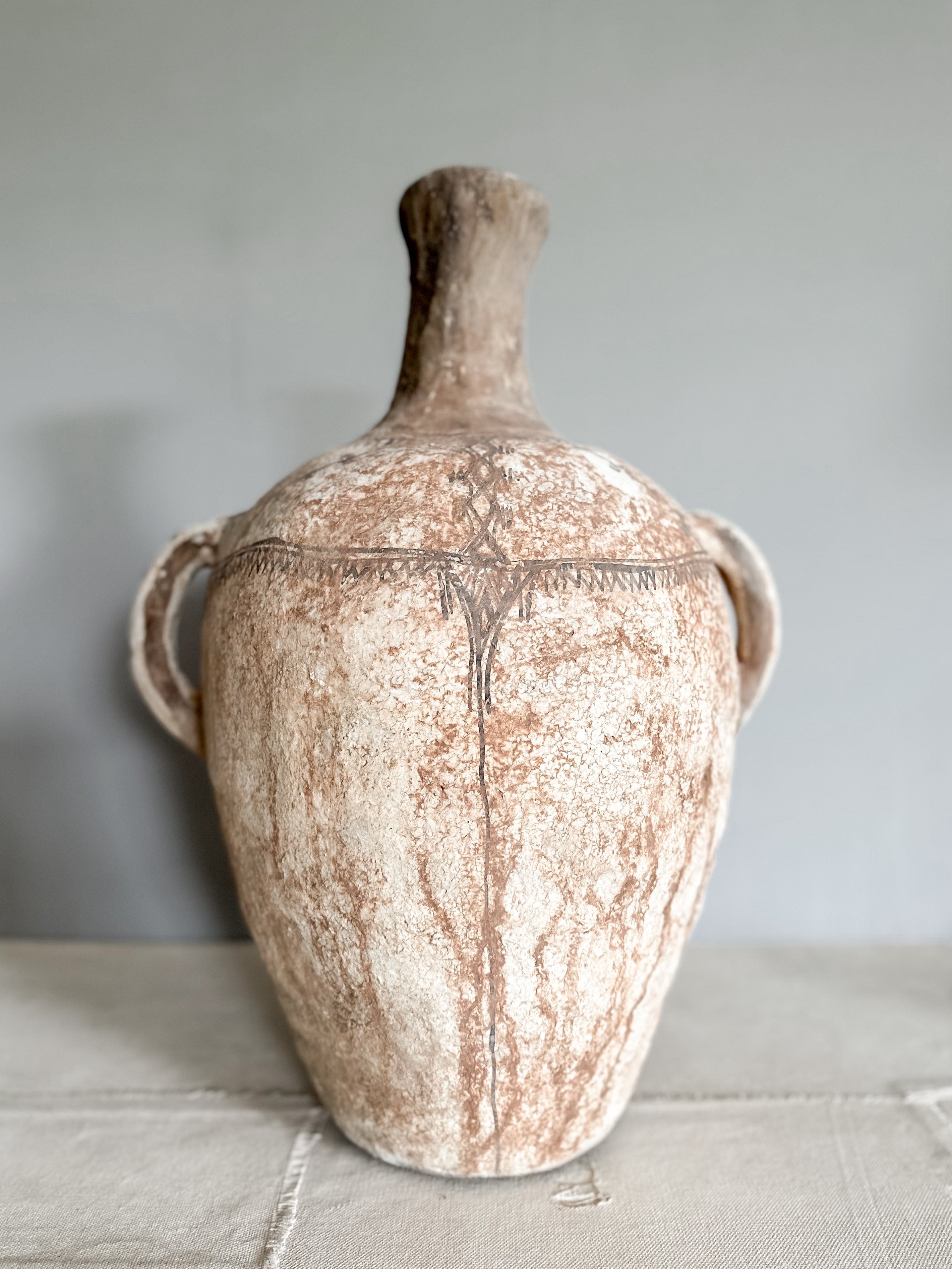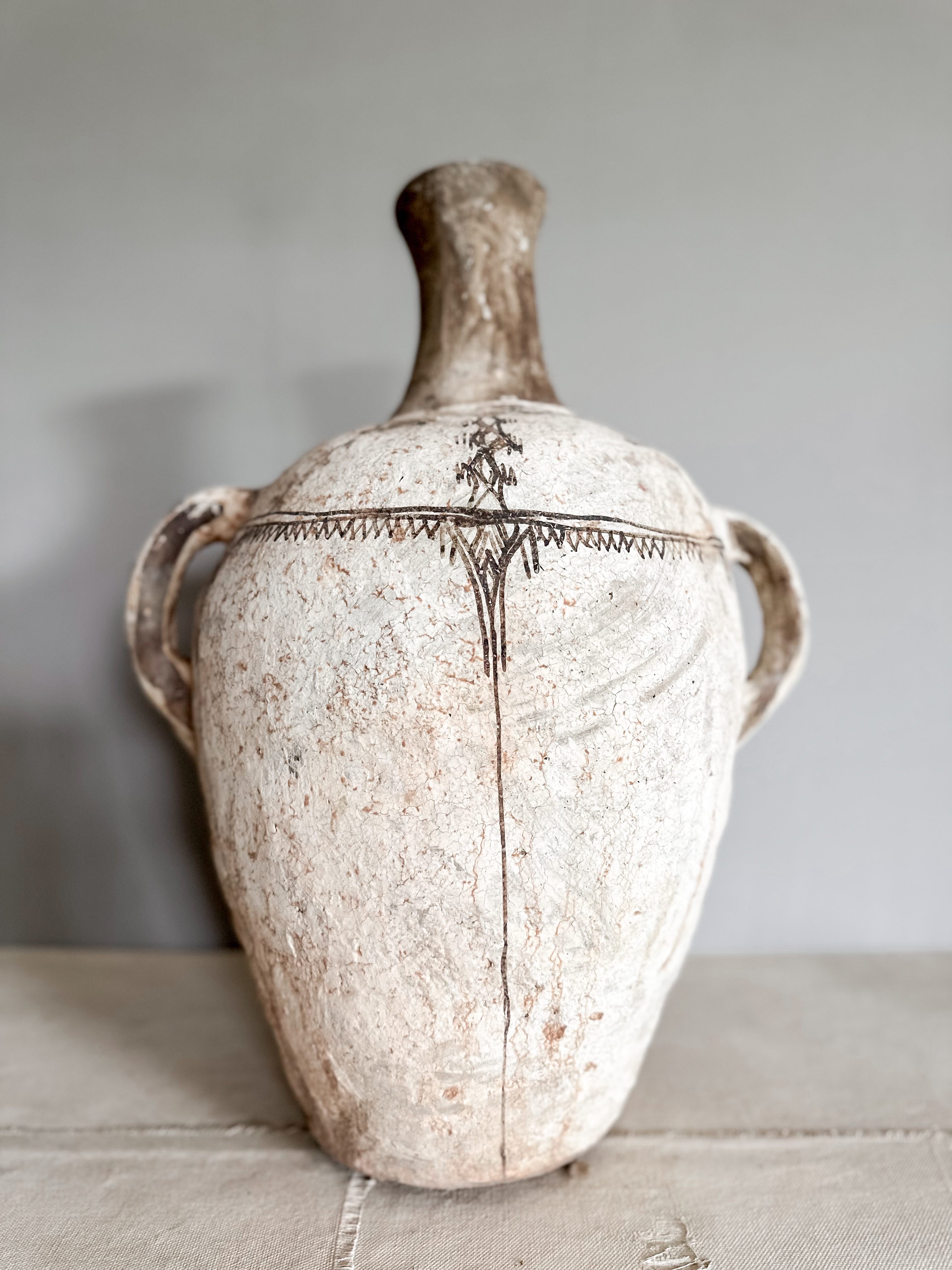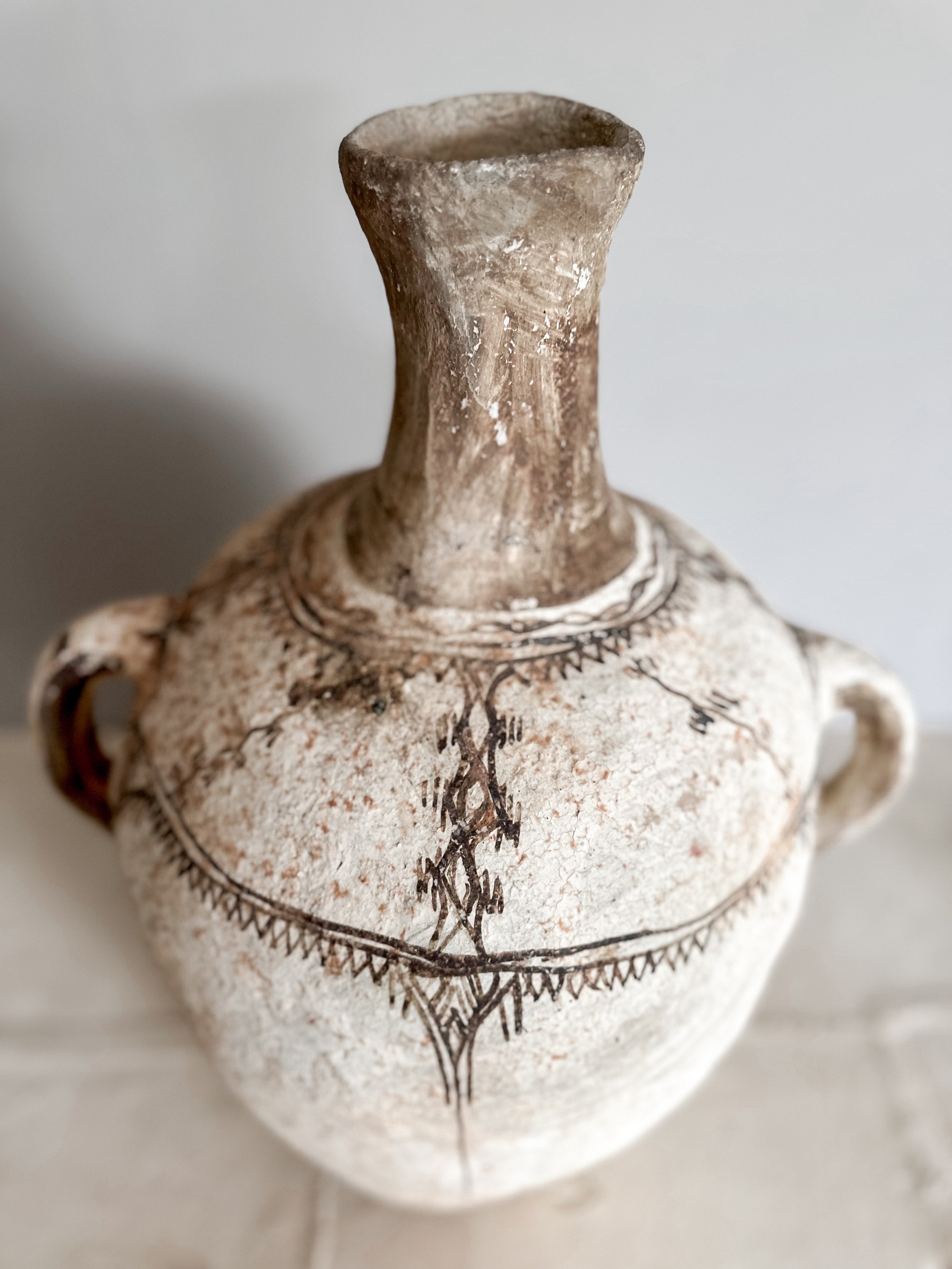 Diese Töpfe wurden von den wundervollen Frauen im Rif Gebirge im Norden Marokkos handgefertigt. Die Pottery wurde aus lokalem Ton hergestellt und auf offenem Feuer gebrannt. Die geometrischen Muster wurden sorgfältig von Hand bemalt und waren stets einzigartig inspiriert von alter Felsenmalerei.