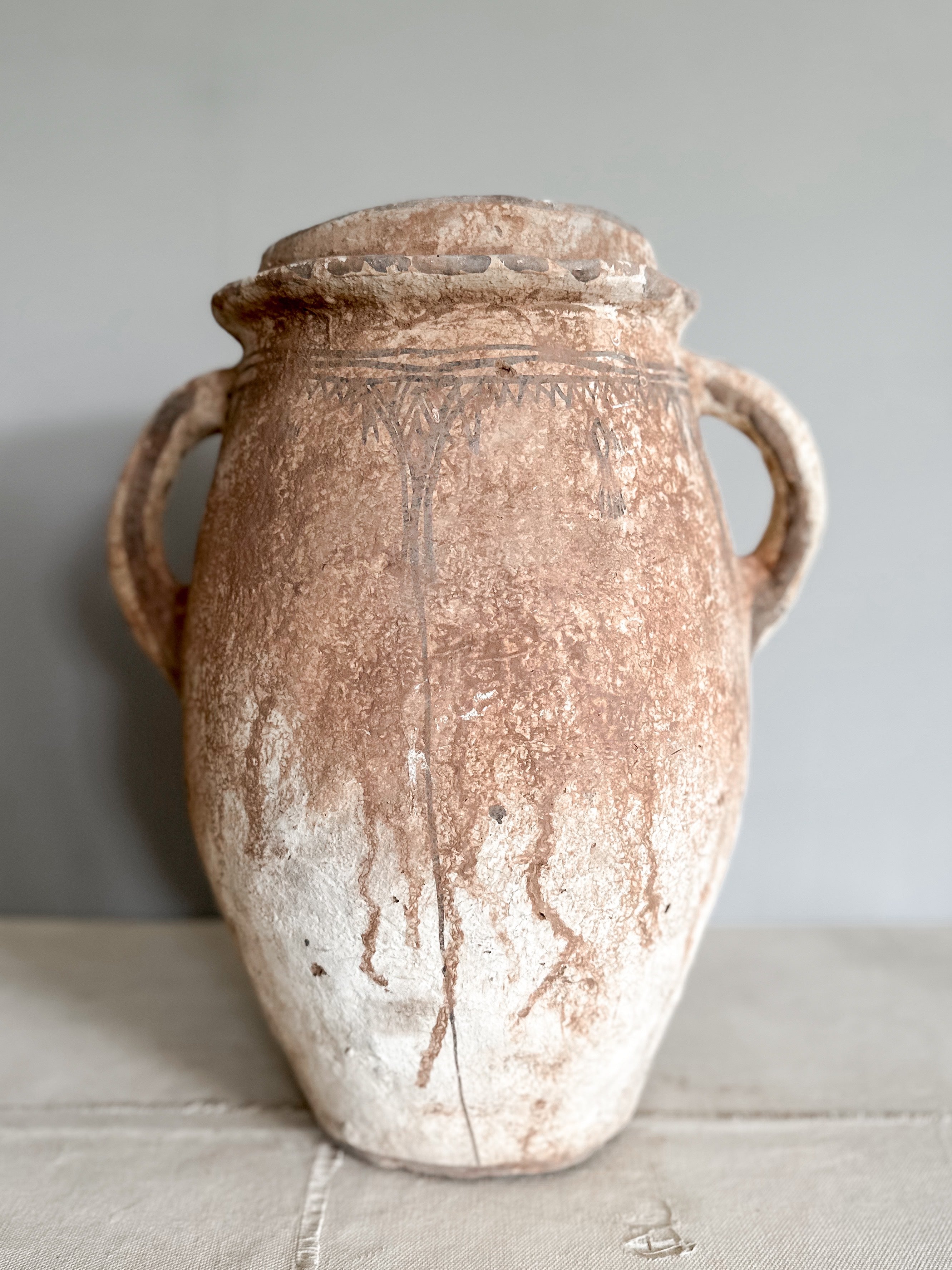 Diese Töpfe wurden von den wundervollen Frauen im Rif Gebirge im Norden Marokkos handgefertigt. Die Pottery wurde aus lokalem Ton hergestellt und auf offenem Feuer gebrannt. Die geometrischen Muster wurden sorgfältig von Hand bemalt und waren stets einzigartig inspiriert von alter Felsenmalerei.