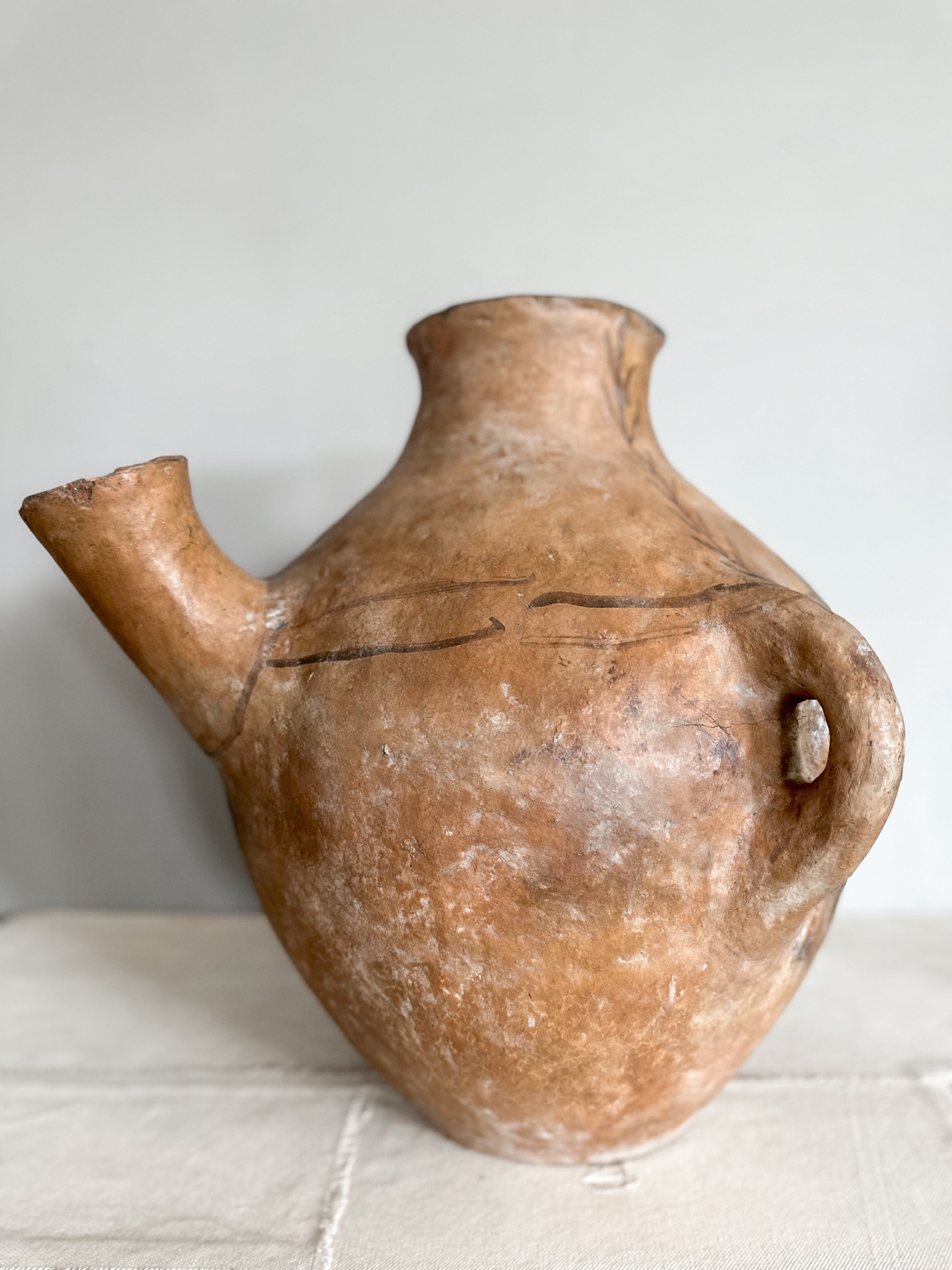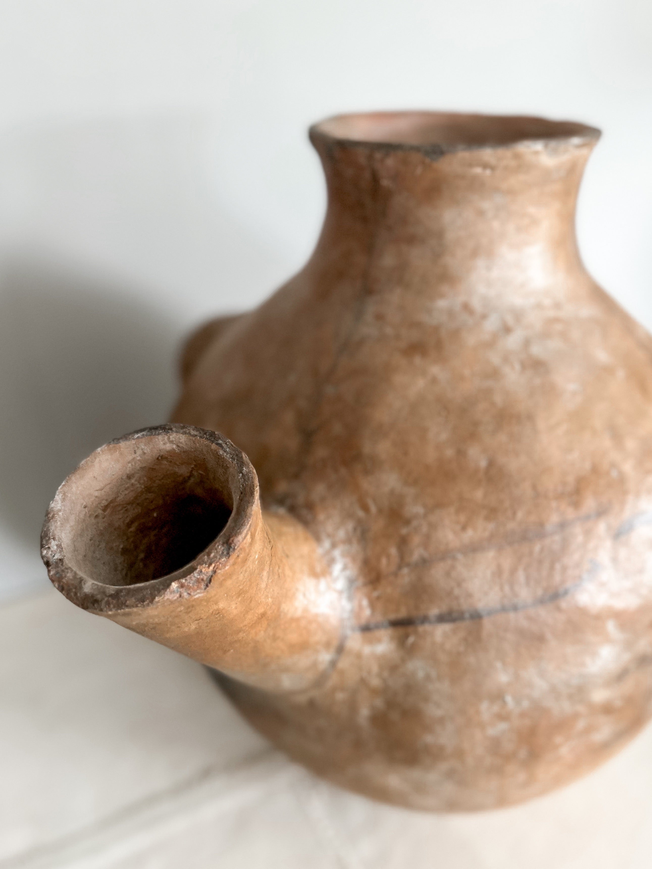 Dieser außergewöhnliche pot verseur stammt aus dem Süden Marokkos und wurde traditionell zum Ausgießen von Wasser oder Öl verwendet. Seine charakteristische, kürbisartige Form (courge) diente nicht nur der Funktion, sondern verlieh ihm auch eine organische, skulpturale Ausstrahlung.