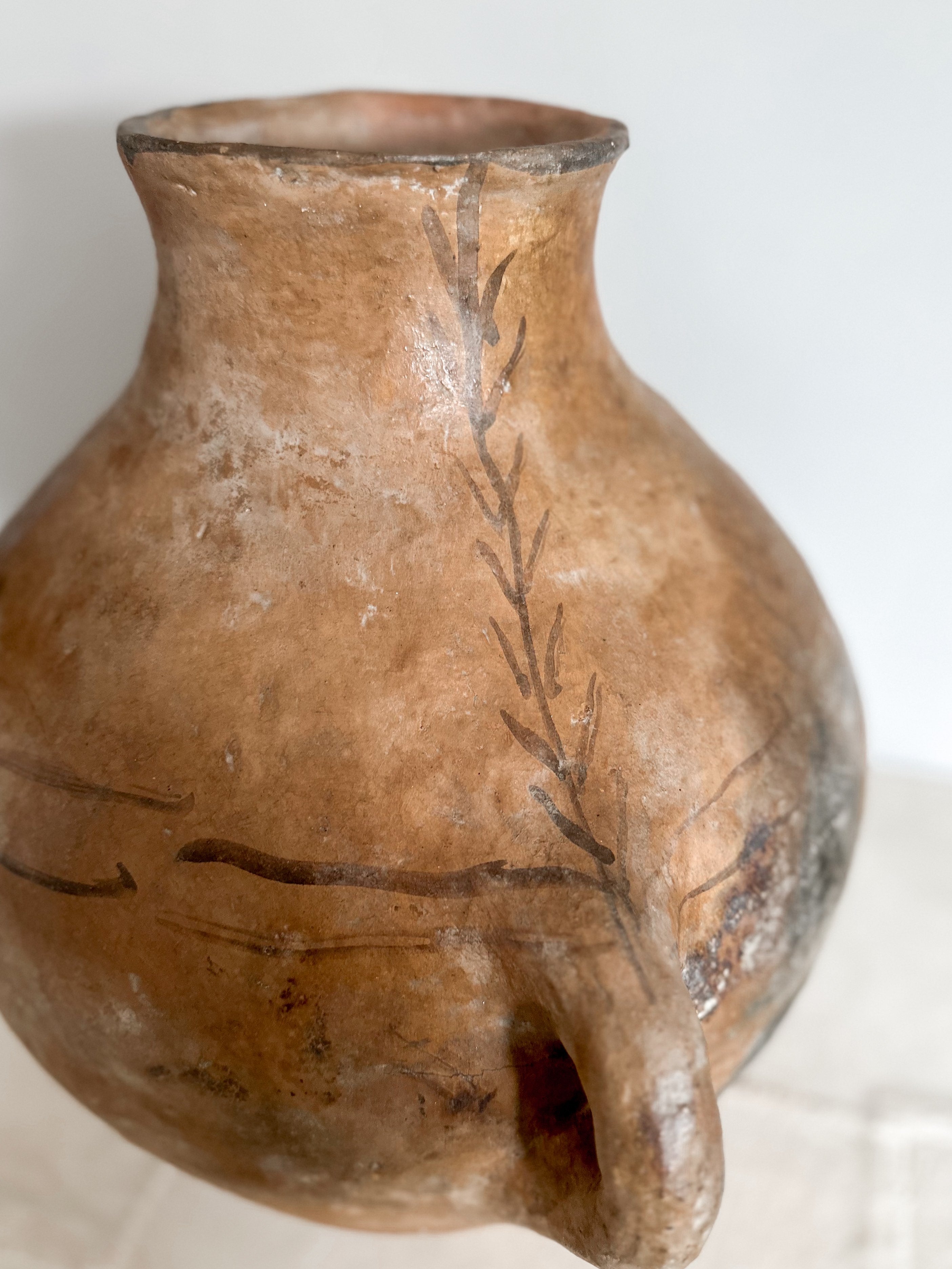 Der seitliche Ausguss, der markante Henkel und das zart handgemalte Dekor sind typische Merkmale der Berber Töpfertradition. Jeder Pinselstrich, jede Unregelmäßigkeit erzählt von gelebtem Alltag und stillem Handwerk.