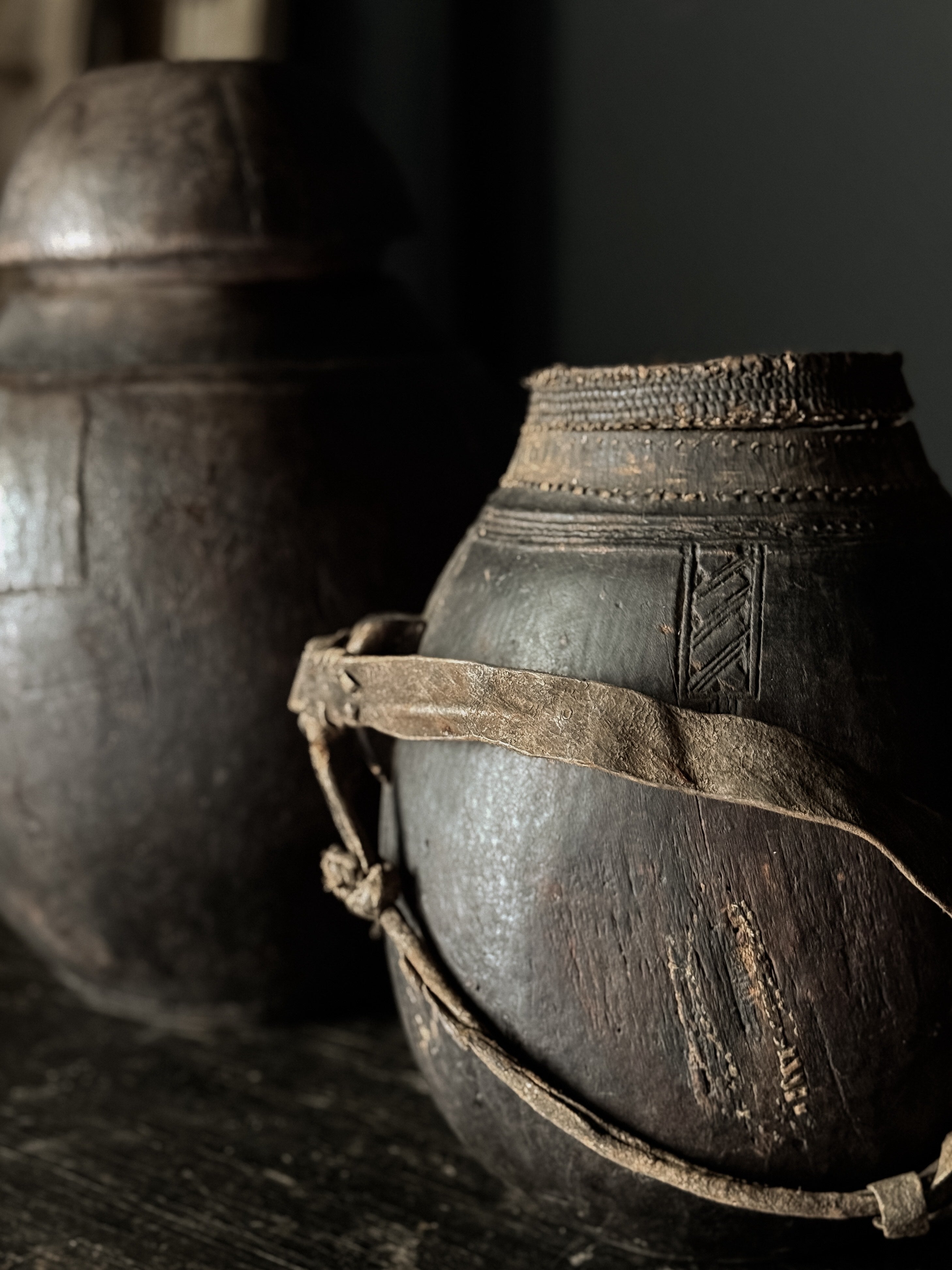 Mit der Zeit haben sie eine tiefe, erdige Patina entwickelt, die Spuren von Gebrauch und Leben trägt – jedes Stück ein authentisches Zeugnis ursprünglicher Handwerkskunst.