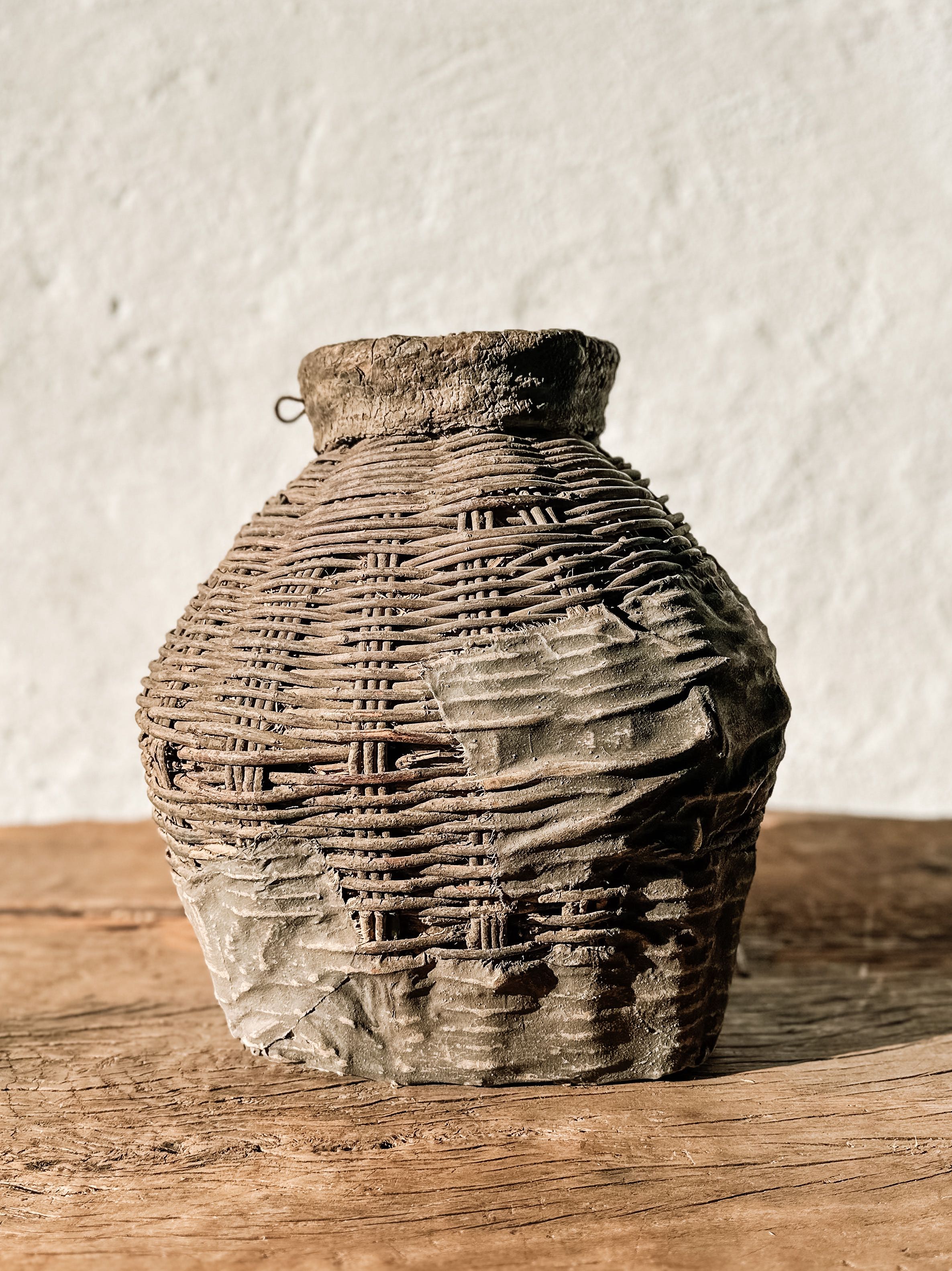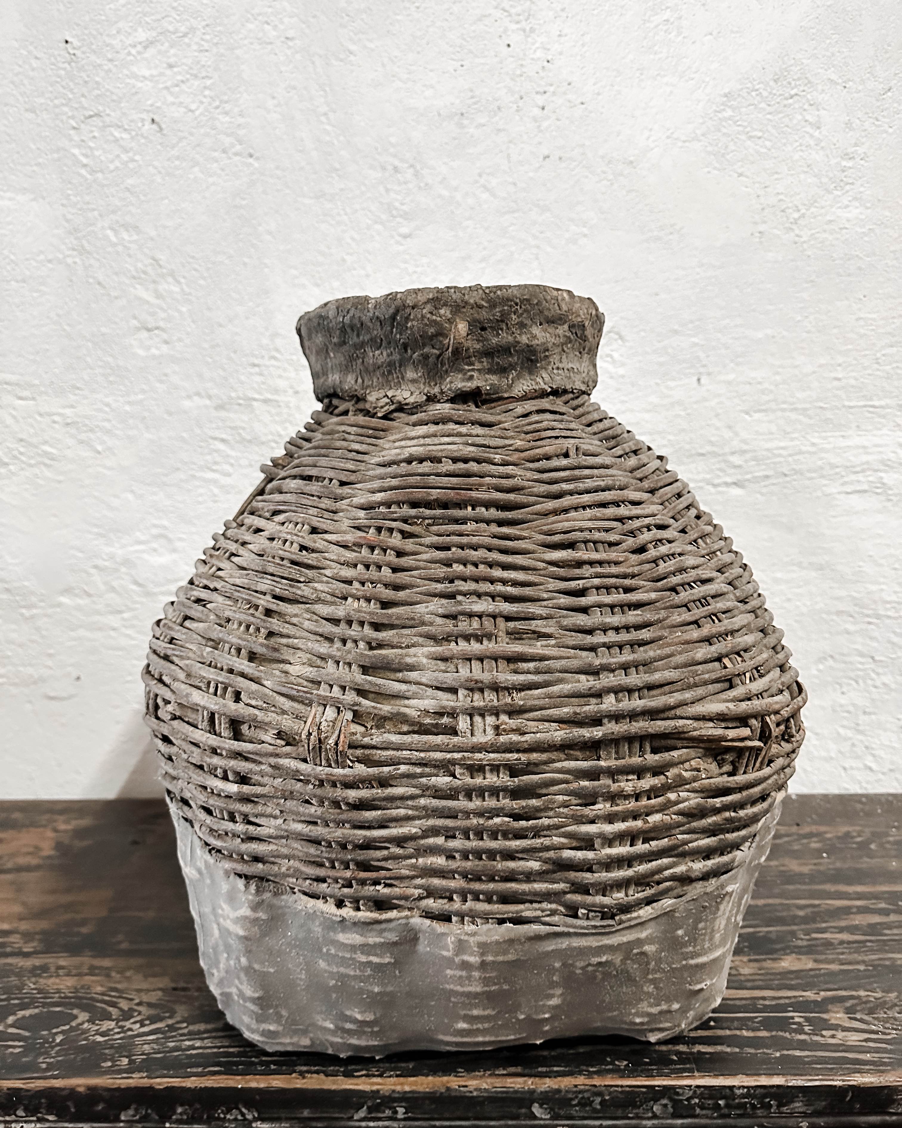 Die Körbe wurden früher in China verwendet, um Essig oder Öl zu lagern, wahrscheinlich für Lampen. Eine aufgetragene Lehm- bzw. Lederpaste schützte die Körbe vor Wasser. Im Laufe der Zeit ist die Paste gerissen, und eine einzigartige Patina ist auf der Oberfläche entstanden.